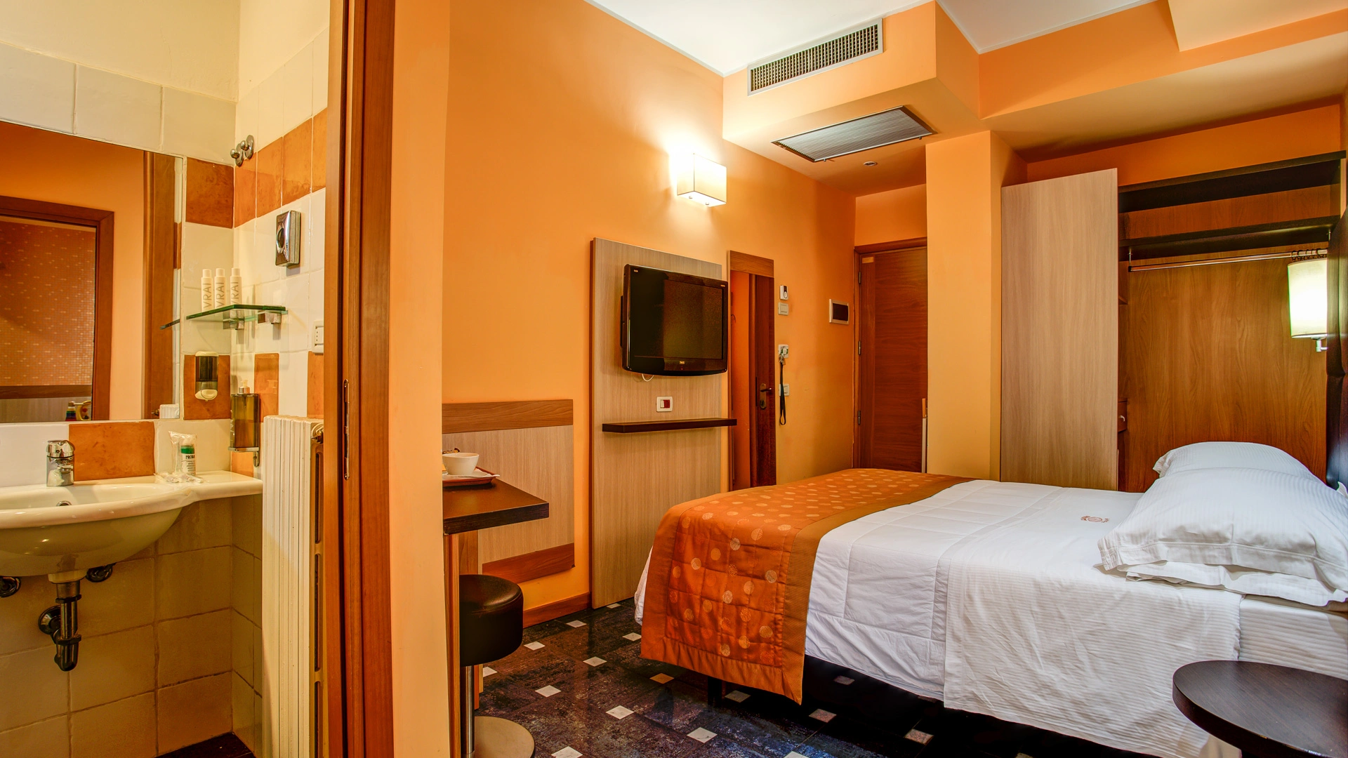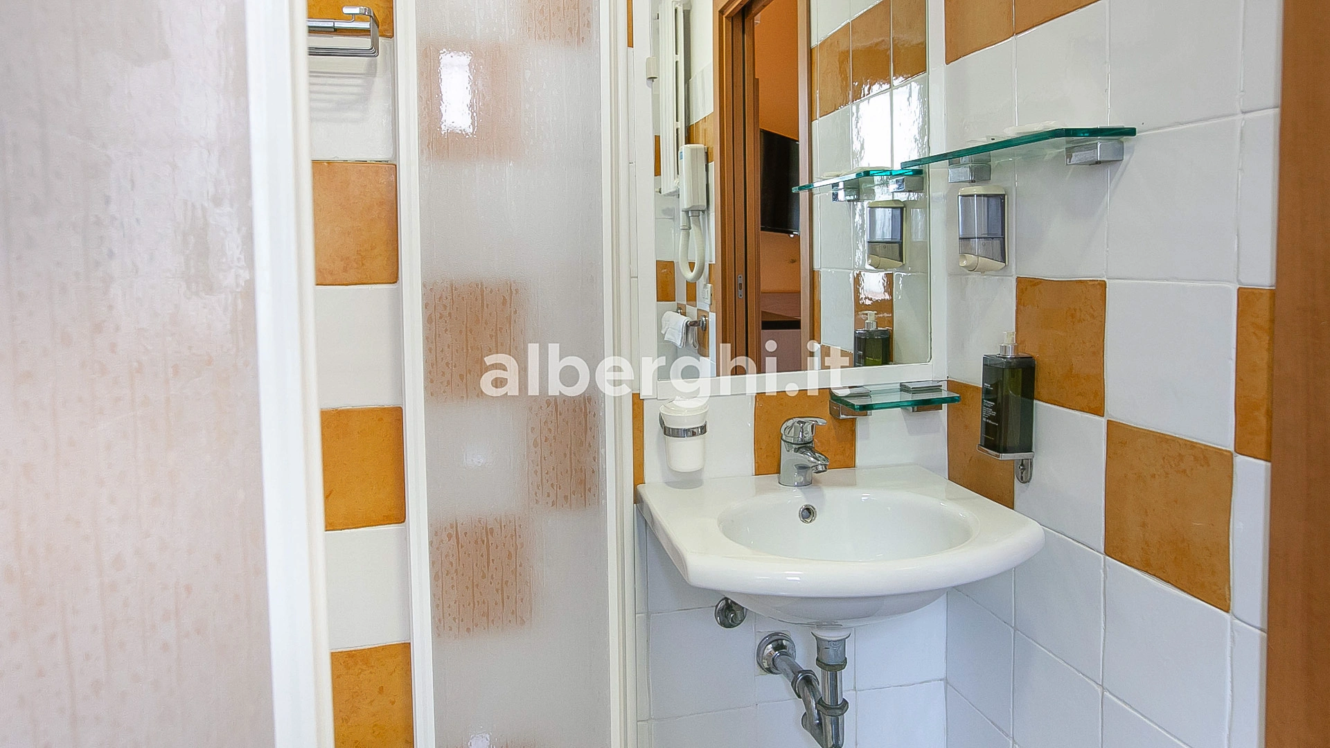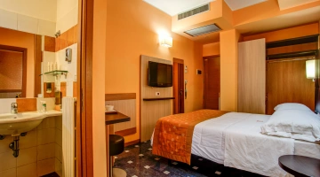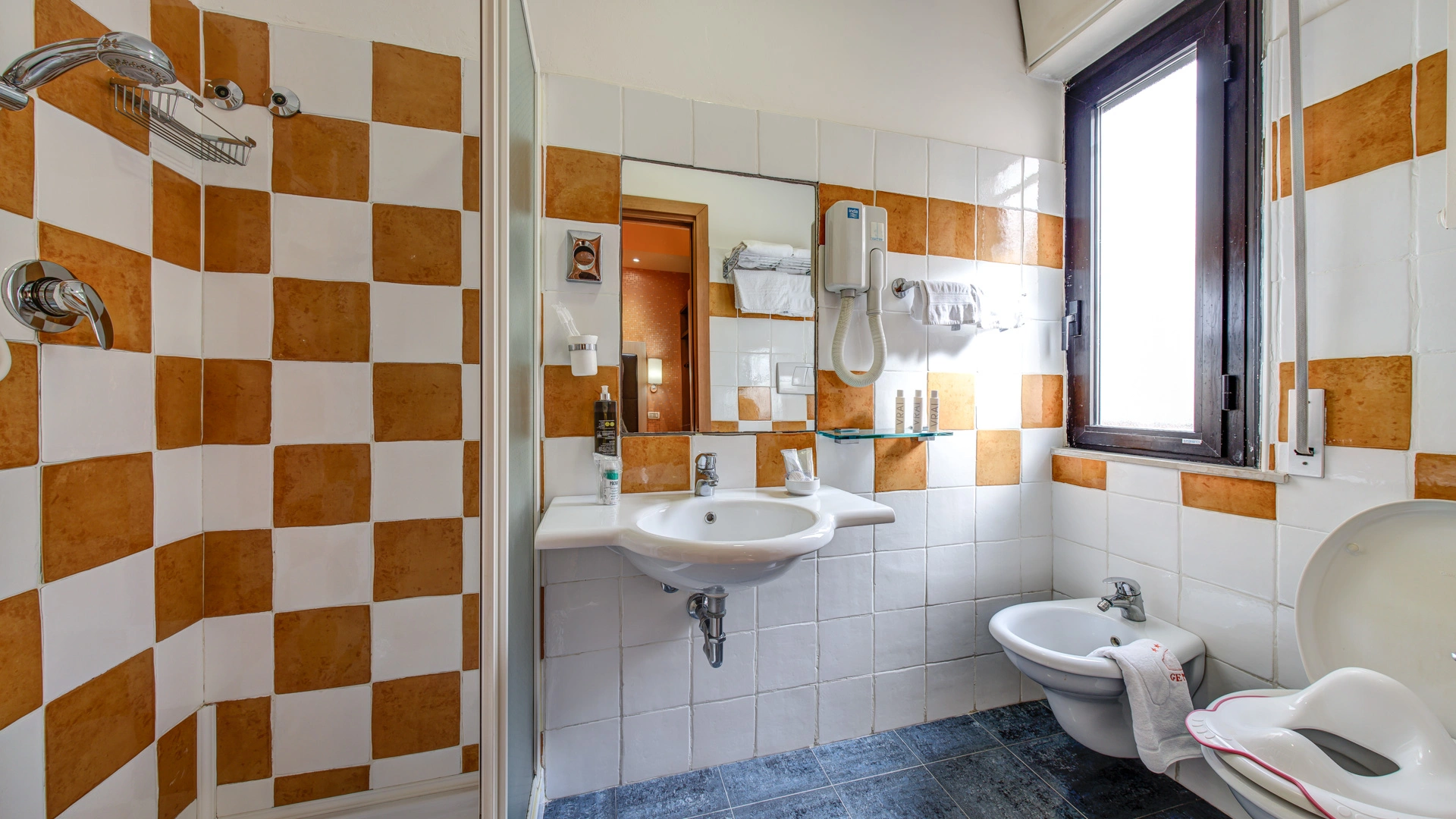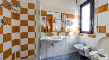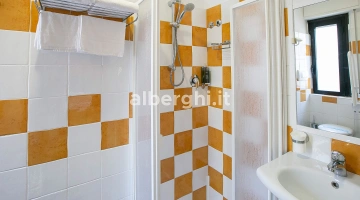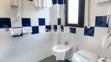 SERVIZI PER DISABILI: ingresso con rampa inclinata, ascensore a norma, camera con spazio di manovra per sedia a rotelle, doccia accessibile in sedia, sedia per doccia.