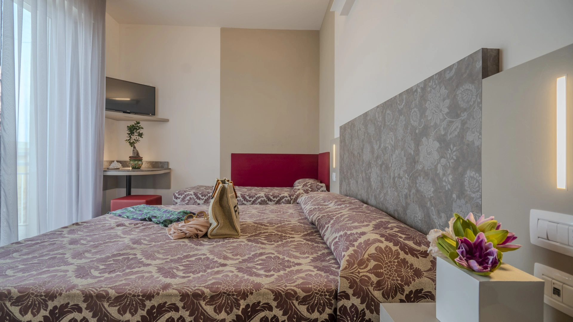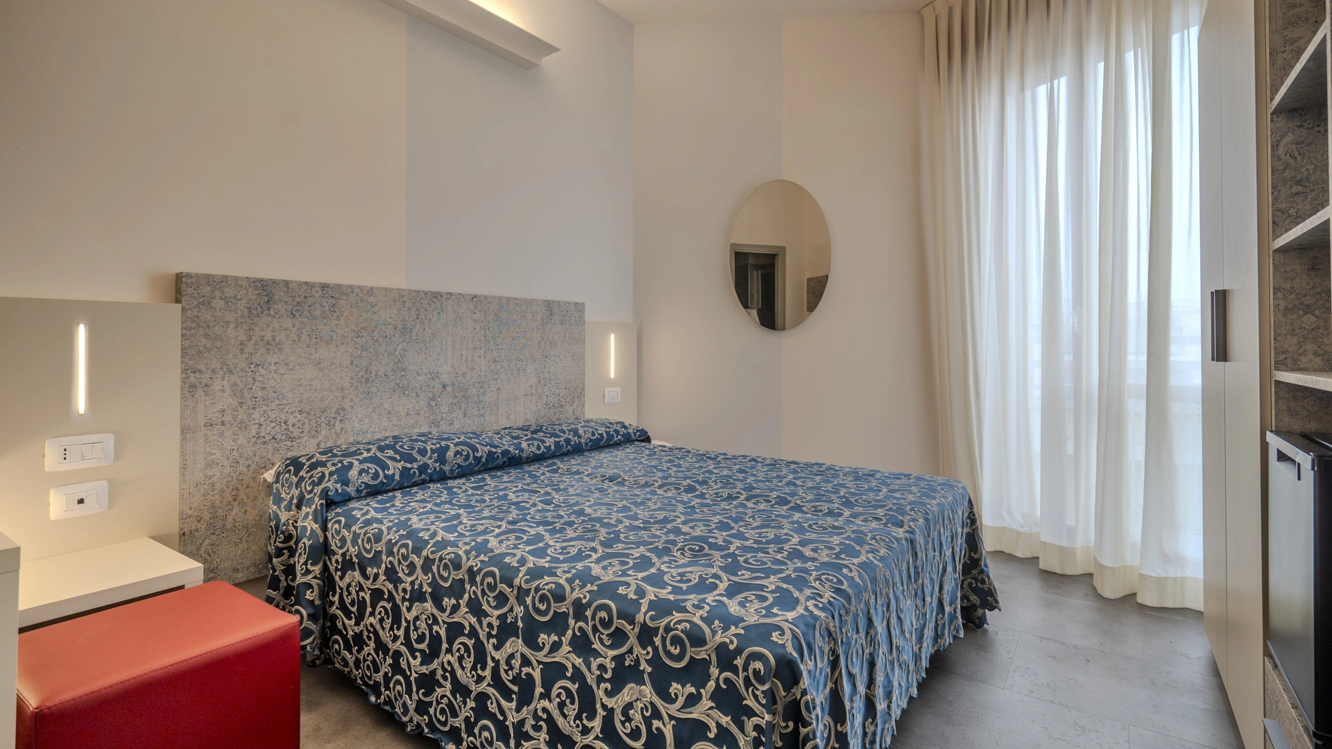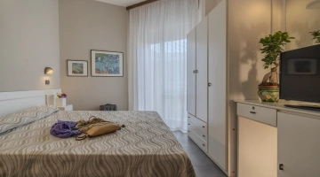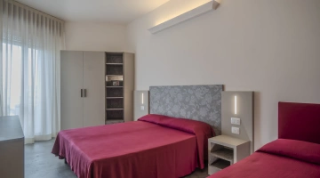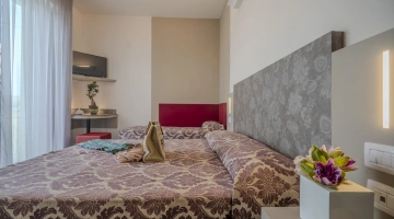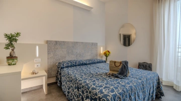 COMFORT PLUS: situate al terzo e quarto piano possono essere matrimoniali, triple, quadruple oppure comunicanti family (composte da due camere, due bagni, due balconi). Per l'estate 2023 le camere sono state completamente rinnovate negli arredi e possono offrire vista mare laterale. Ai servizi base si aggiungono: frigobar, borsa mare in omaggio.