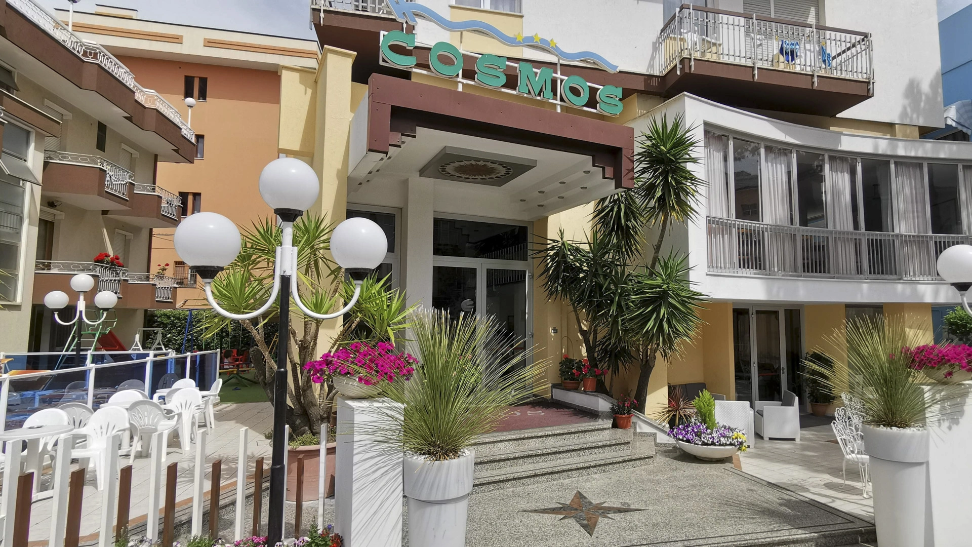 L’Hotel Cosmos, tre stelle di Rivazzurra di Rimini, è una struttura a gestione familiare. Dispone di una grande piscina, parco giochi e solarium. Ammette animali domestici di piccola taglia.