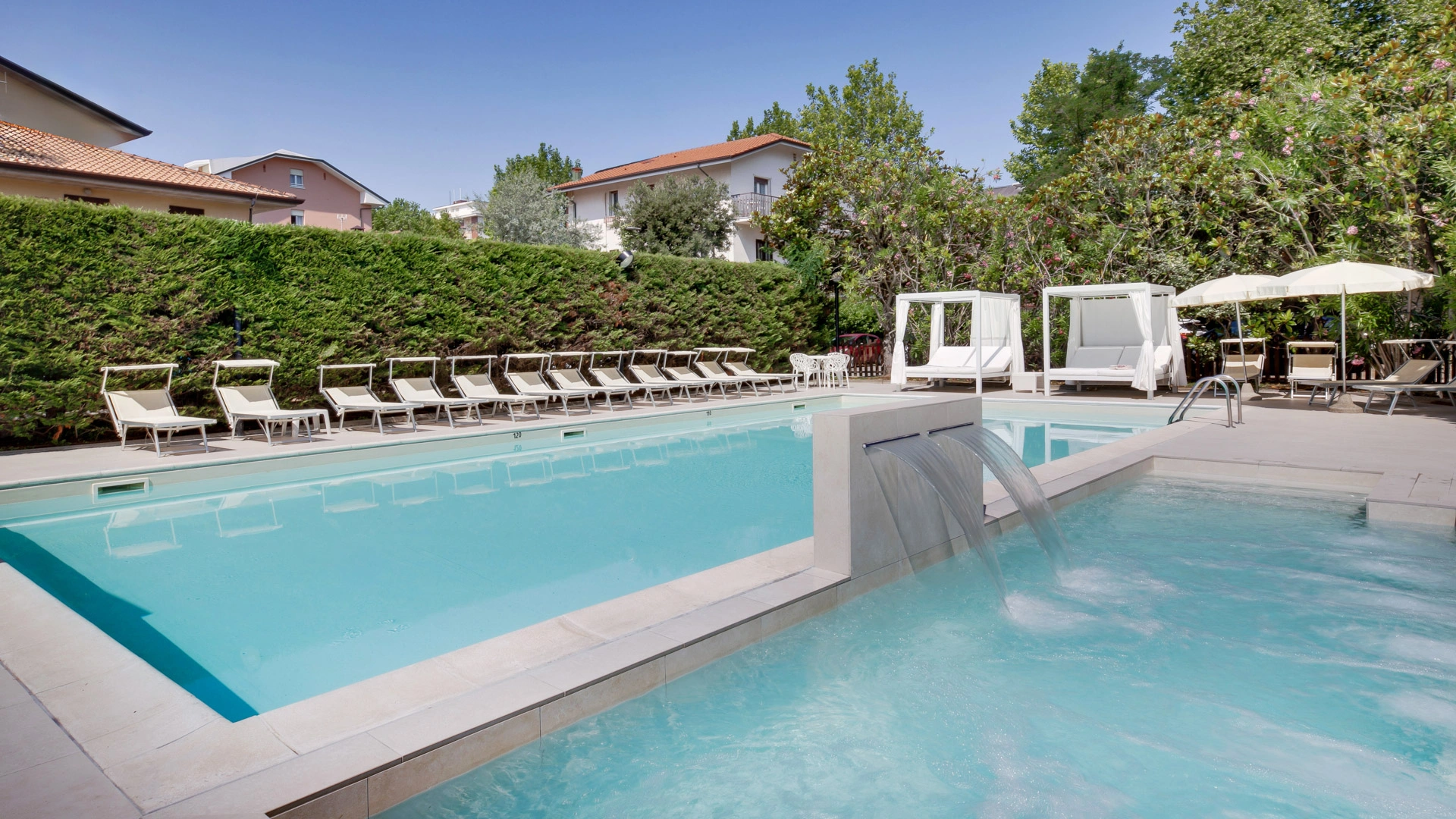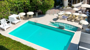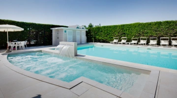 La piscina si trova in giardino, circondata da lettini e ombrelloni. Ampia 98 mq e profonda da 120 a 130 cm, è riscaldata e dotata di idromassaggio. A disposizione degli ospiti il telo piscina.