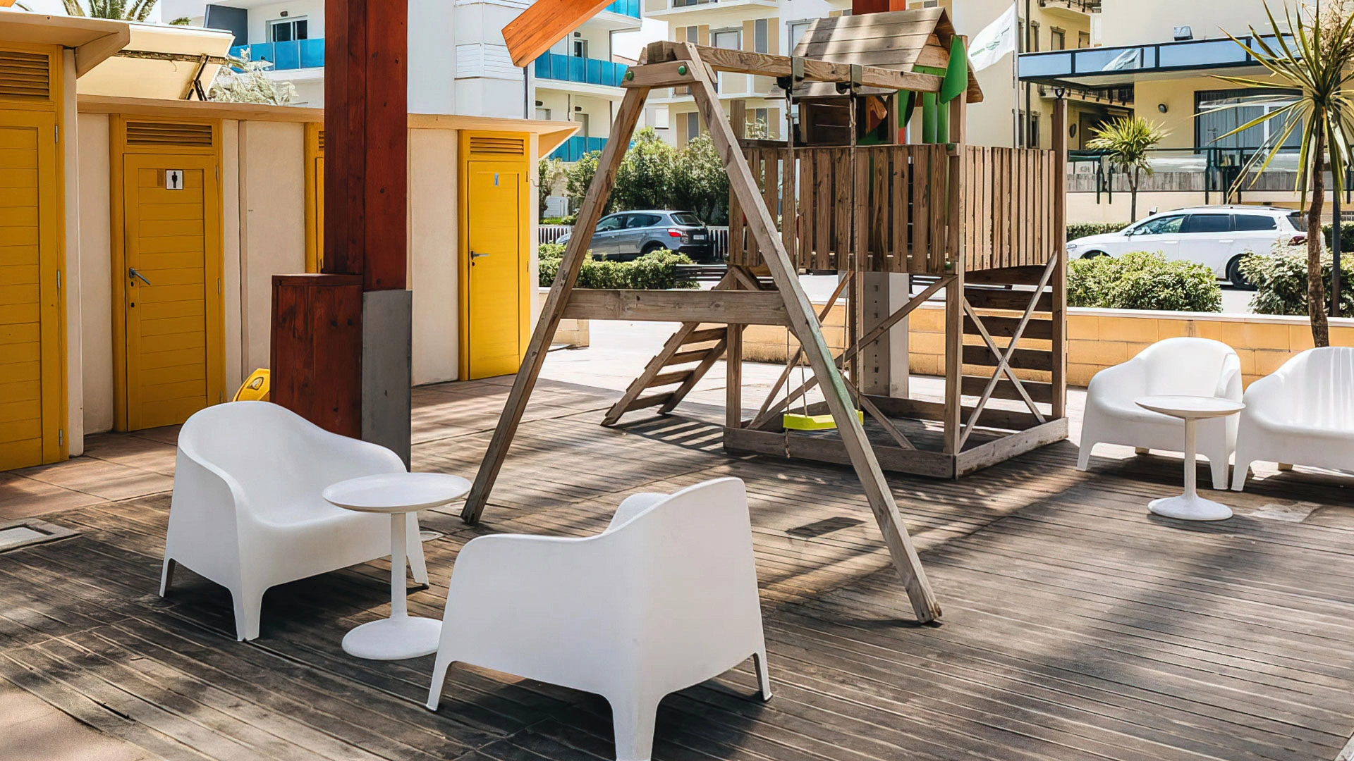 In the internal courtyard of the hotel there is an outdoor swimming pool with a shallow water area and water jet accessible to all ages. The surrounding area is furnished with deckchairs, tables and chairs.