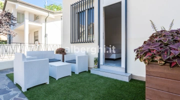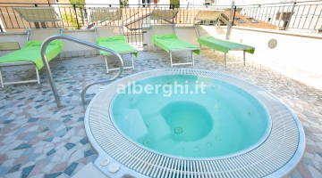 Panoramic terrace with 2 hot tubs and solarium, garden area, open-air porch, lift, free bicycles, weekly welcome drink, luggage storage, reading room, possibility of beach towel.