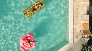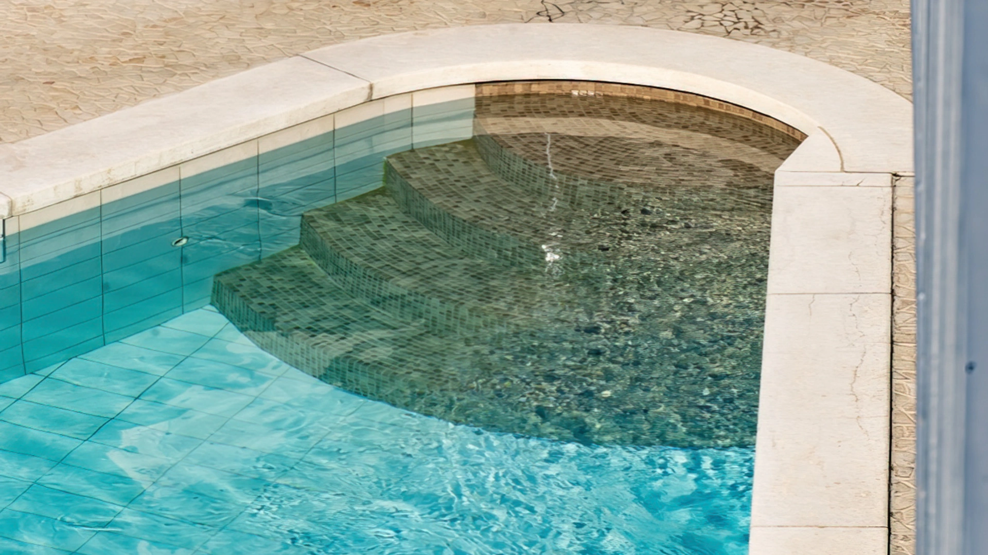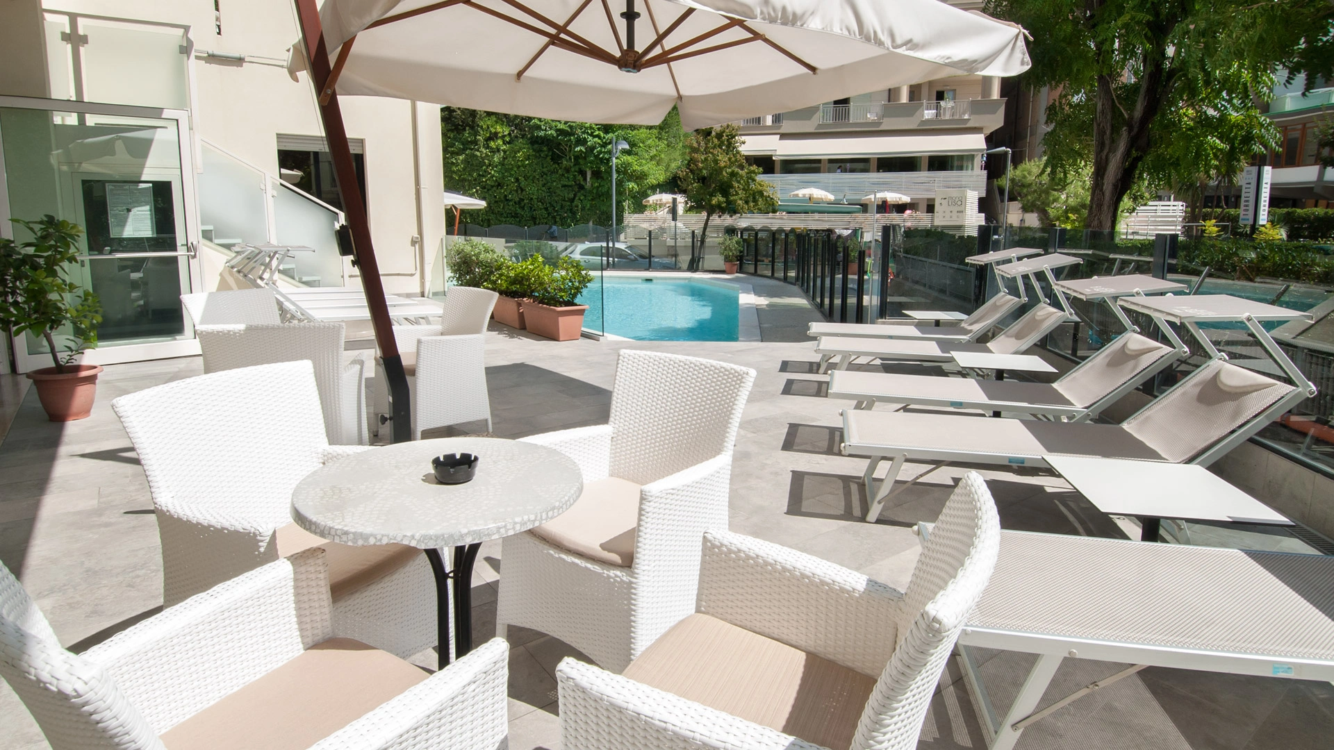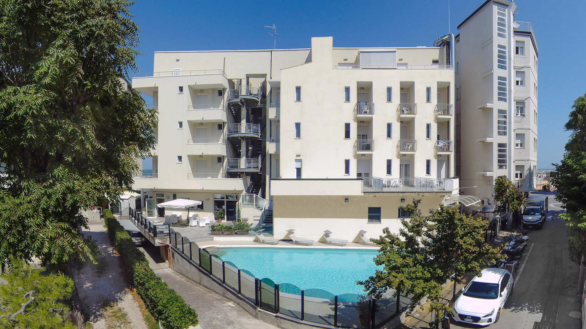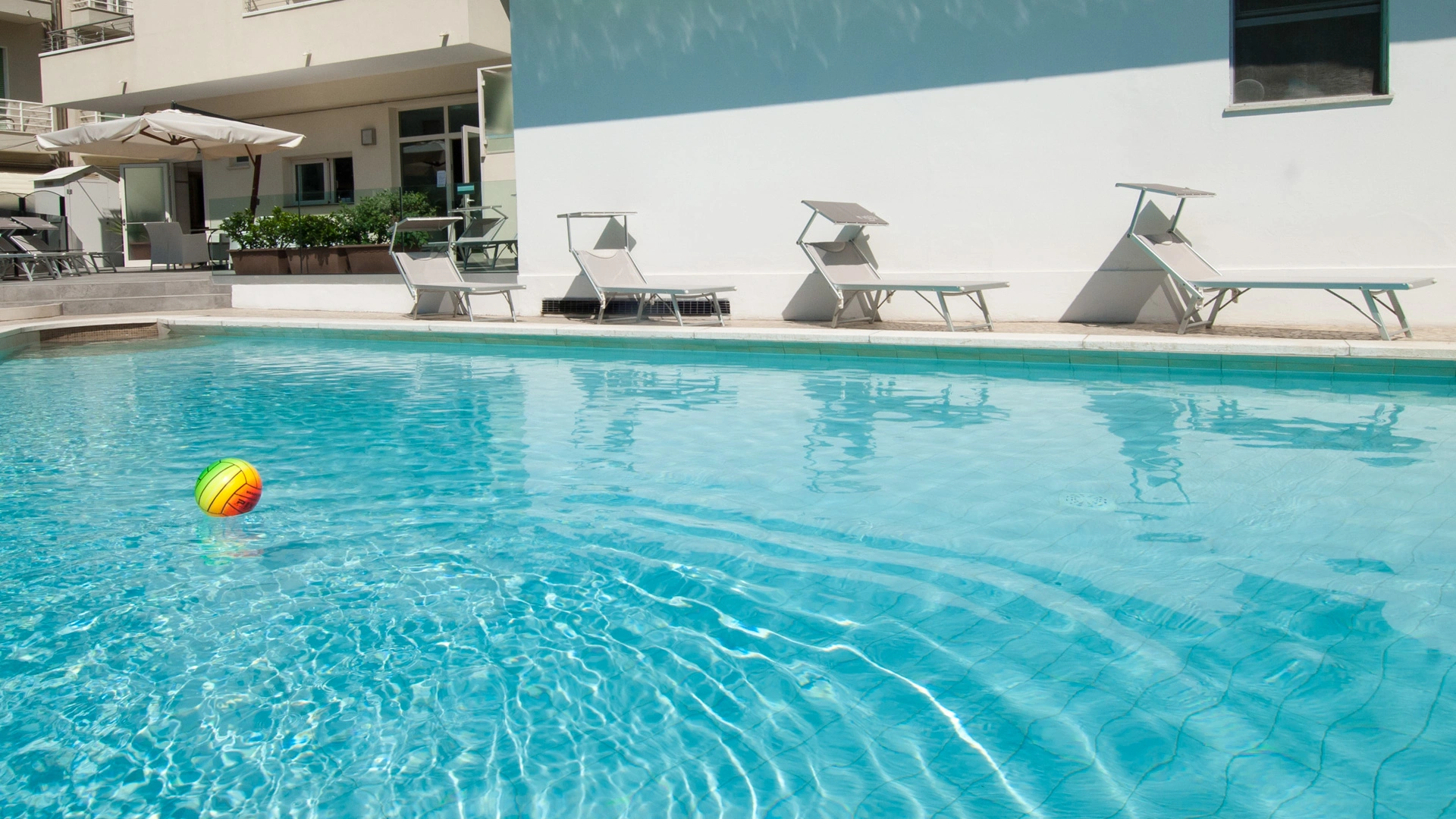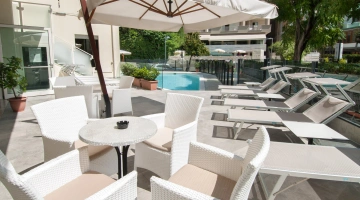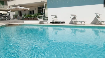 In the outdoor area there is a swimming pool equipped with hydromassage jet and a small solarium area with beach umbrella, sunbeds and tables.