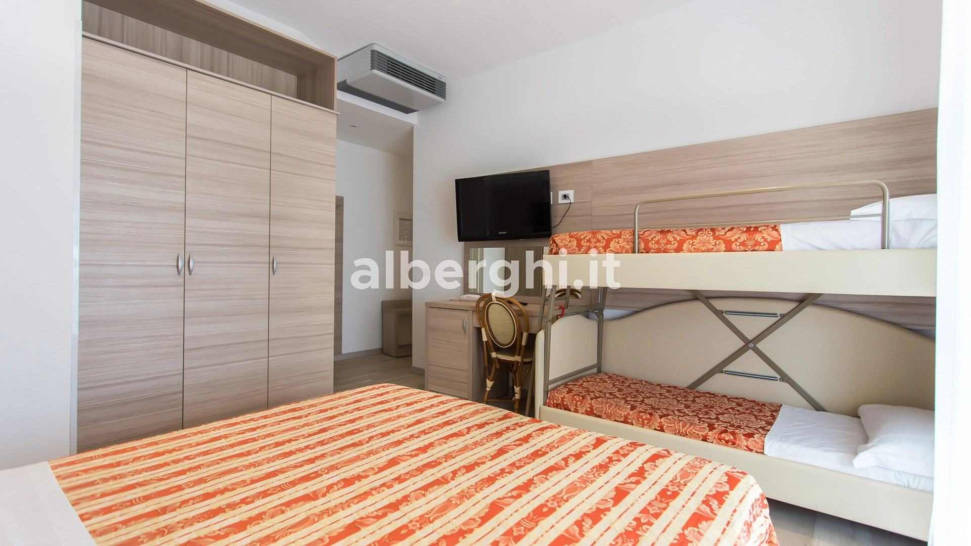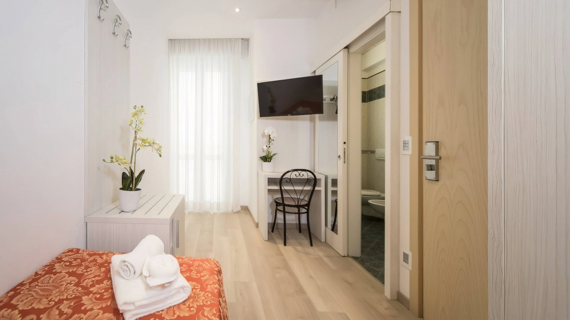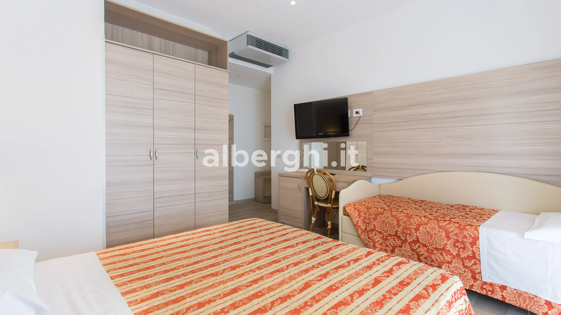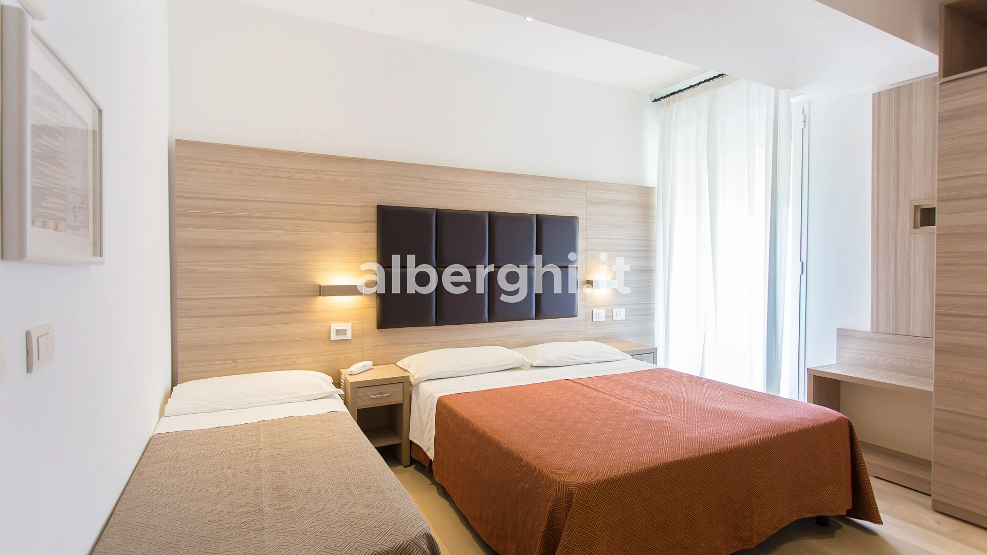 The rooms are equipped with balcony, air conditioning, Smart TV sat, minibar not stocked, Wi-Fi connection fiber 100 Mbit/s, safe, direct telephone, bathroom with shower box and hairdryer. It is possible to request rooms with sea view.