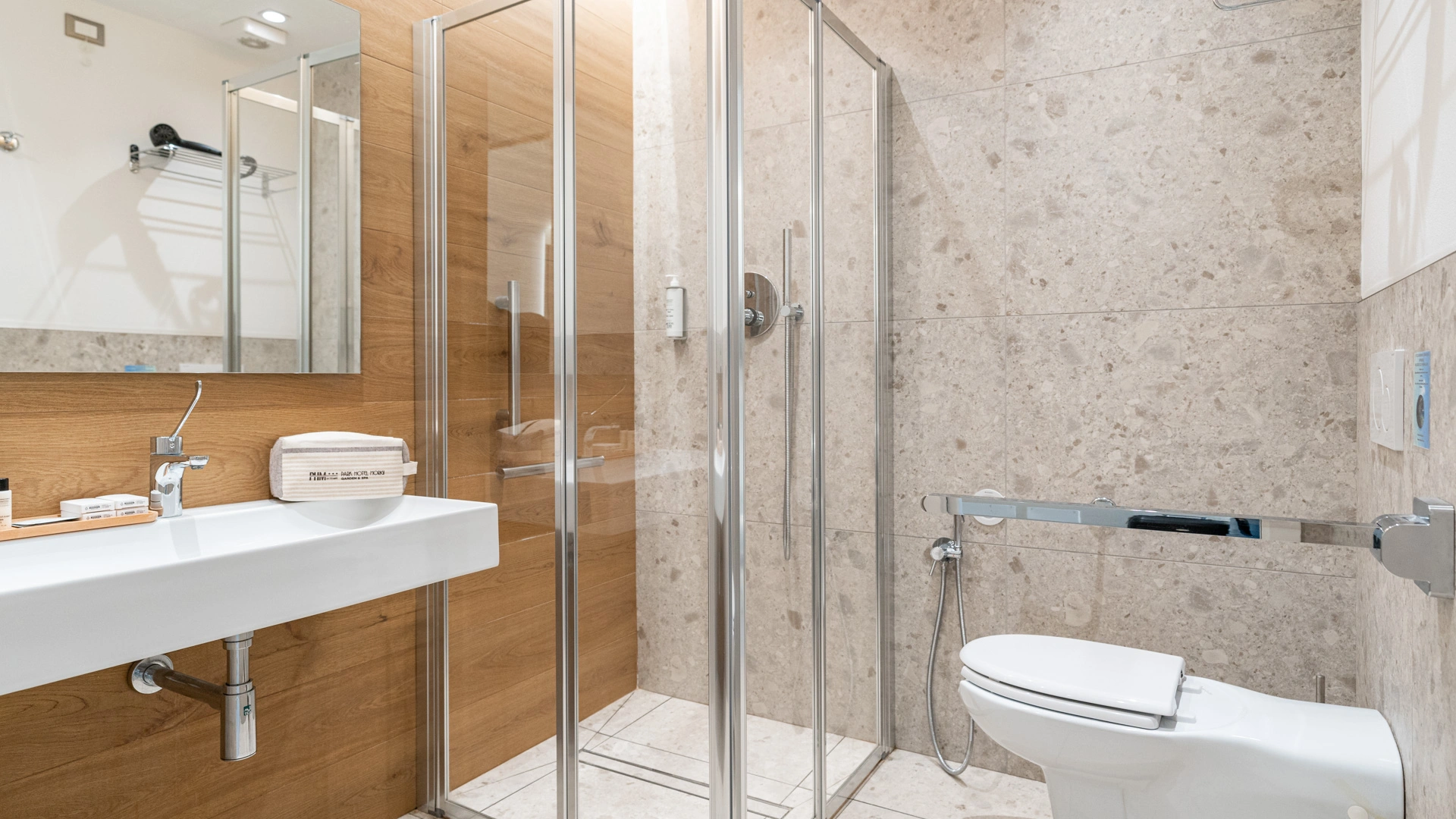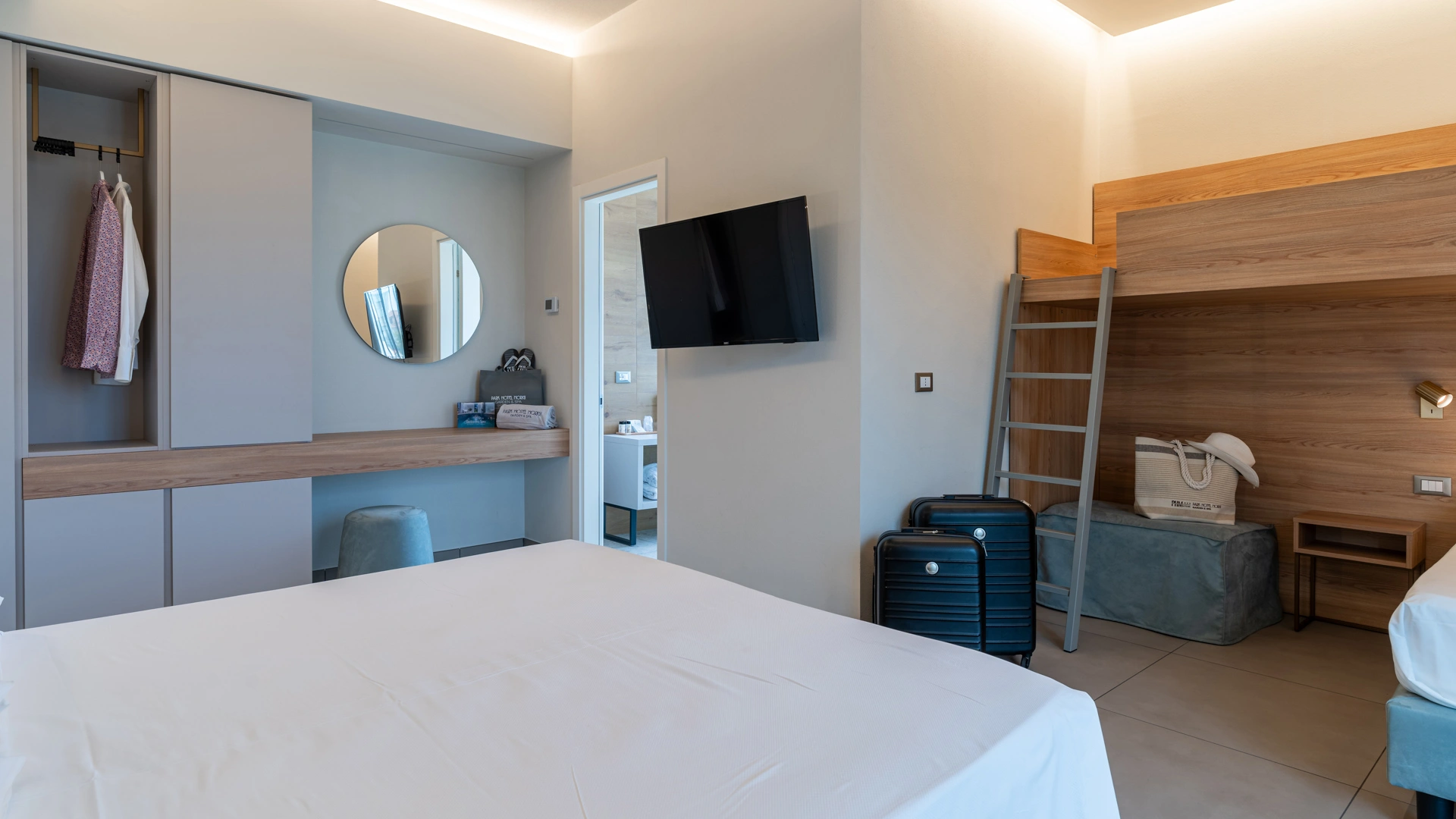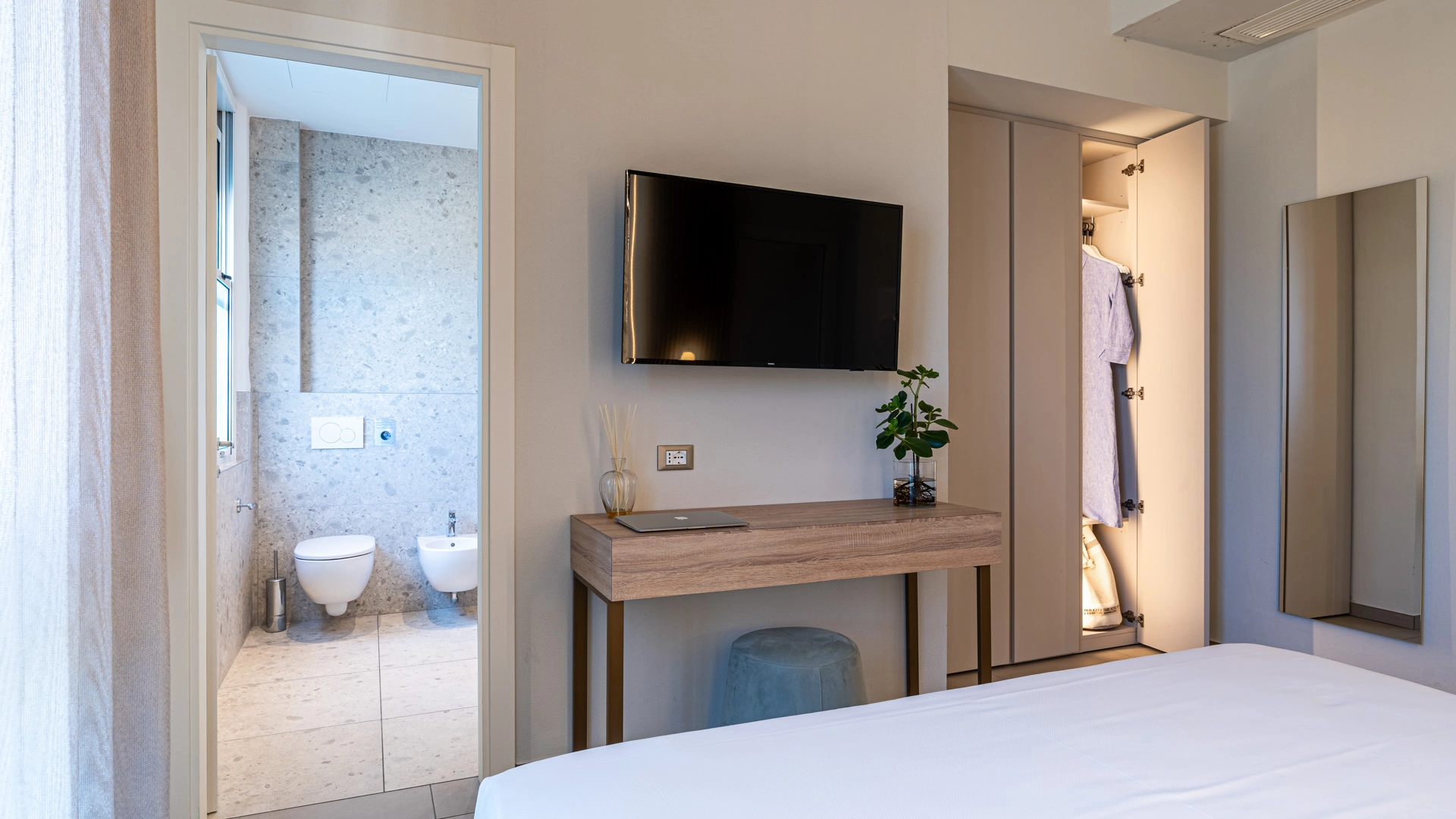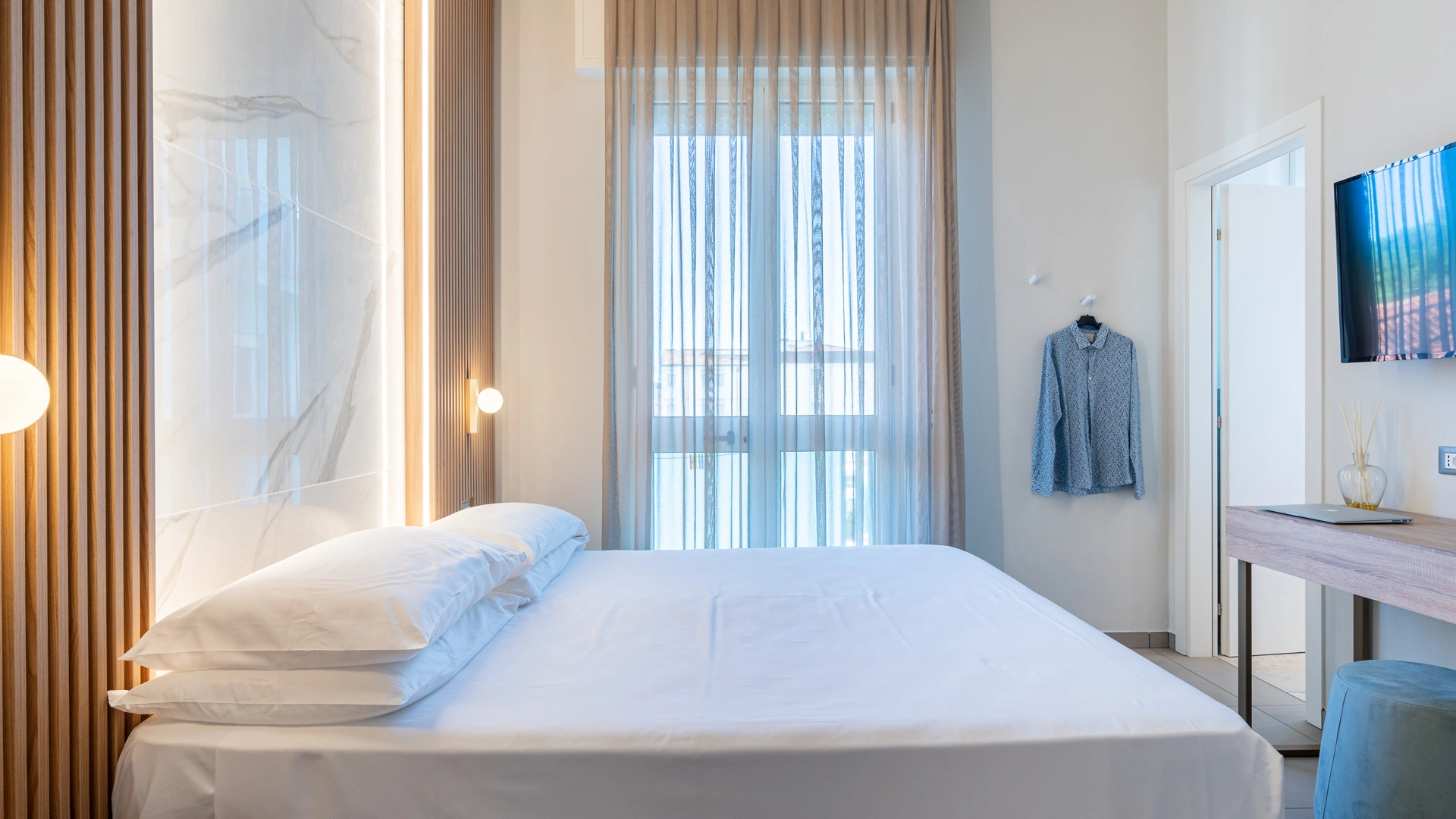 JUNIOR SUITE: 35 m2 rooms equipped with a large terrace, 2 satellite TVs, favorite newspaper every morning, parking space in a reserved car park and afternoon cleaning of the room.
