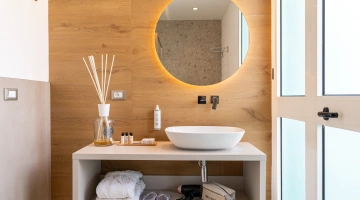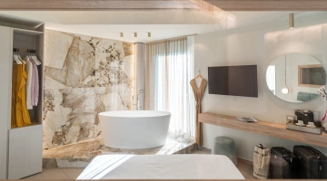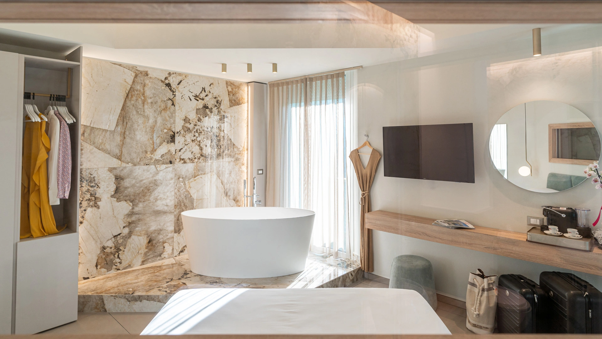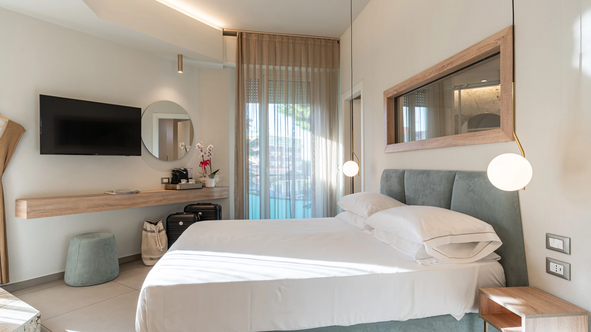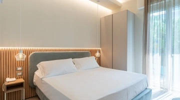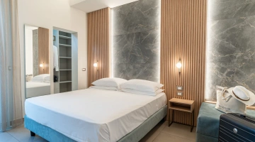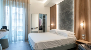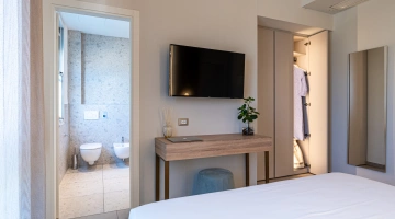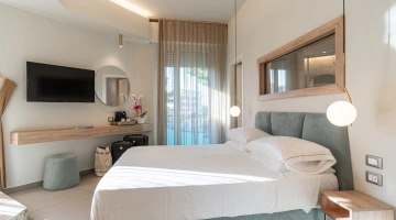 ROMANTIC SUITE: suite overlooking the main street, characterized by an intimate atmosphere and equipped with a canopy bed, sitting room, large terrace with sun loungers, two LCD TVs, private and covered parking.