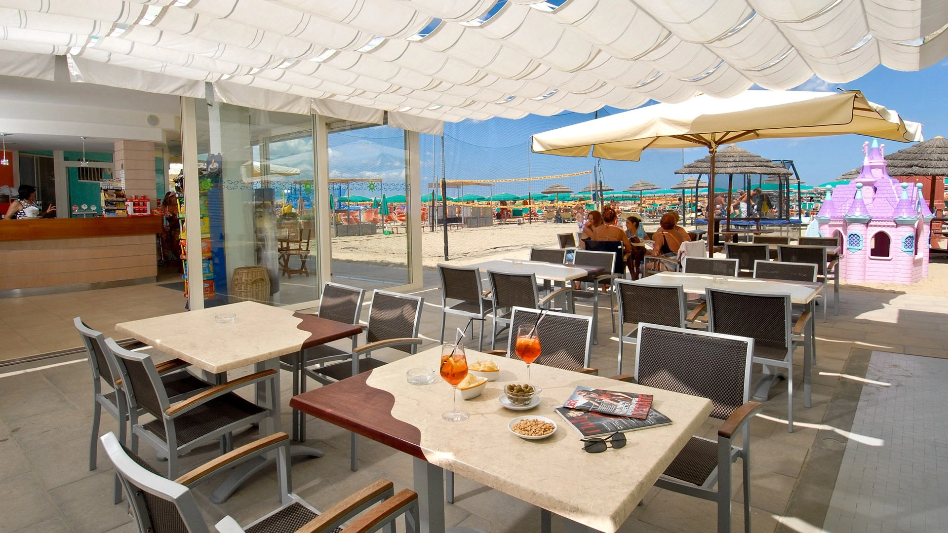 On the beach: playground area, entertainment.