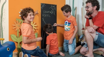 In the hotel: outdoor playground area, strollers, bicycle seat, babysitting service, afternoon snack.