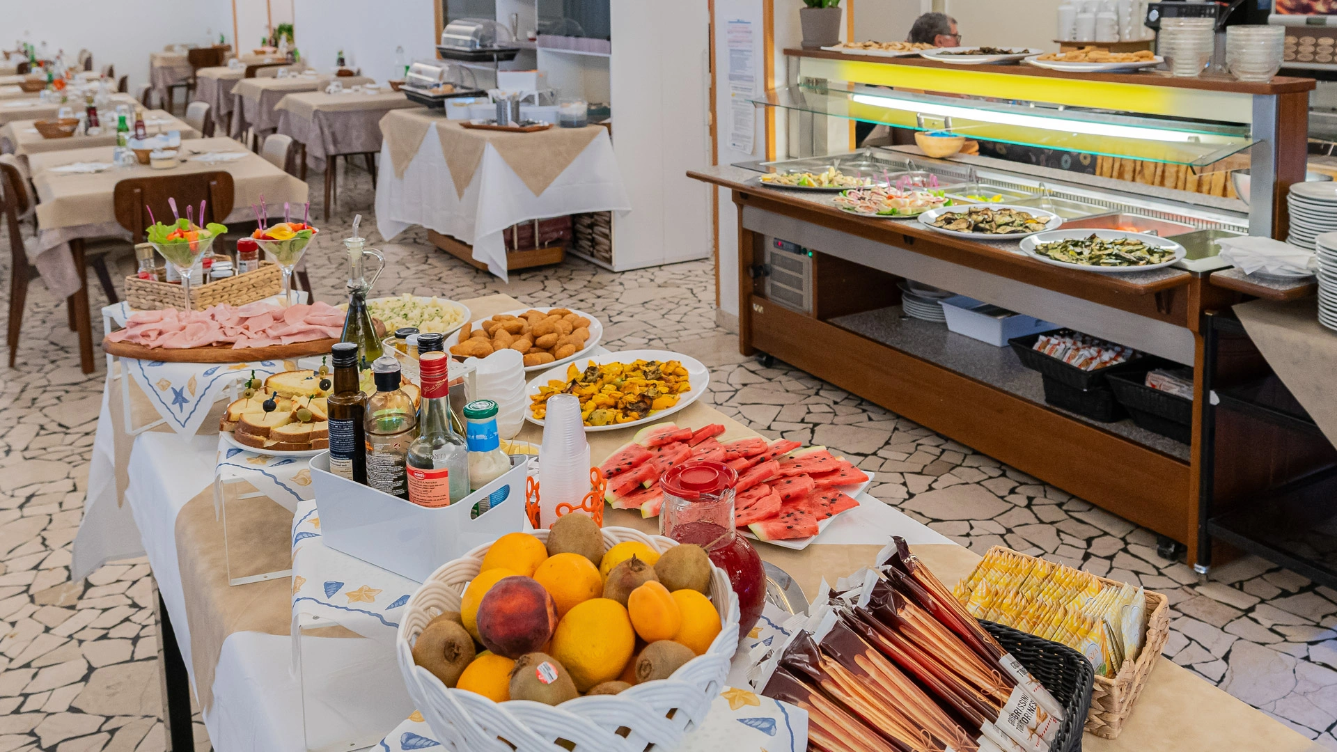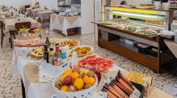 BREAKFAST: buffet with sweet and savoury dishes such as croissants, yoghurt, honey, chocolate, fruit juices, coffee, cappuccinos, jams, cheeses, mixed cold cuts and eggs (on request).