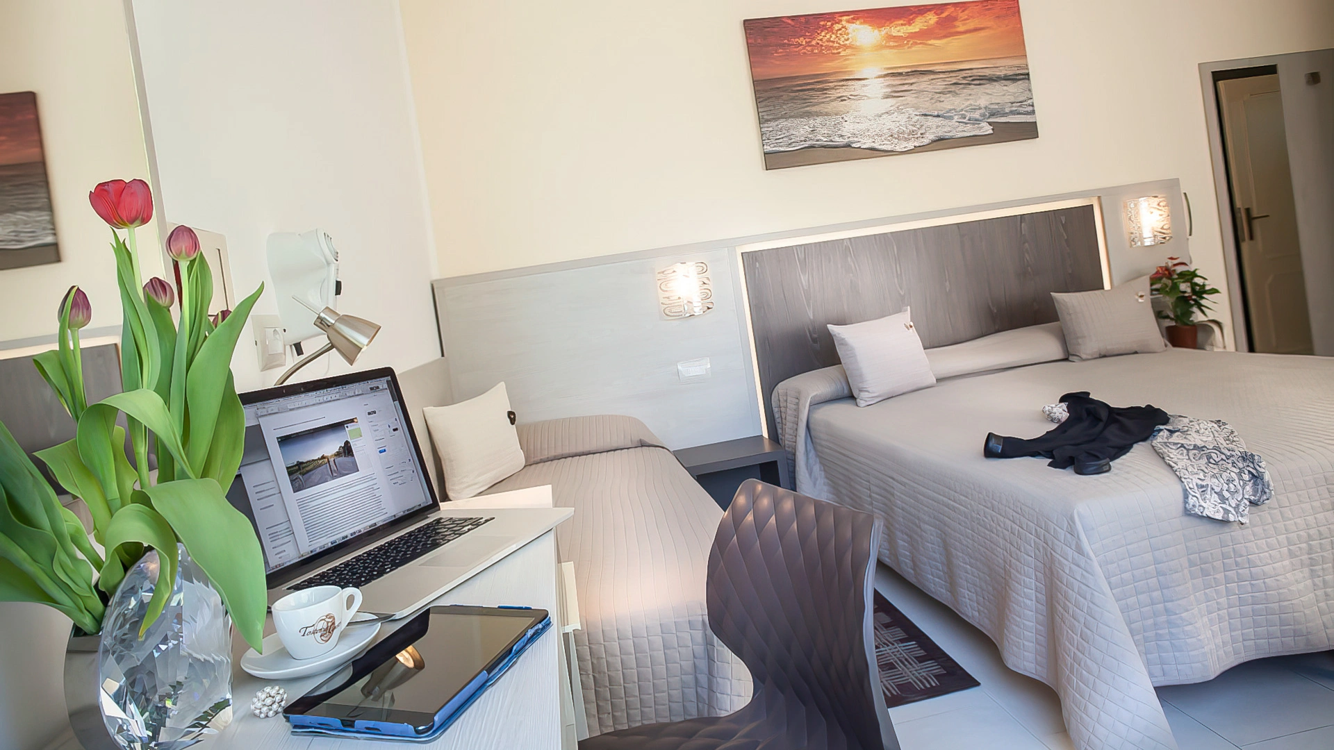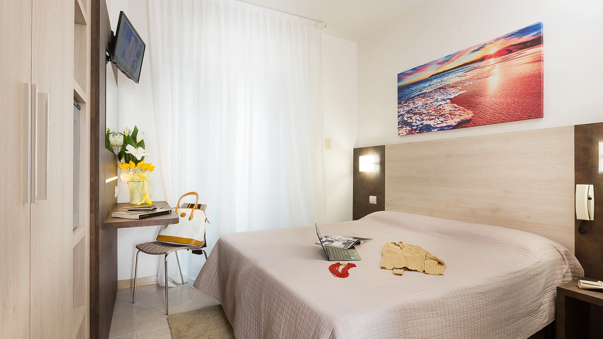 The rooms are equipped with a balcony, air conditioning, 100 Mbit/s fiber Wi-Fi connection, TV with 8 Sky channels, safe, bathroom with shower and hairdryer. Some rooms have a sea view.