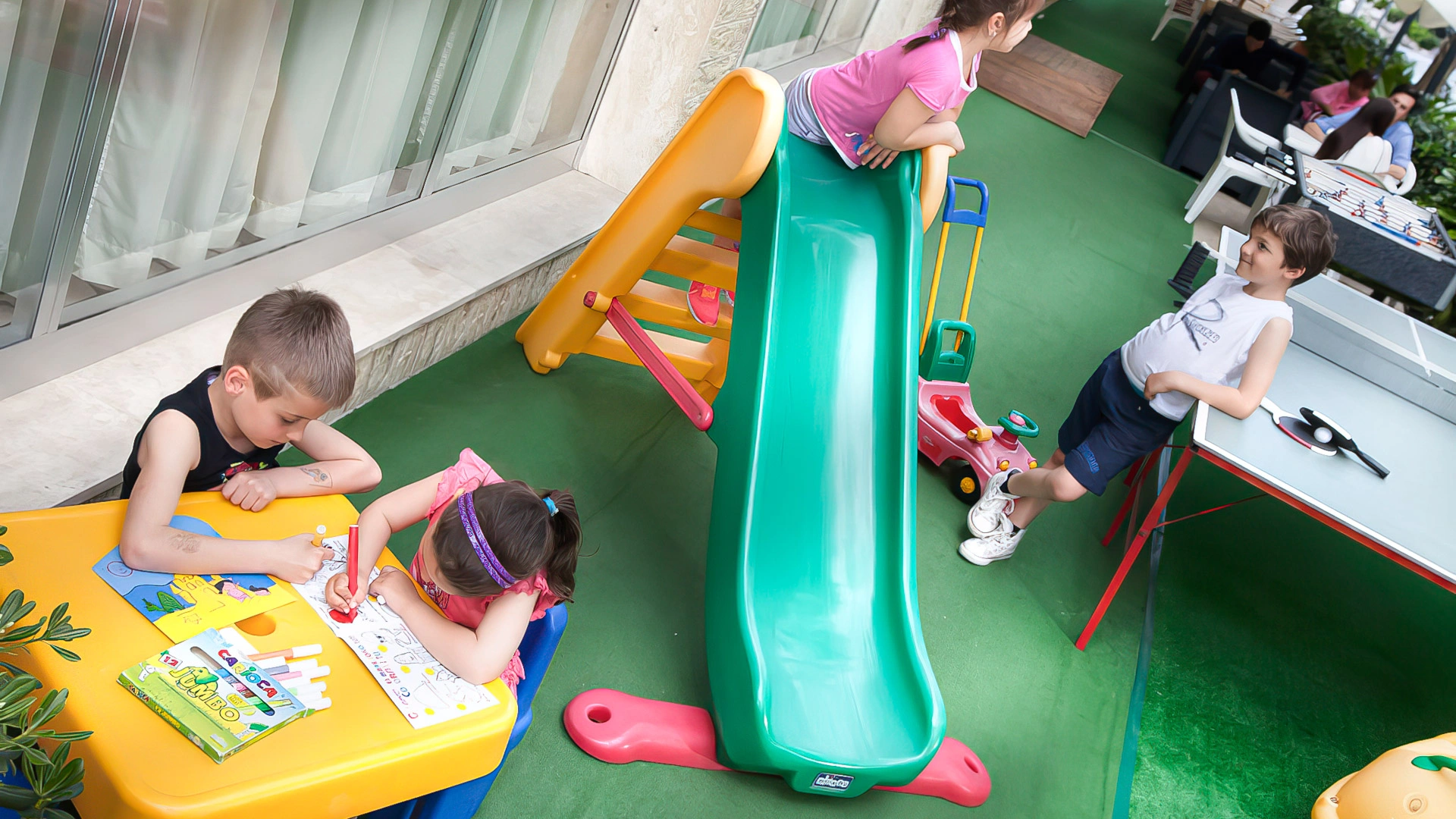 In the hotel: outdoor playground area with ping-pong and table football, play corner for the little ones, strollers, bicycle seats, entertainment one evening a week, evening show every week at the partner venue "Mito Latino". On request: pediatric consultation.