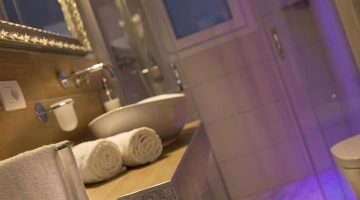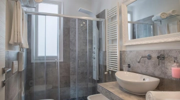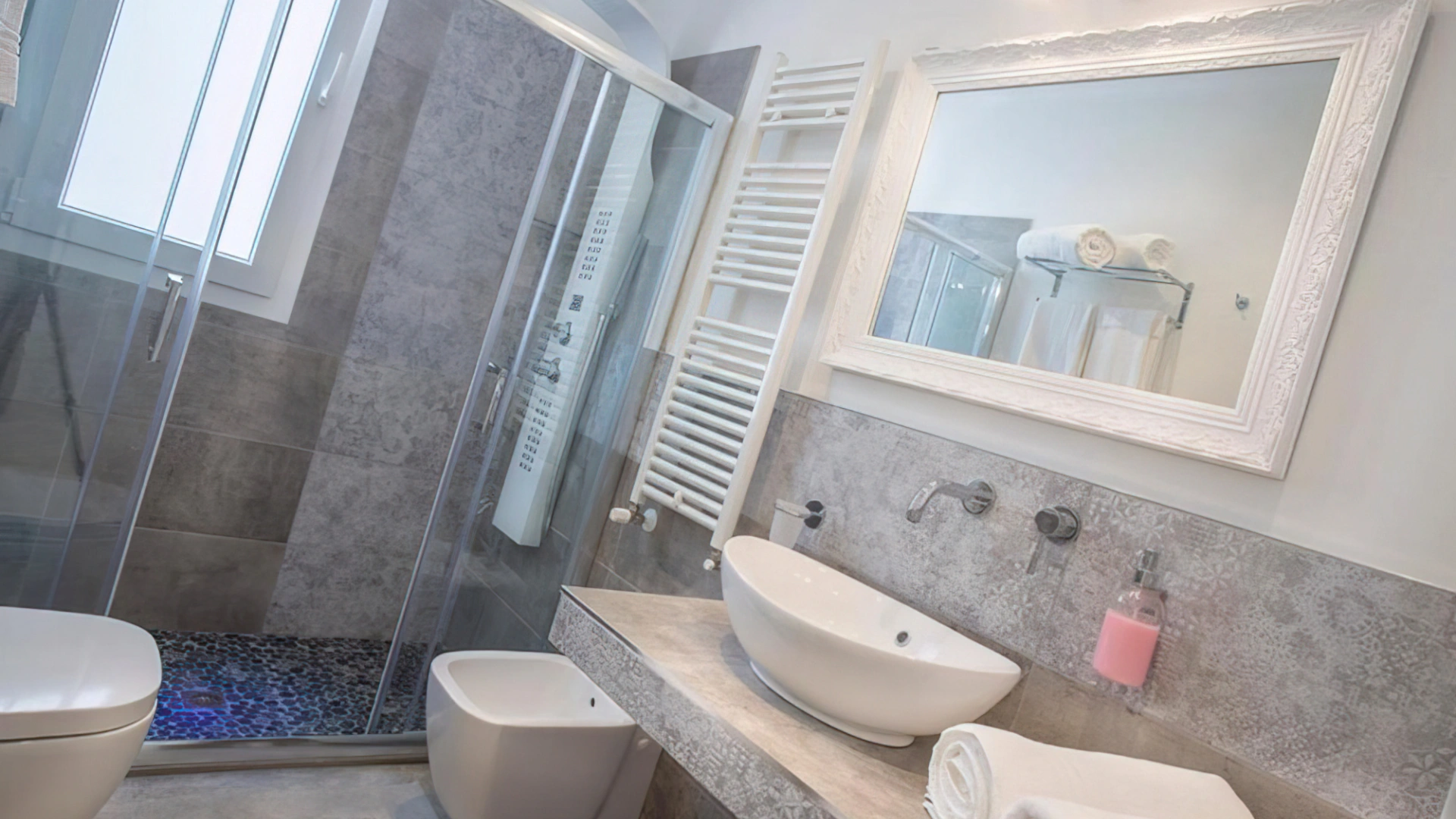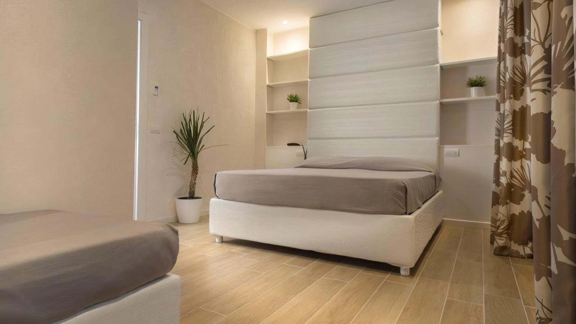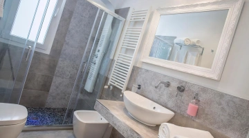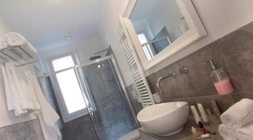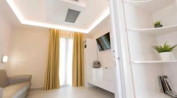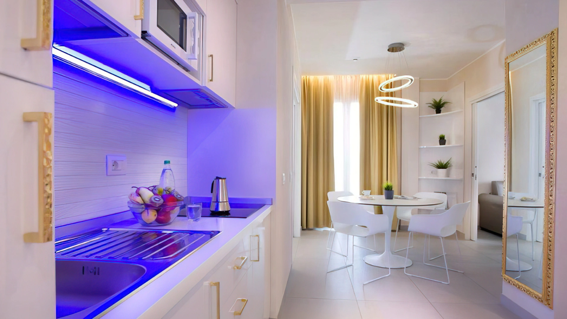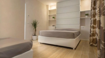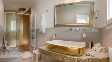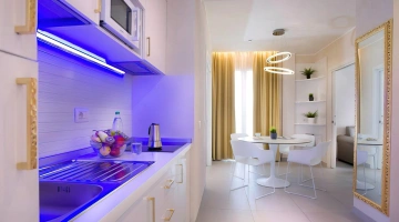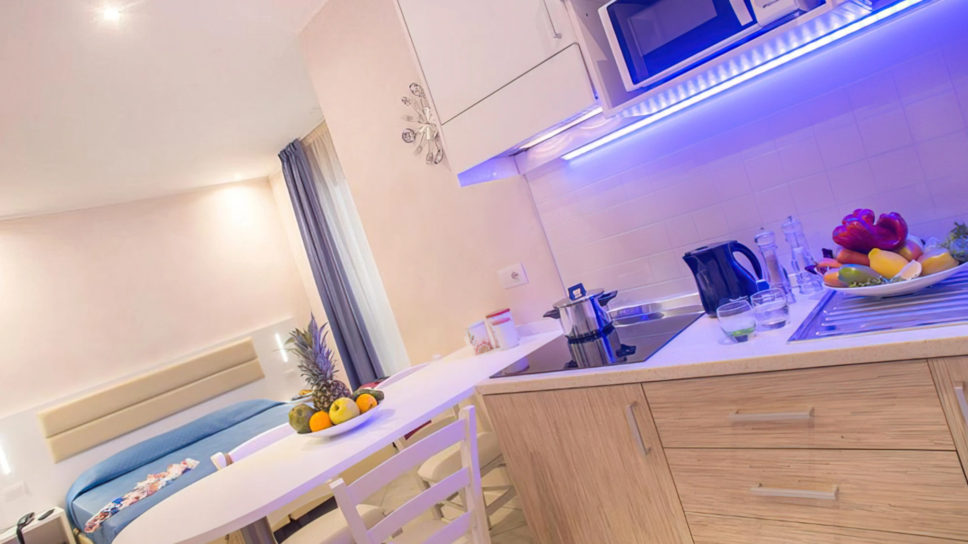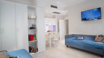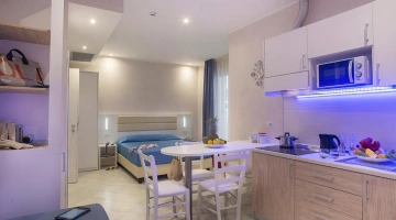They can accommodate up to 7 people. They include a complete linen set with bed linen changed every 7 days and towels changed every 3 (additional changes on request and for a fee). Final cleaning is included, excluding the kitchenette which must be returned in order and clean, otherwise €40 will be charged for cleaning. Each apartment has a balcony, LED satellite TV, safe, telephone, Wi-Fi, equipped kitchen, air conditioning and heating, bathroom with emotional shower, in some cases waterfall or hydromassage with chromotherapy.