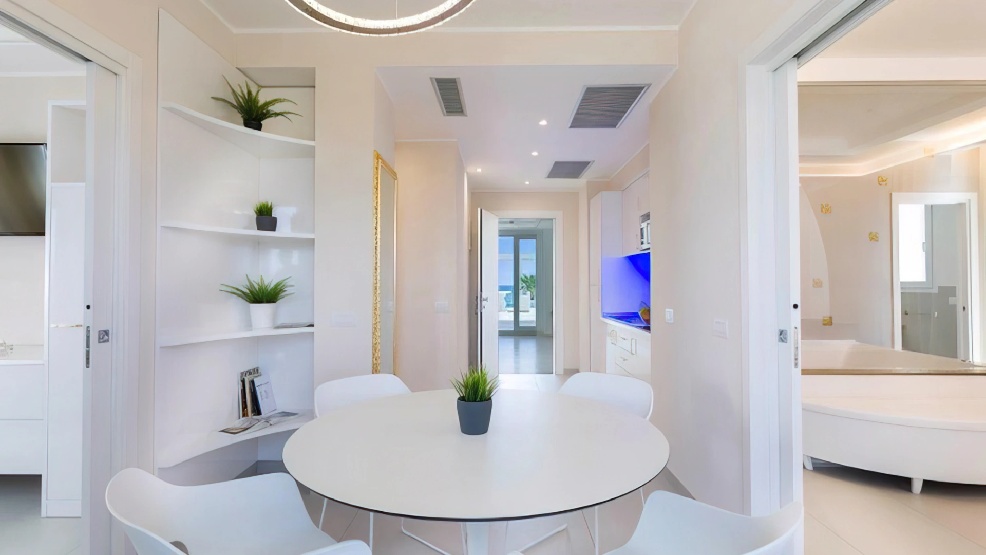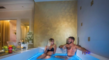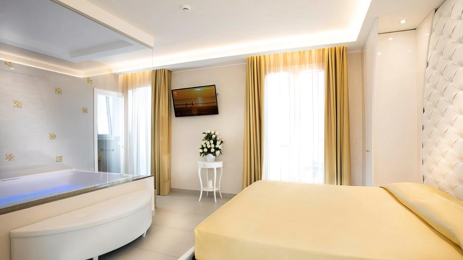 PENTHOUSE WHITE SUITE: three-room apartment located on the 4th floor with panoramic terrace, 2-seater hydromassage tub in the bedroom, two bathrooms, living area and relaxation lounge (maximum 4 people).