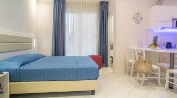 LARGE STUDIO APARTMENT: located on the first floor, they have a terrace with an outdoor sitting area facing the sea and a bathroom with emotional shower. They can accommodate up to 4 people.