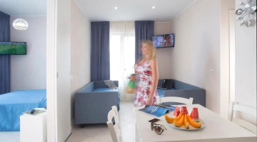 STUDIO PLUS: more spacious studio, with double bed, two sofa beds and balcony with side sea view.