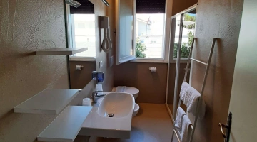 The rooms are simply furnished and equipped with air conditioning, direct dial telephone, satellite and digital terrestrial TV, 100 Mbit/s fiber Wi-Fi, safe, empty minibar, private bathroom with shower (box or curtain) and hairdryer. Most rooms also have a balcony.