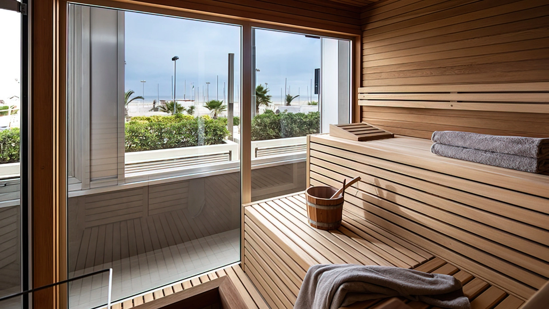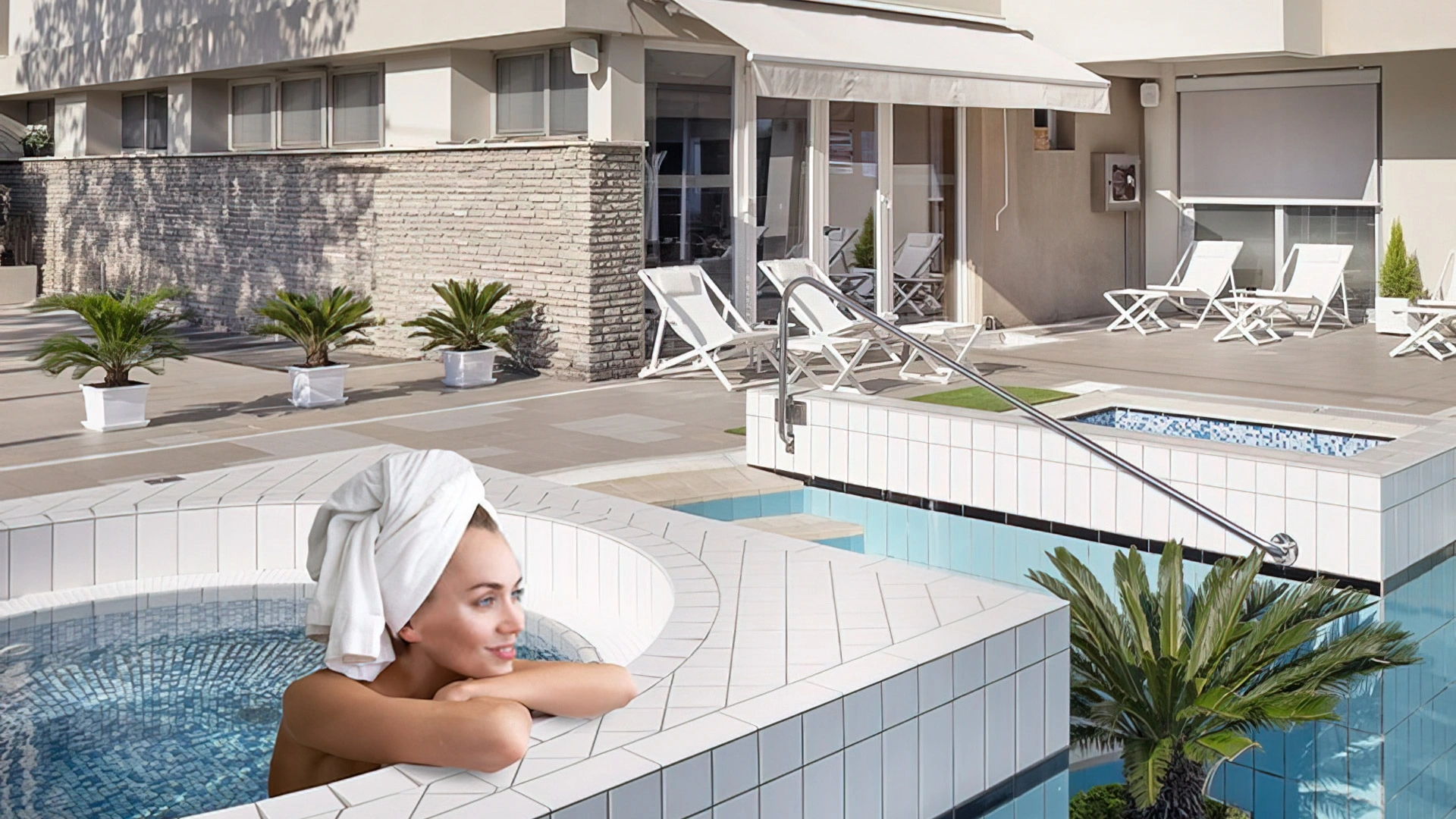 Garden, swimming pool area with 3 different pools, wellness center, solarium terrace, veranda, elevator, gym, reading room, beach towel, newspapers for common use, laundry service available on request.