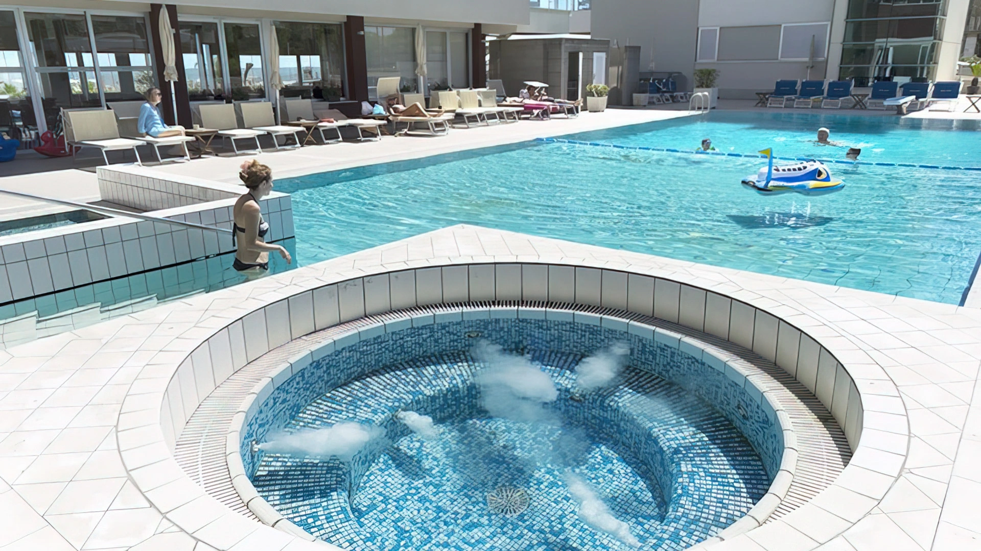 In the garden there is a large swimming pool (168 m²) with heated salt water, hydromassage, diving board, bubble jet and lifeguard service. Also in the garden there is a small children's pool with shallow, warm water as well as a heated hydromassage tub with 8 stations. Around the swimming pool area there is a solarium equipped with sun loungers and umbrellas.