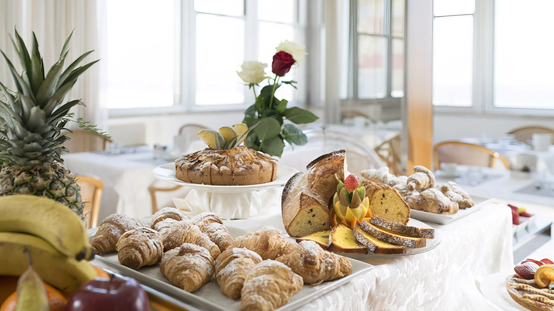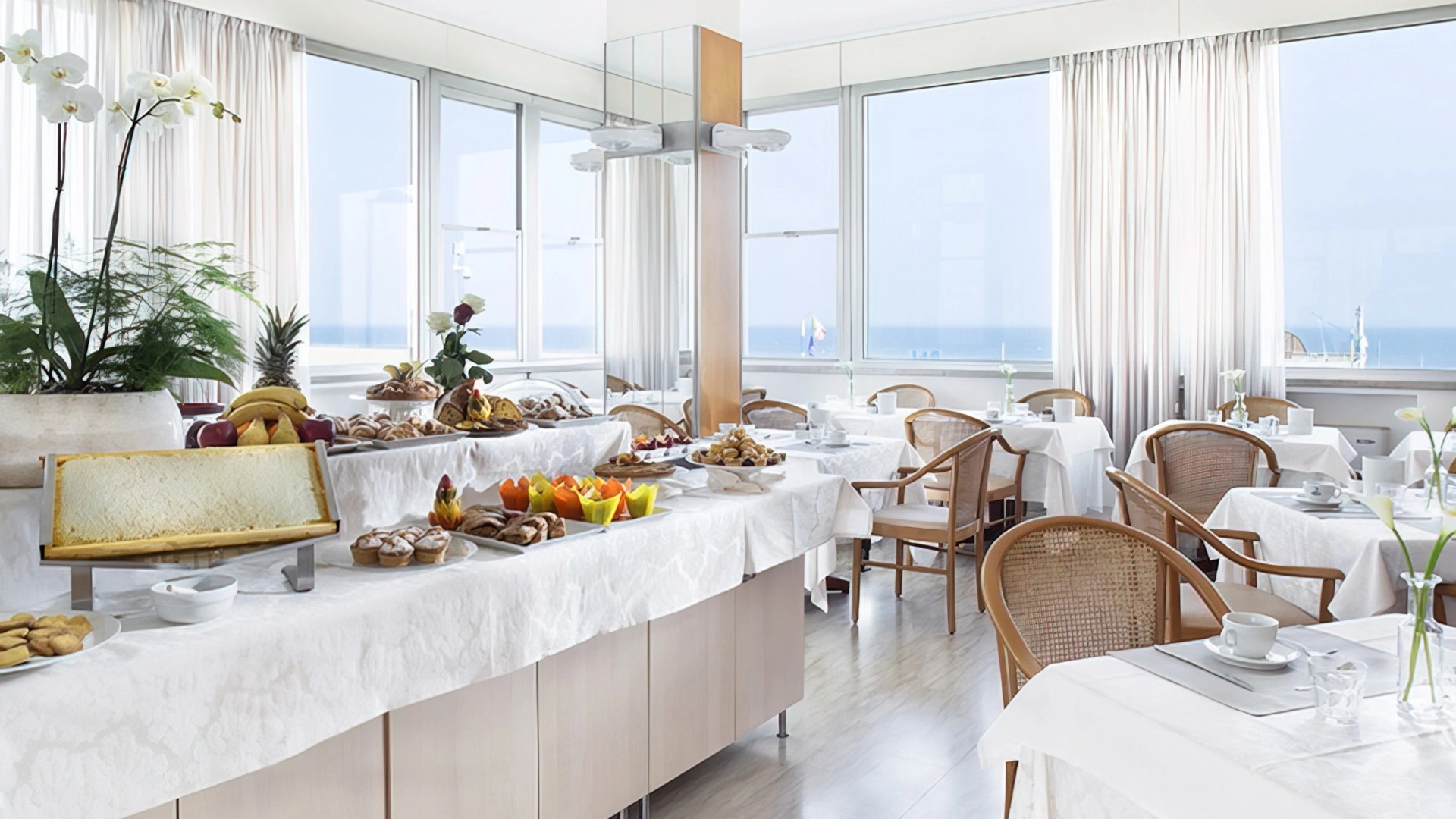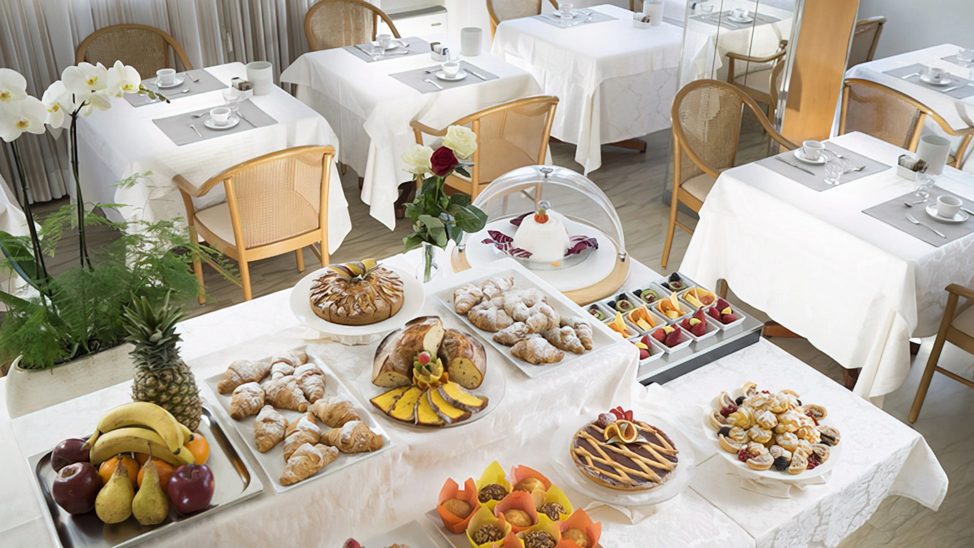 BREAKFAST: is served in a panoramic room with the possibility of an outdoor terrace. The buffet is set up with sweet and savory dishes, homemade desserts, croissants, yogurt, cereals, jams, fresh fruit, cheeses, eggs, cold cuts, organic corner, diet products and espresso coffee drinks.