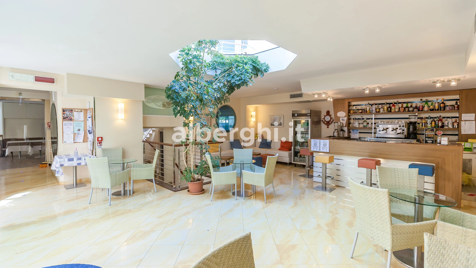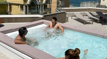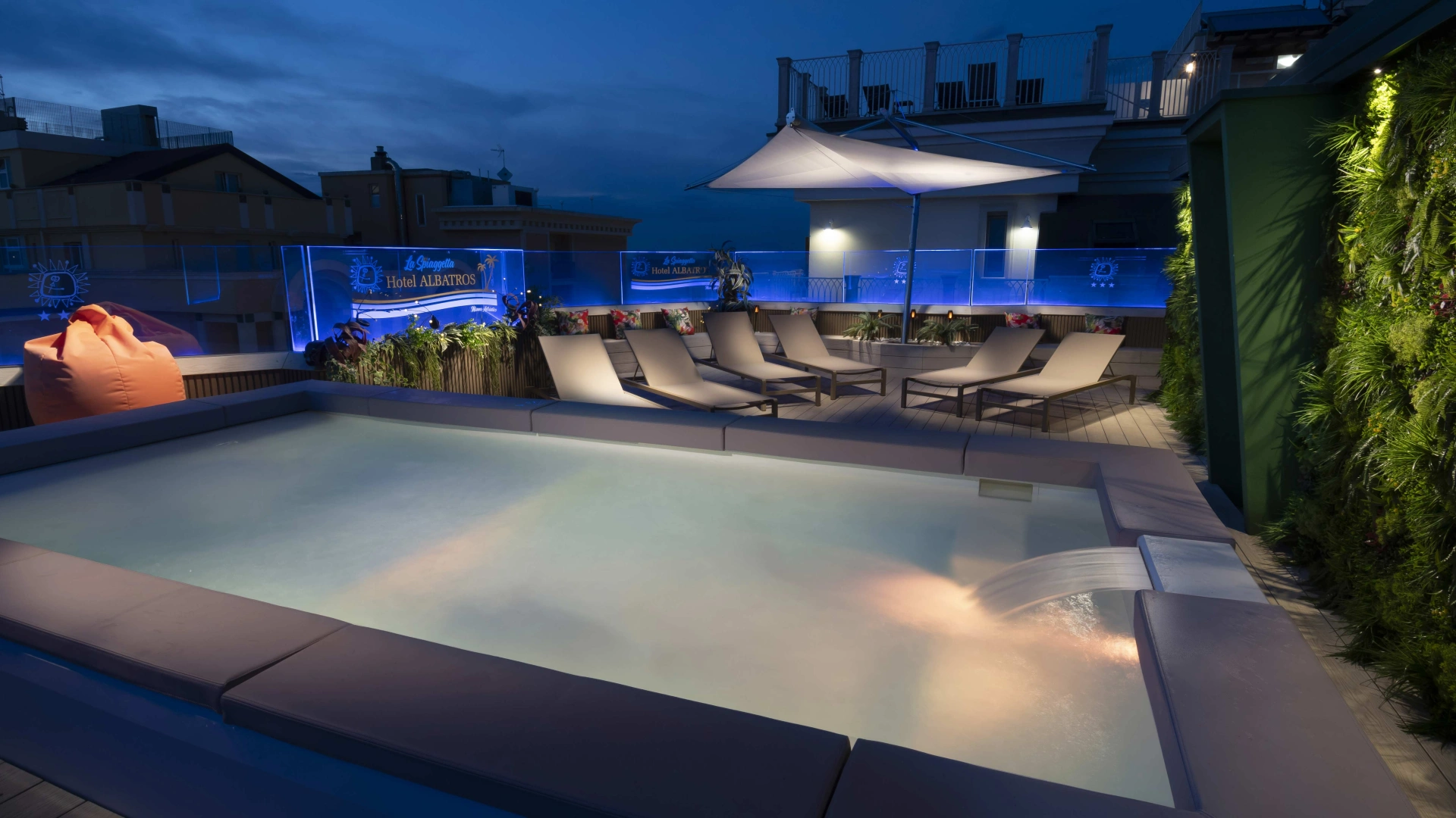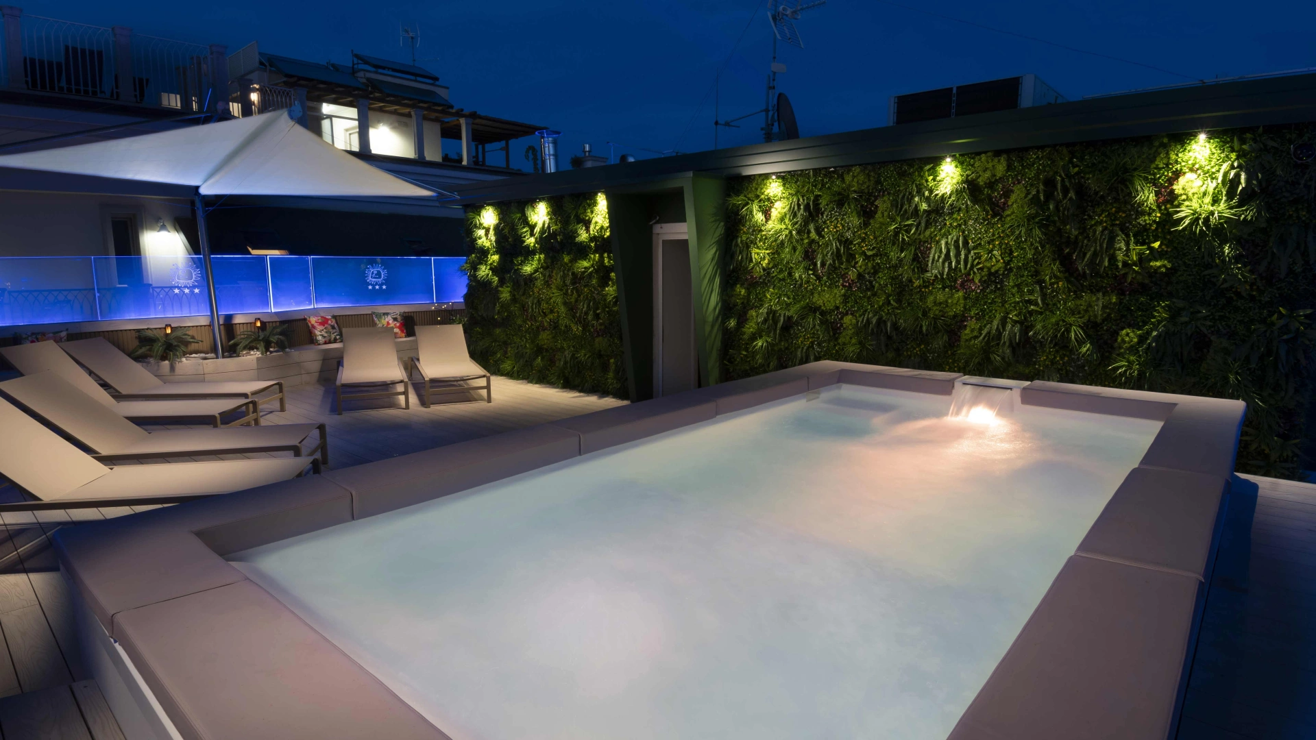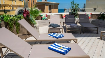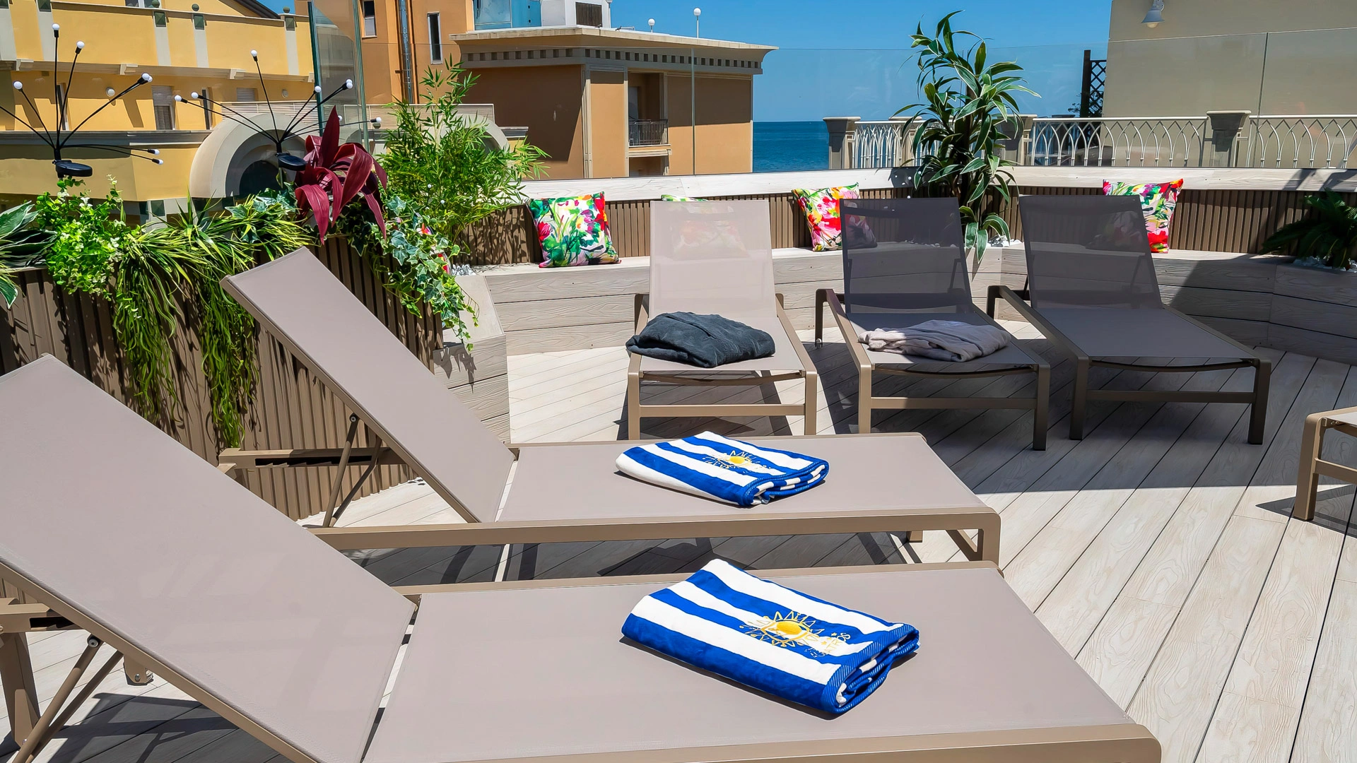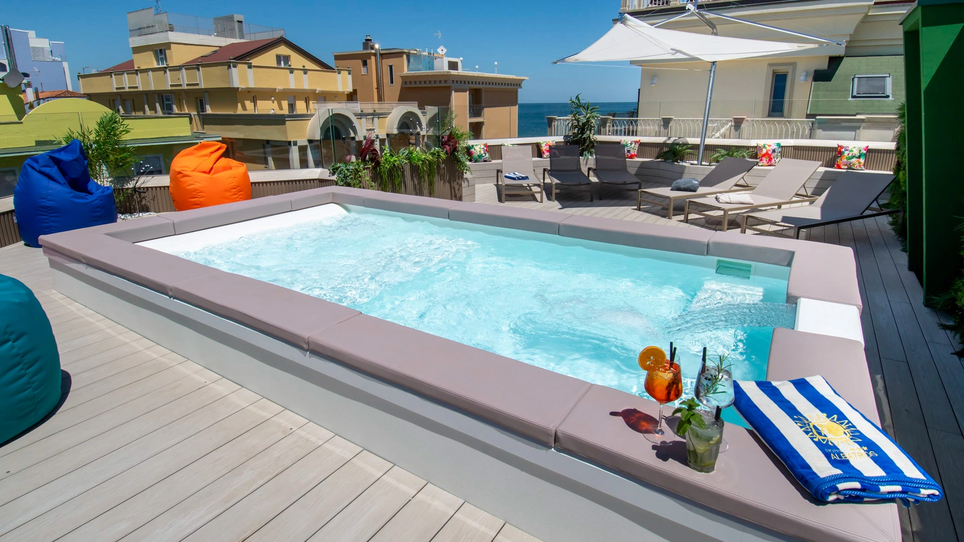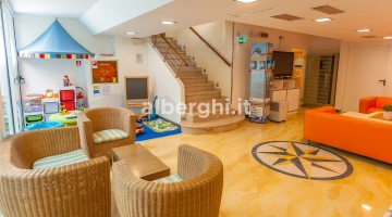 Garden area, terrace with Jacuzzi and solarium area, free bicycles, small equipped gym, tavern with books available, bar, TV room, two elevators, one of which is panoramic, night porter. It organizes themed evenings and offers guests the use of beach towels. Free paddle boarding and therapeutic massages (massage physiotherapy) available upon request (for a fee). On the hotel terrace there is a relaxation area with solarium and hot tub.