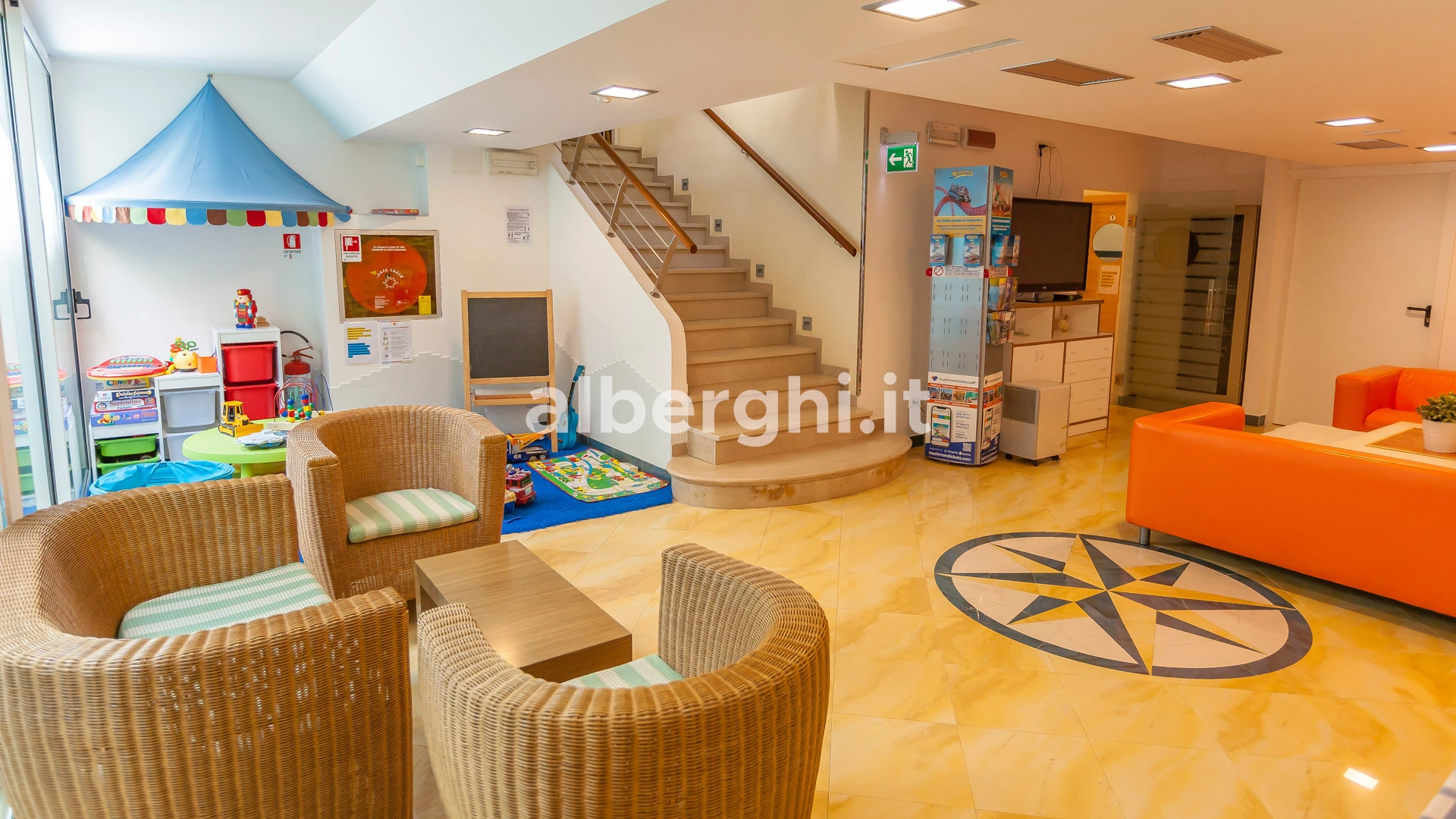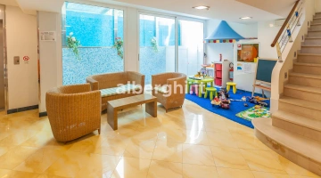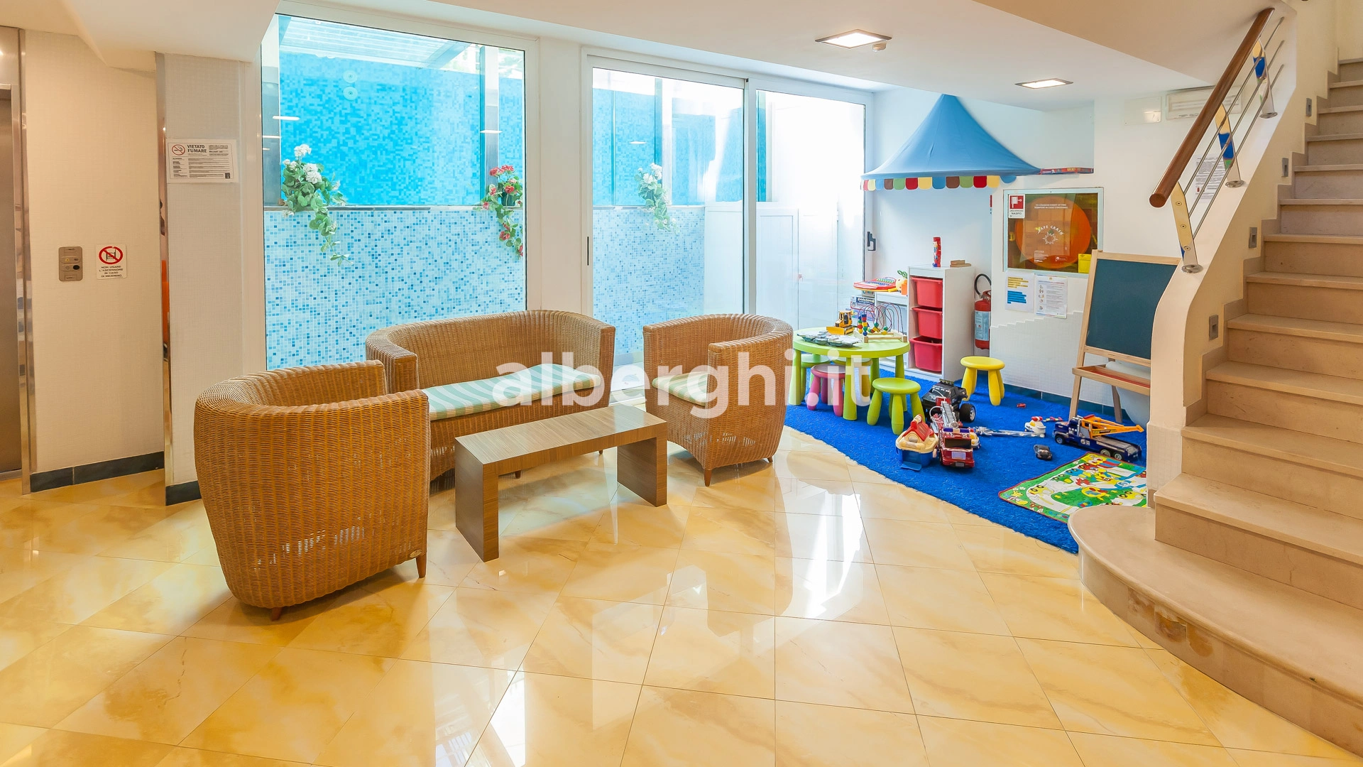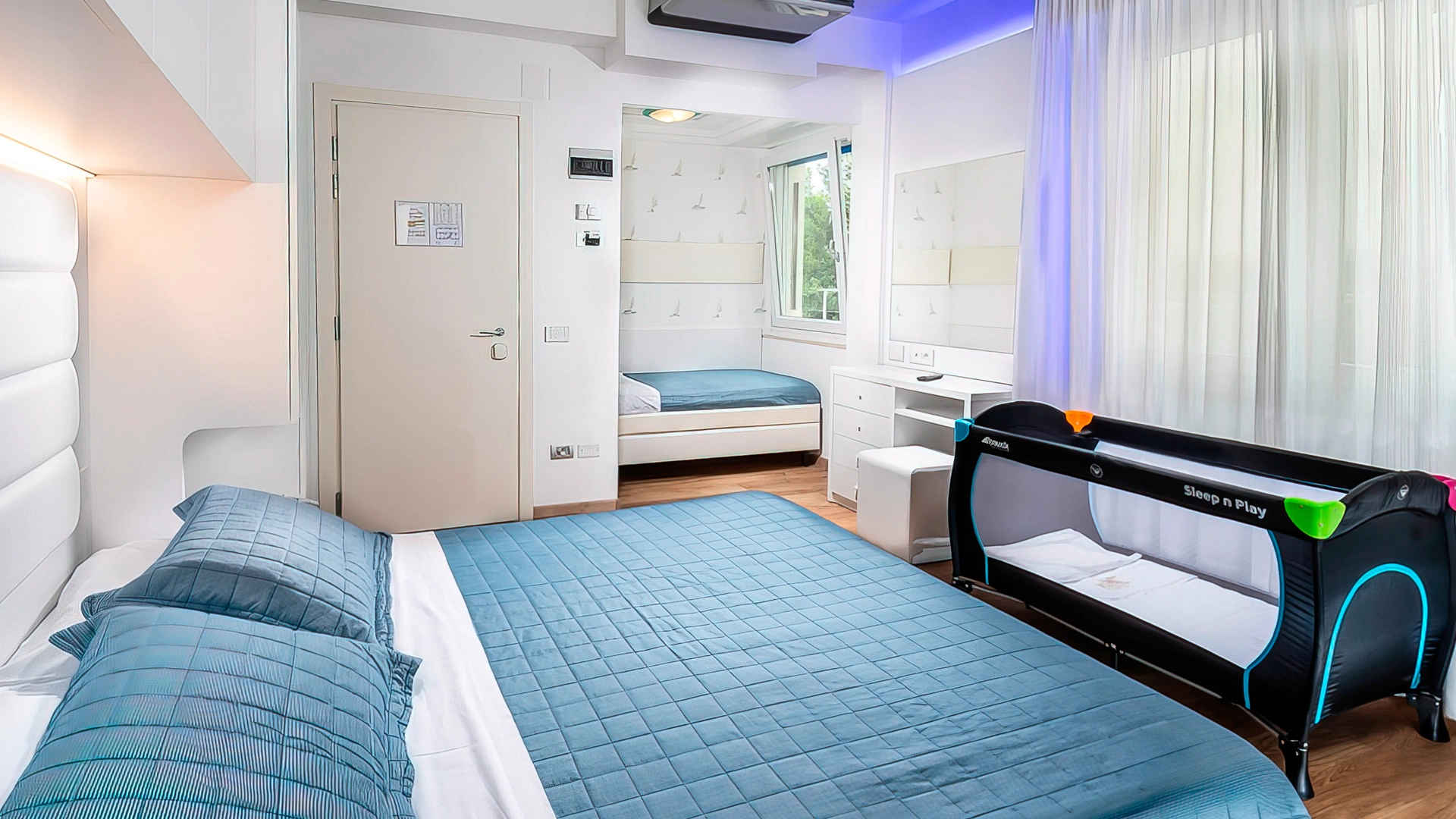 In the hotel: indoor playground area, bicycle seat and helmet, pediatrician on request.