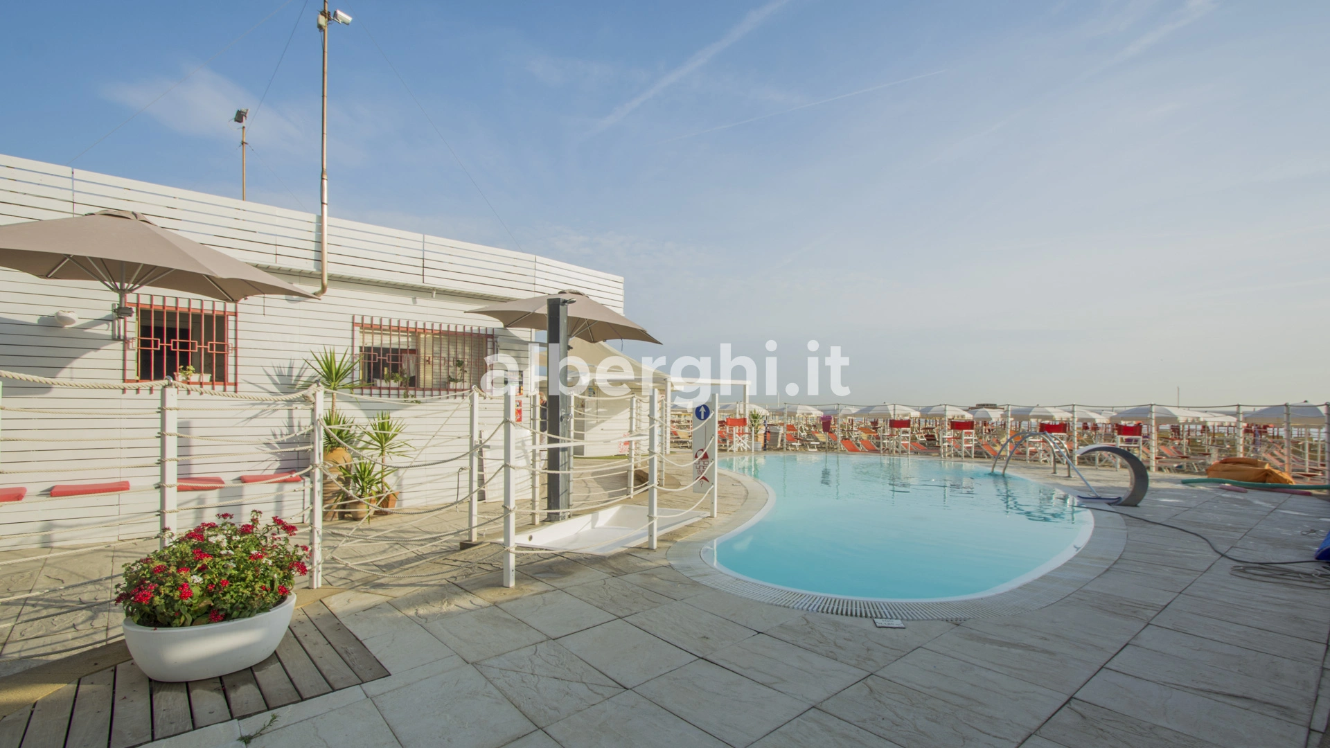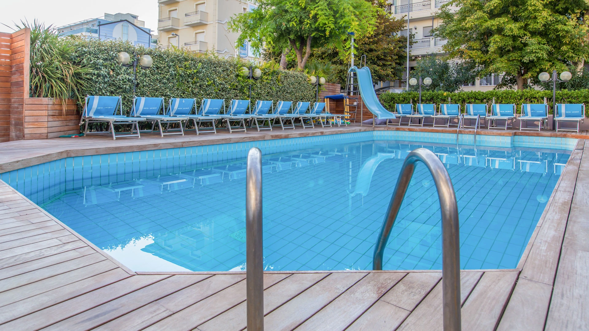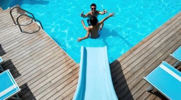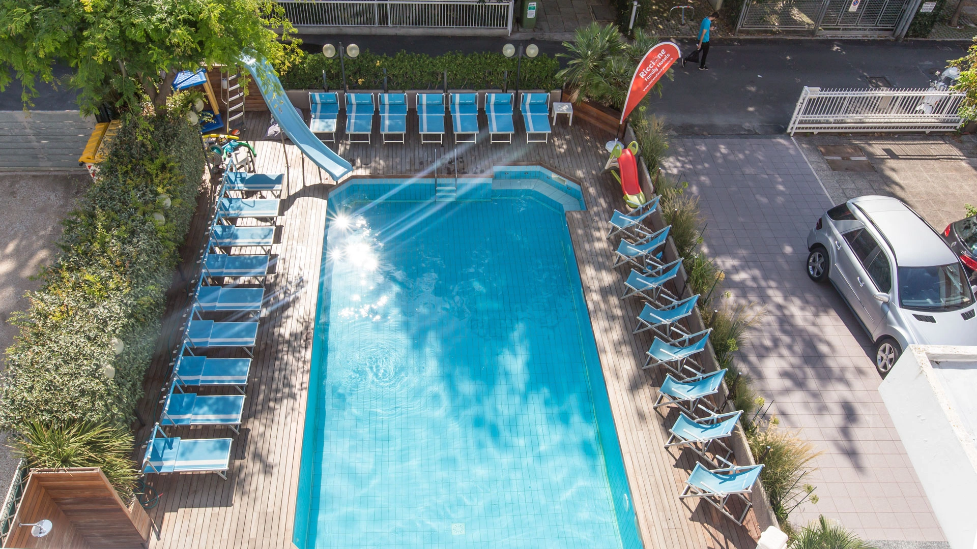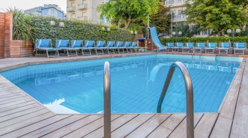 The hotel is characterized by the presence of a swimming pool surrounded by sun loungers with a hydromassage corner and a slide for children.