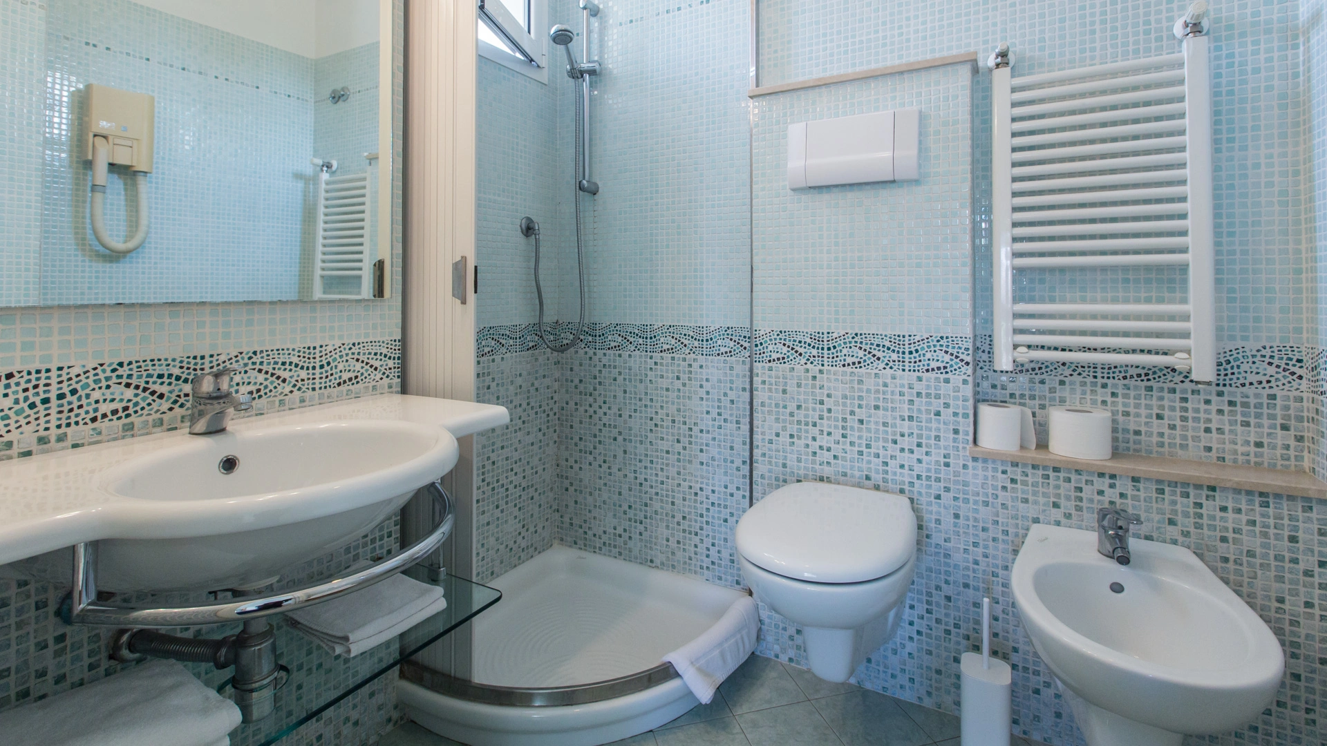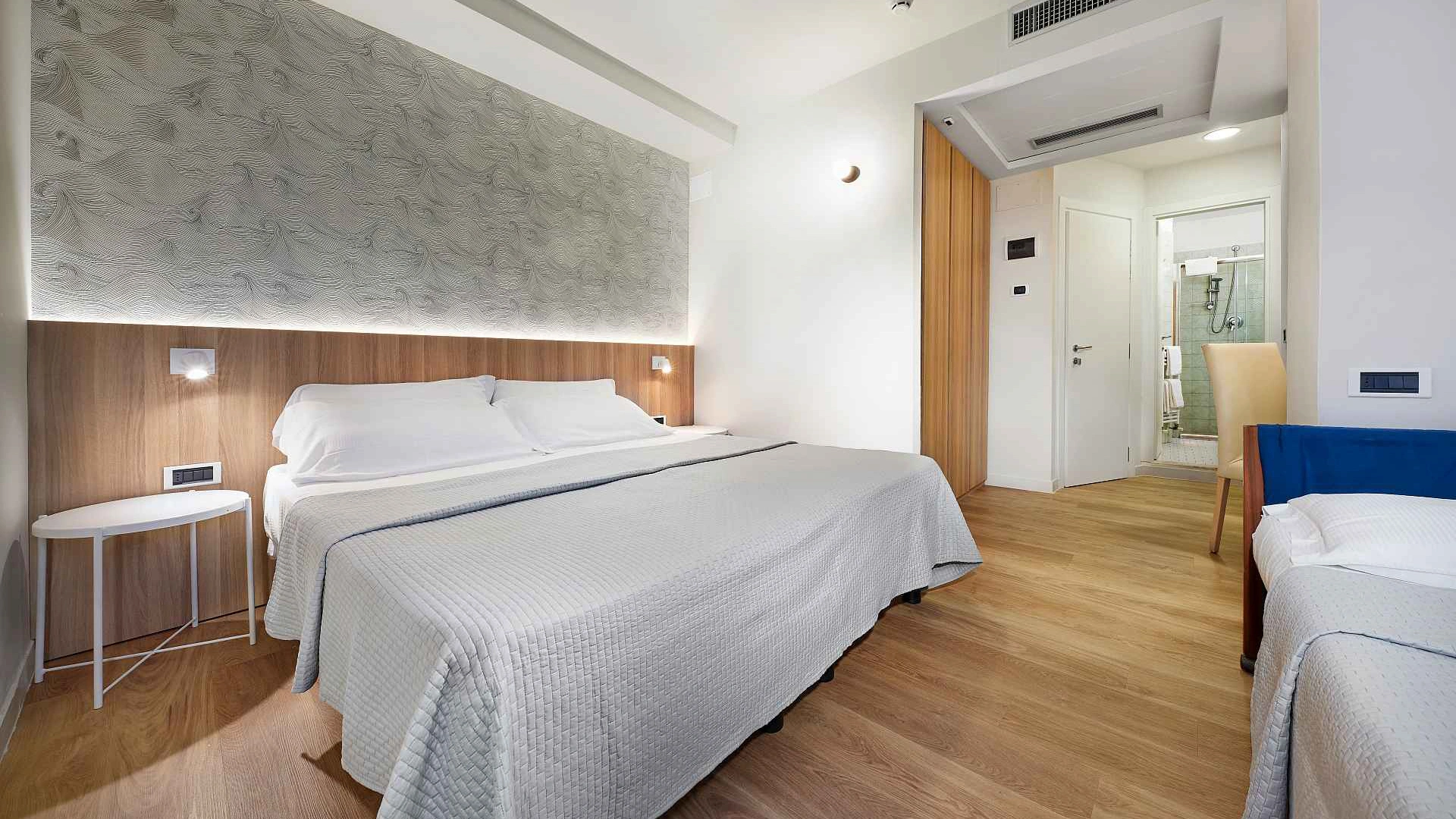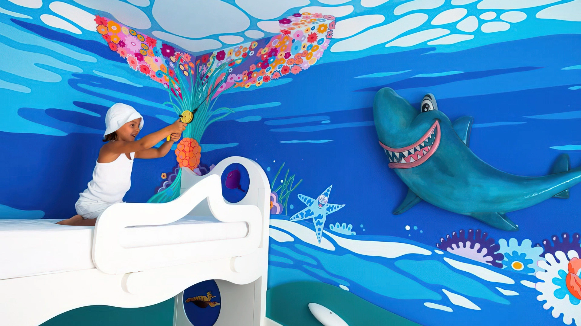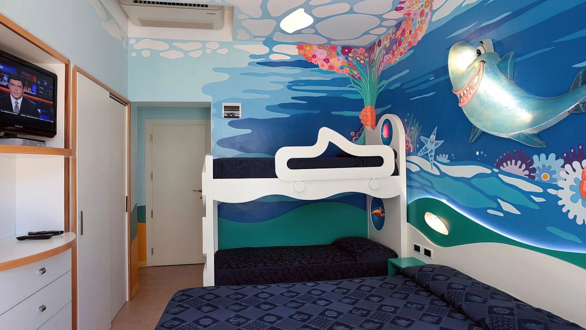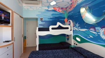 SHARKY: the interiors are set up to celebrate the star of the Cattolica Aquarium, the bull shark. The marine depictions are especially evocative for the little ones. It enjoys the same services as the Superior room.
