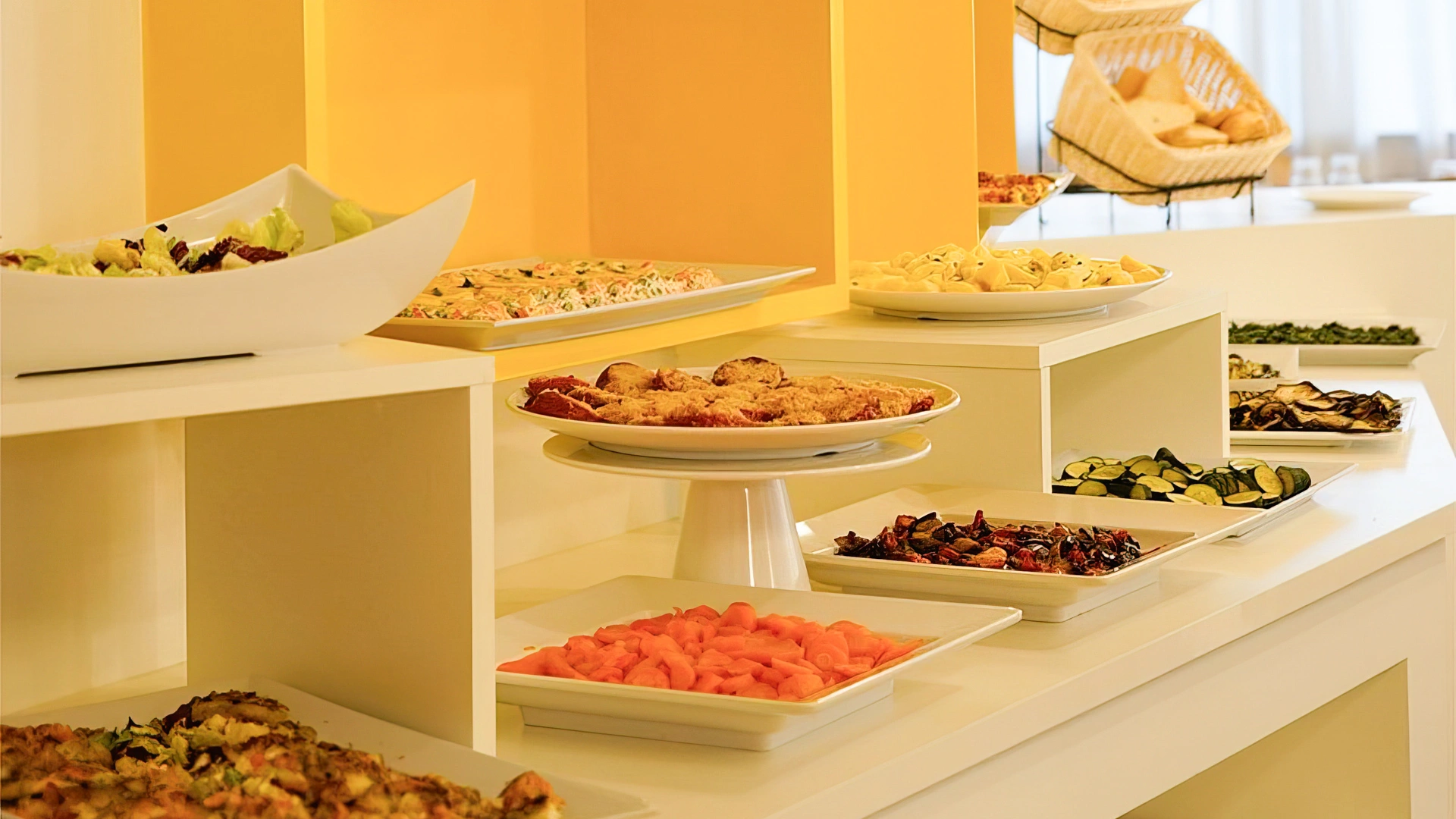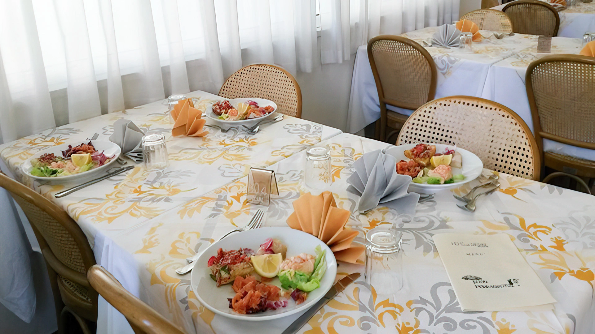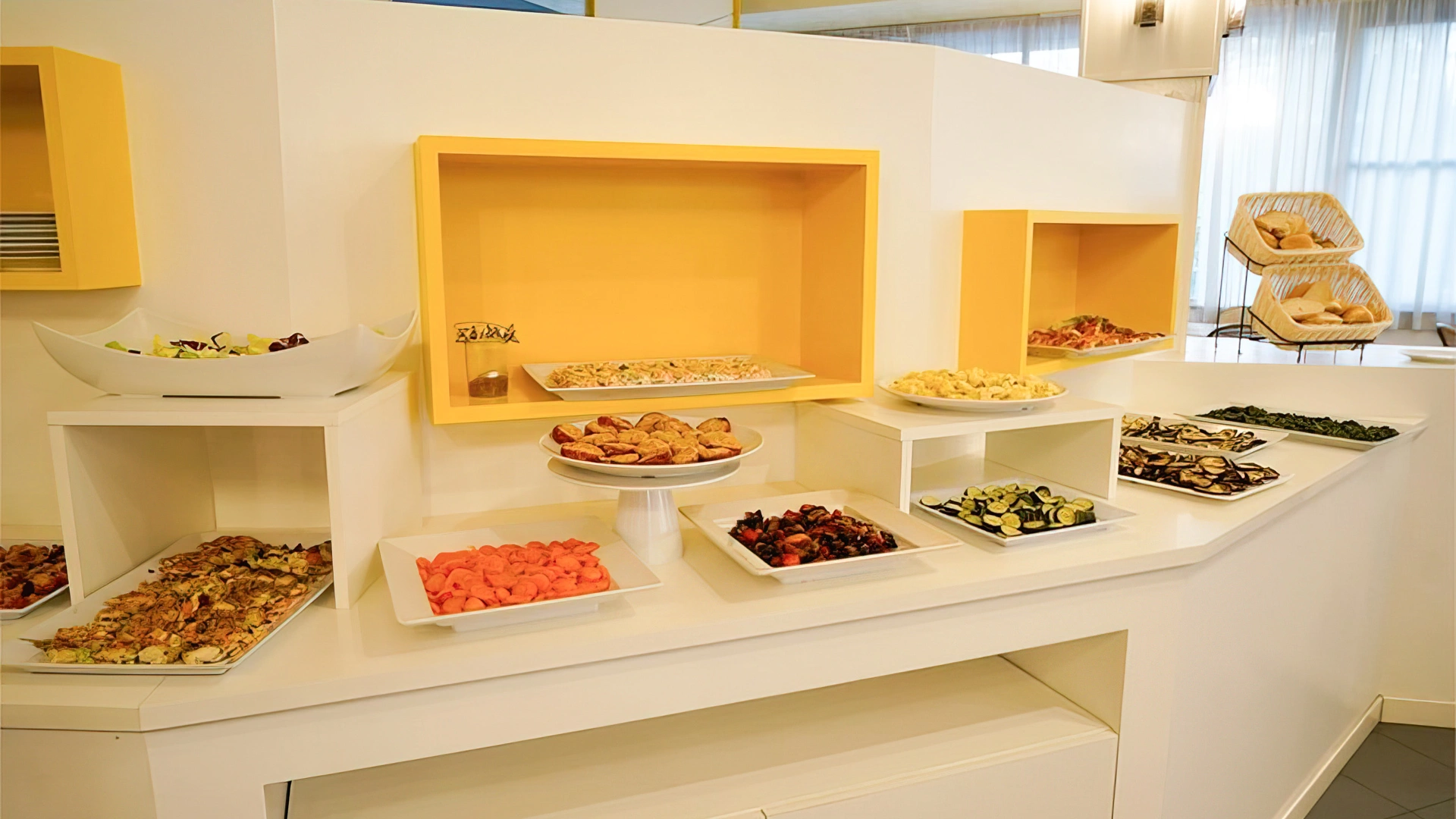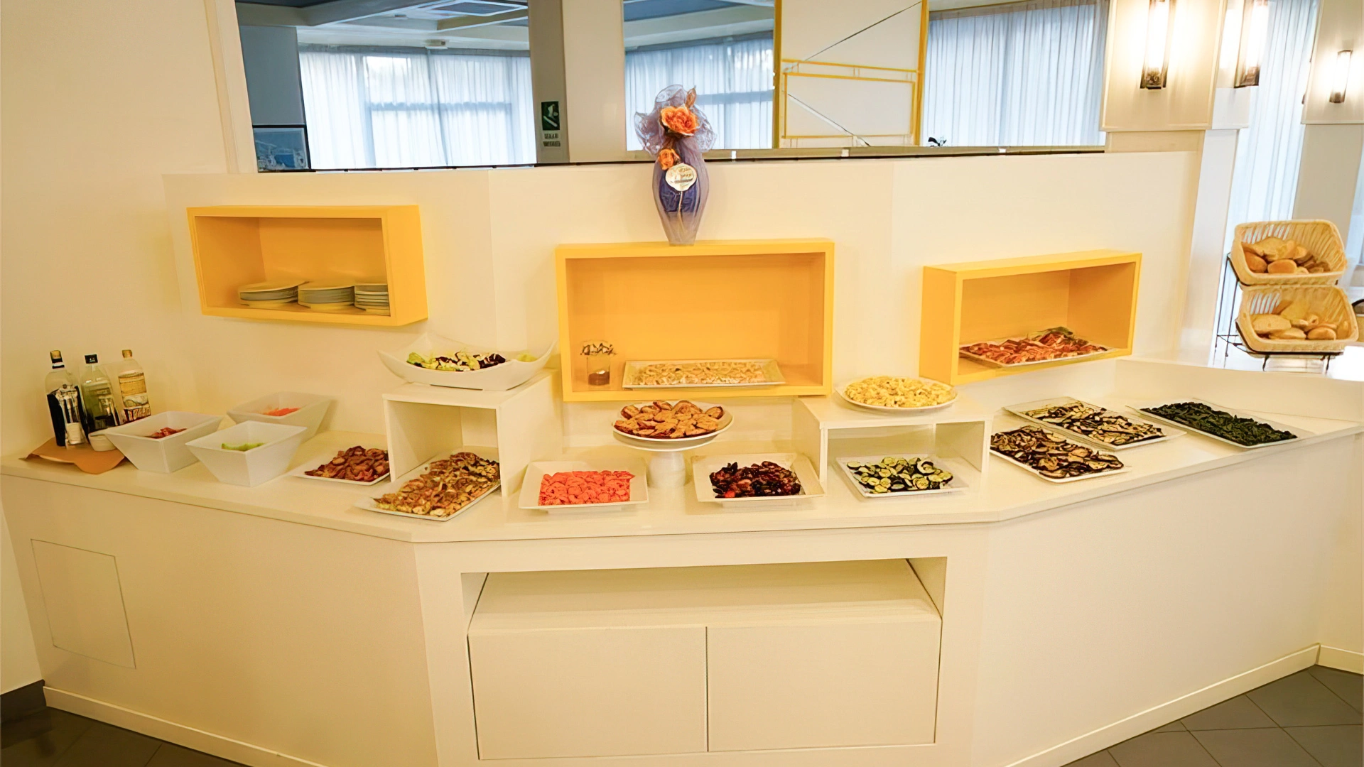 BREAKFAST: rich buffet based on sweet and savory products, including fresh croissants, homemade ring-shaped cake, fresh bread, various biscuits, rusks, mix of cereals, jams, yogurt, fruit juices, fresh and canned fruit, cured meats and cheeses, espresso coffee and hot drinks.