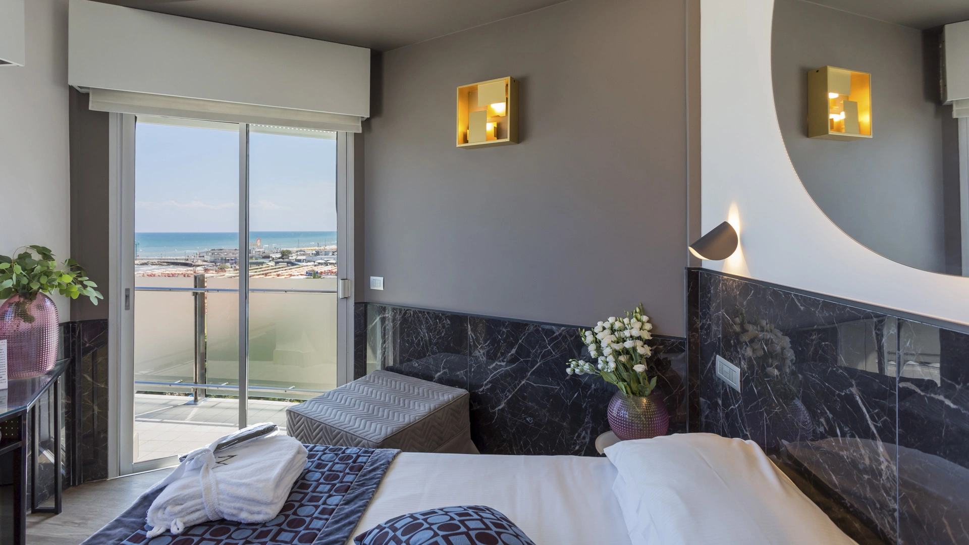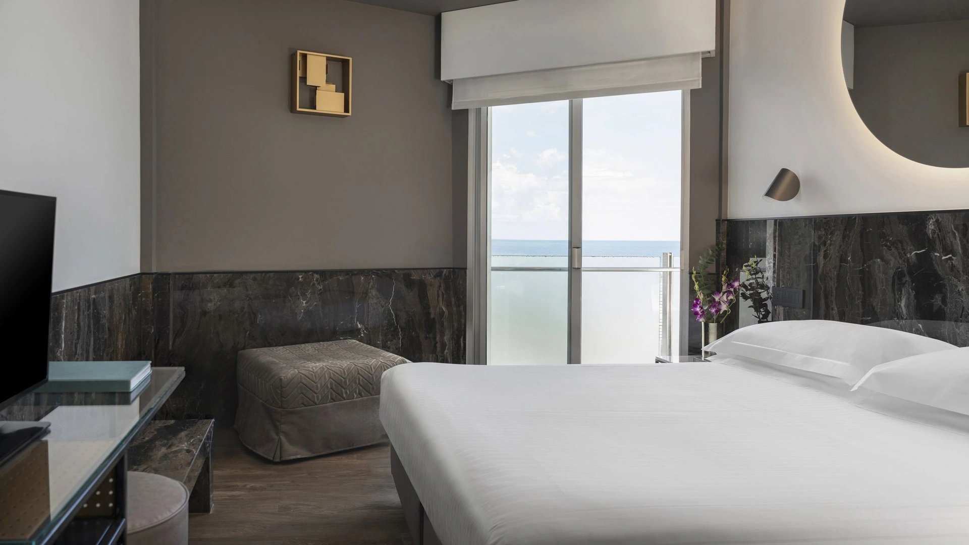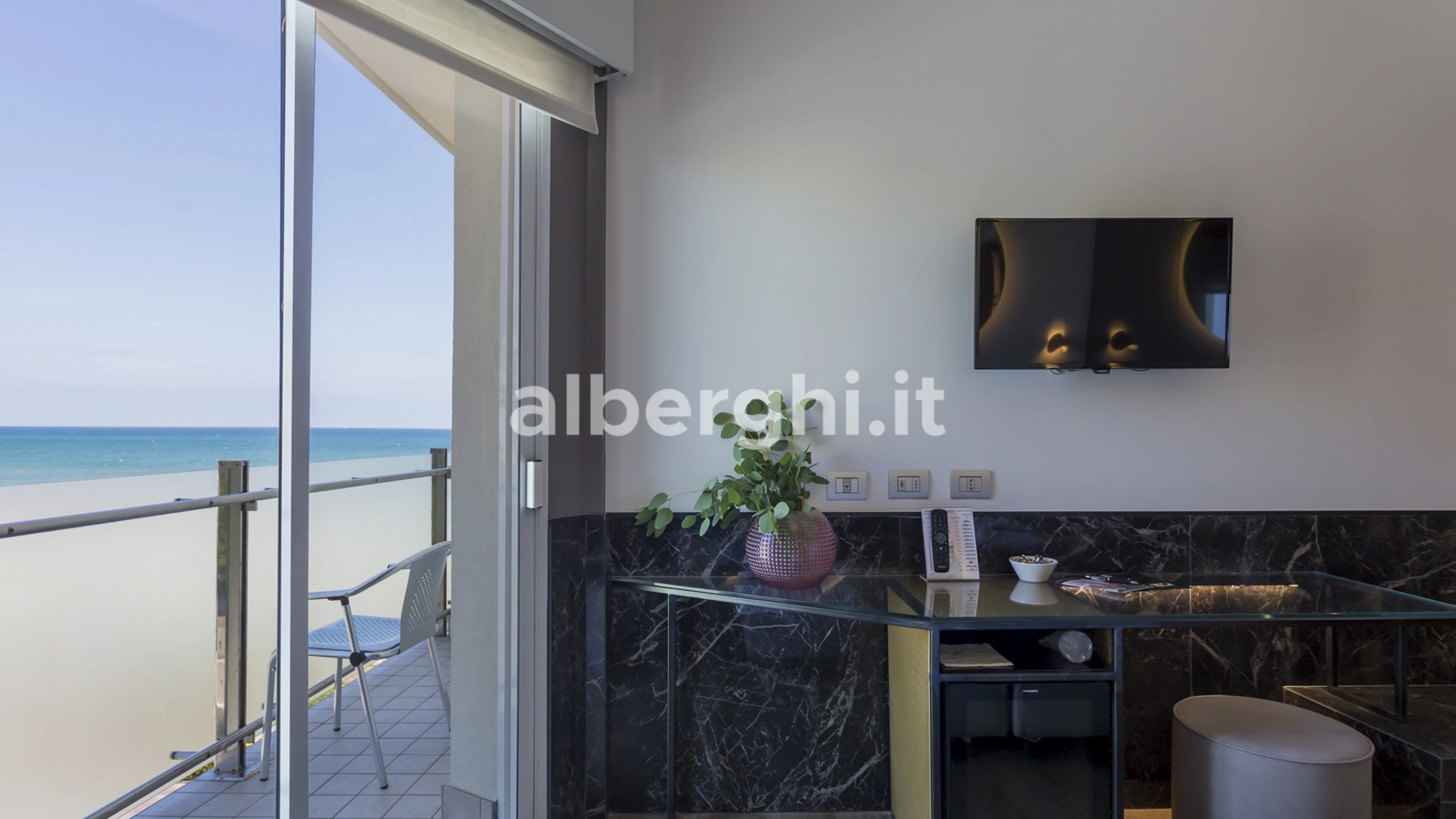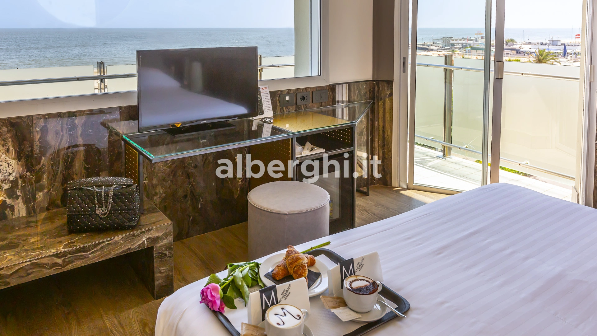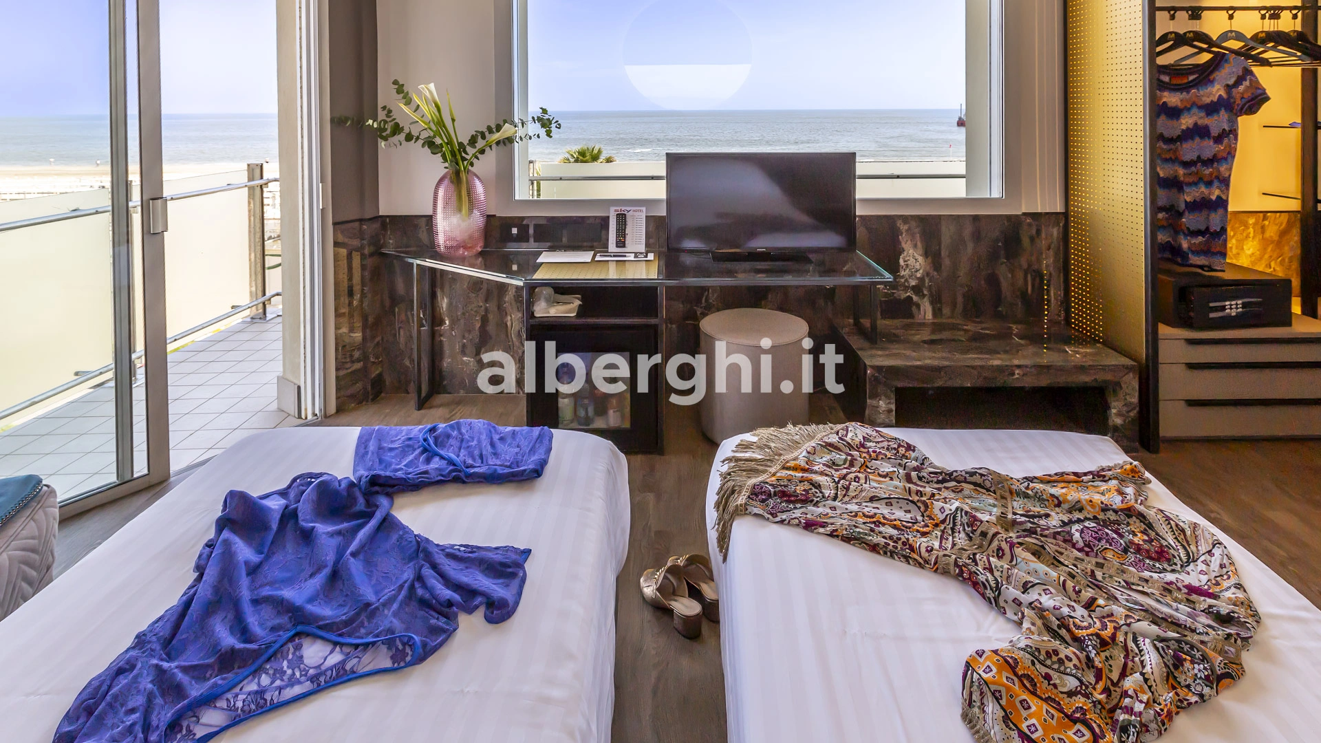 The rooms have a sea view and feature a balcony, Sommier beds, individually controlled air conditioning and heating, a well-stocked minibar, 32" LCD TV with Sky HD and Dazn, safe, telephone, fibre Wi-Fi, bathroom with hairdryer and a rich courtesy set.