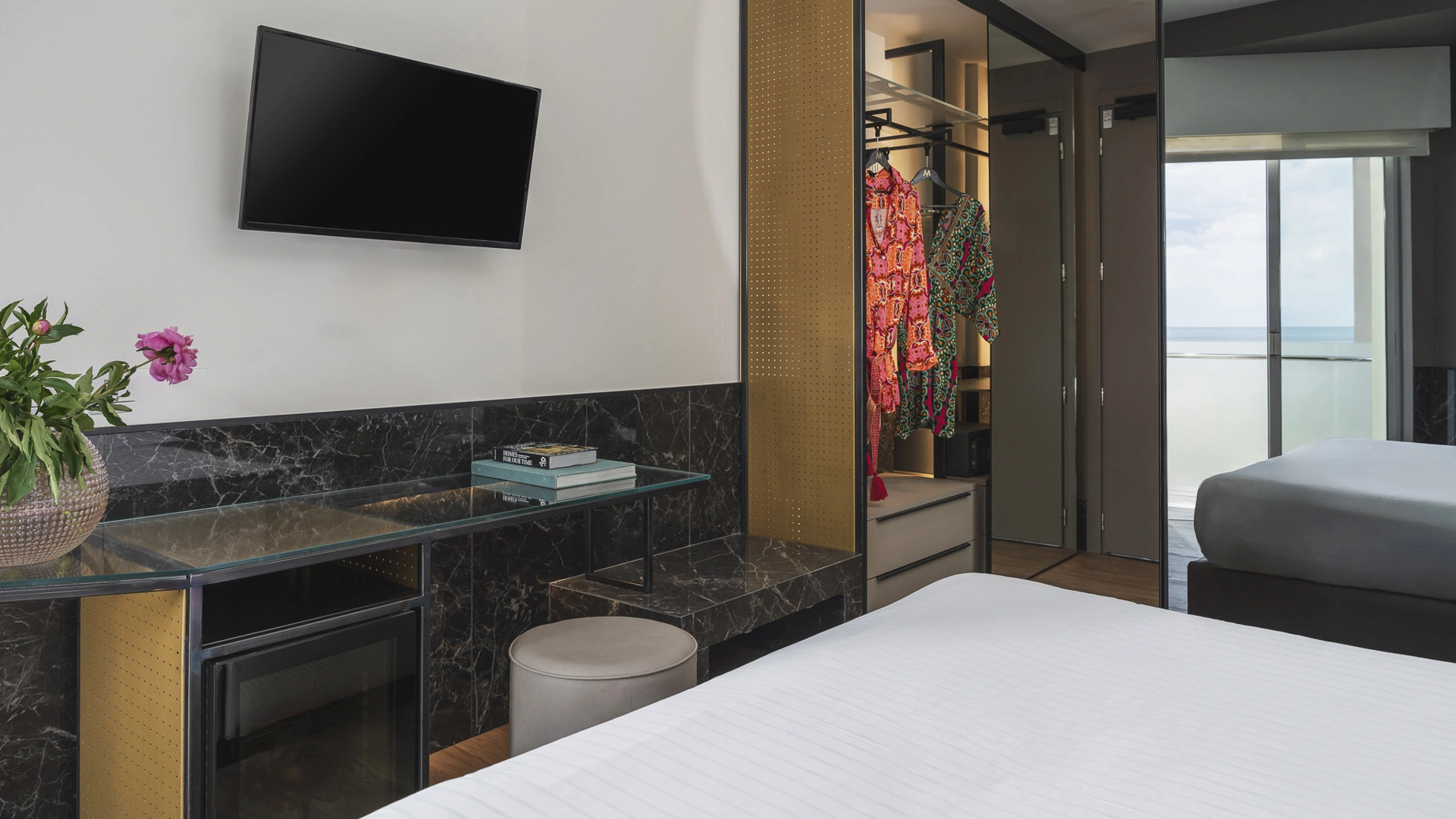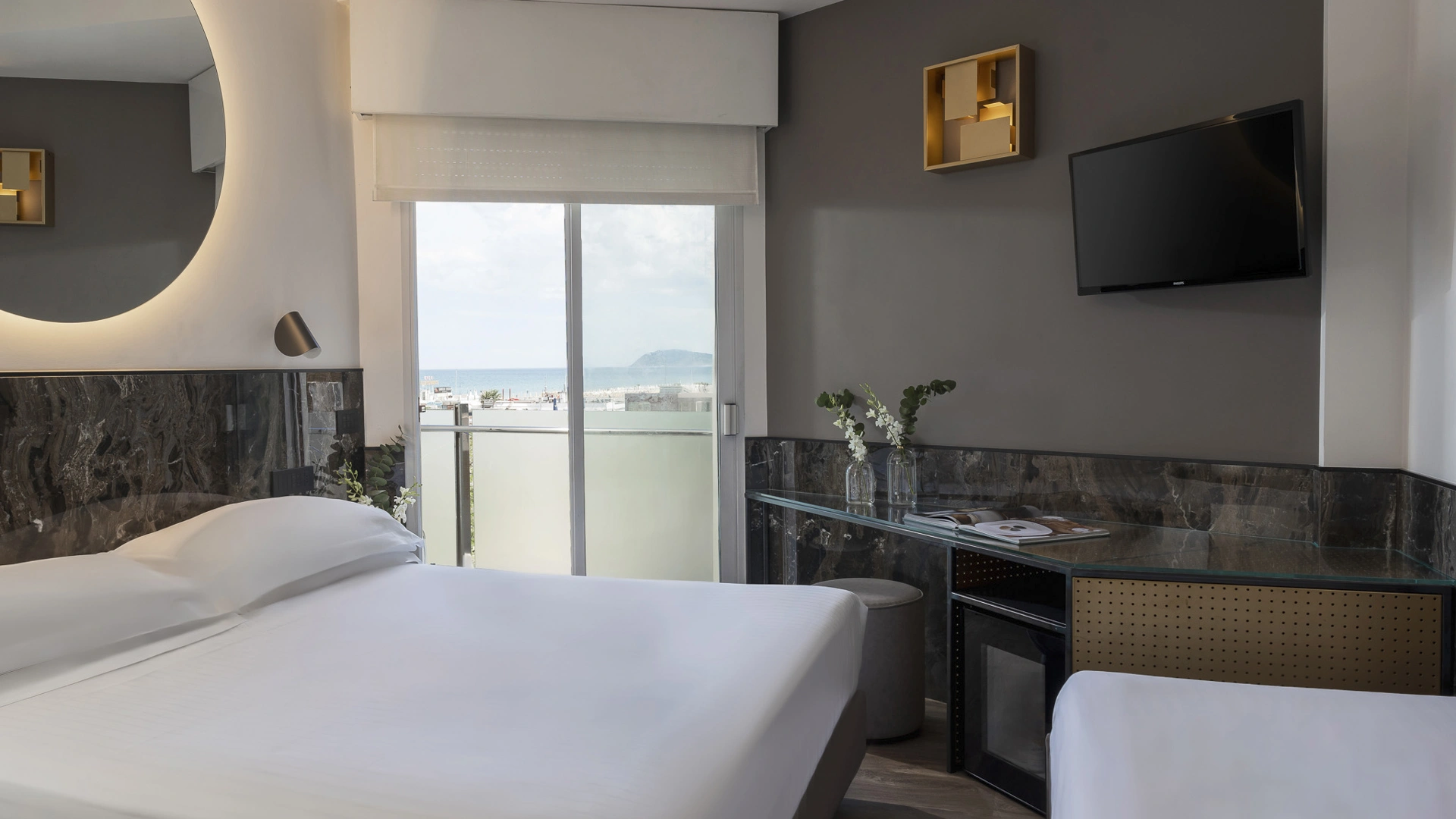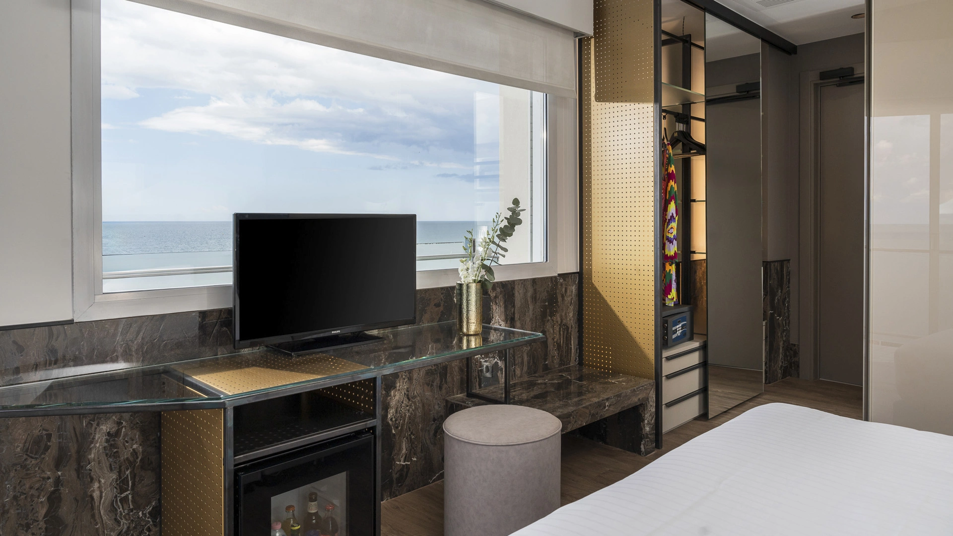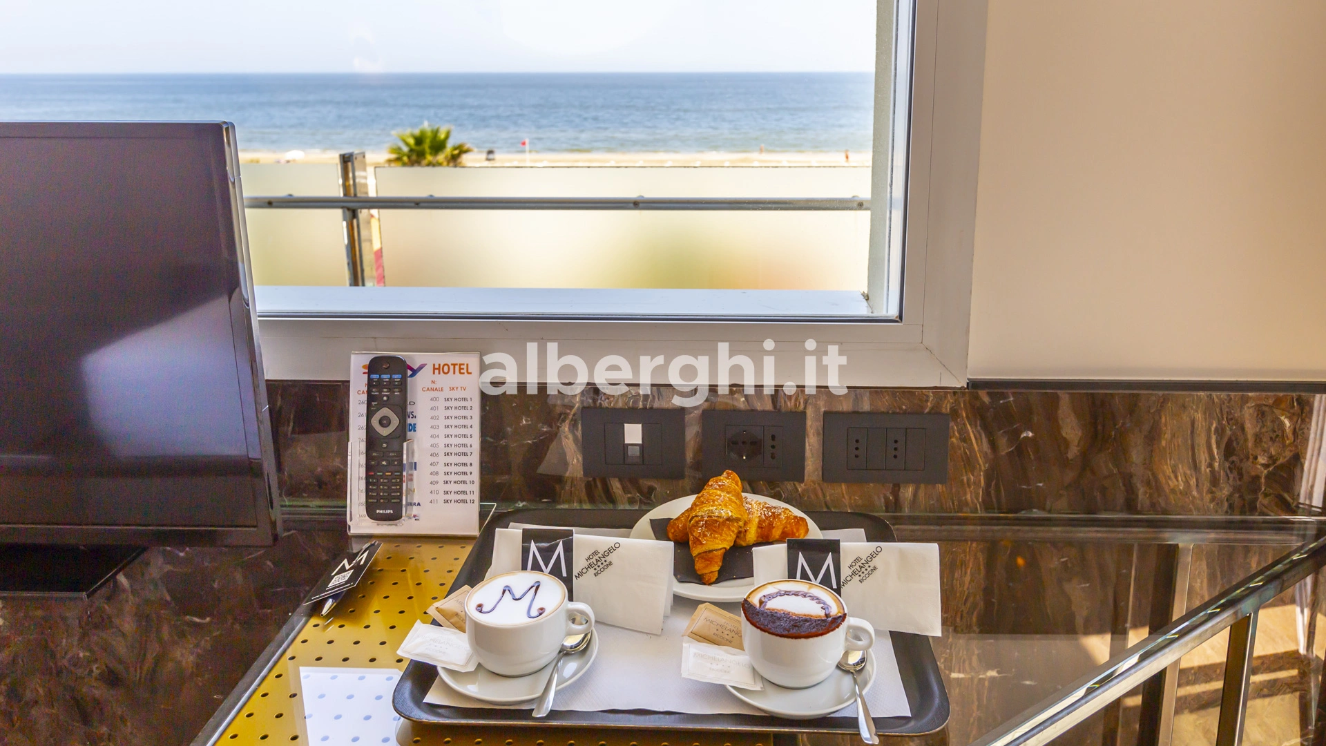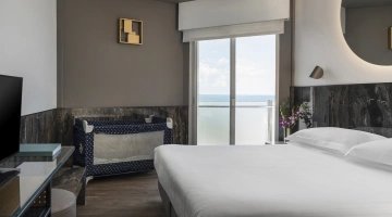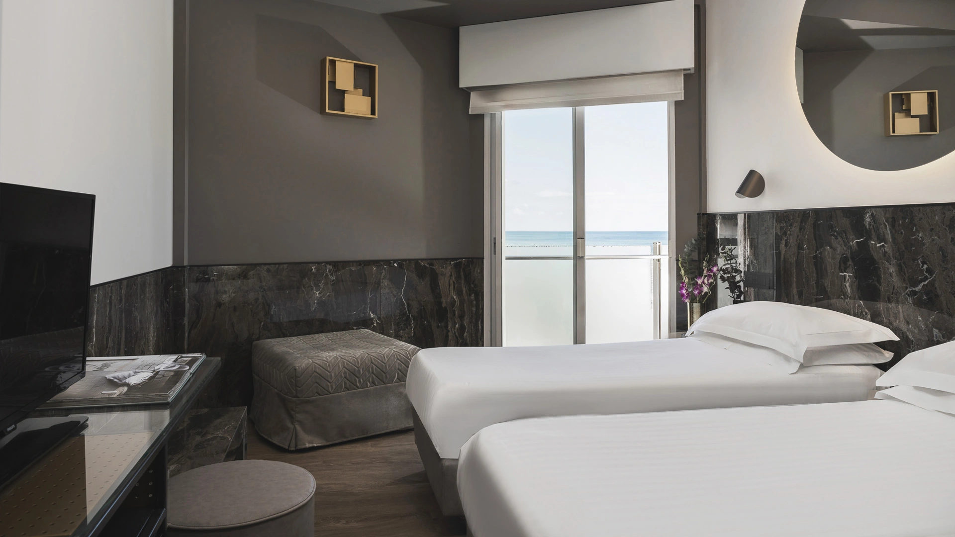 The rooms have a sea view and feature a balcony, Sommier beds, individually controlled air conditioning and heating, a well-stocked minibar, 32" LCD TV with Sky HD and Dazn, safe, telephone, fibre Wi-Fi, bathroom with hairdryer and a rich courtesy set.