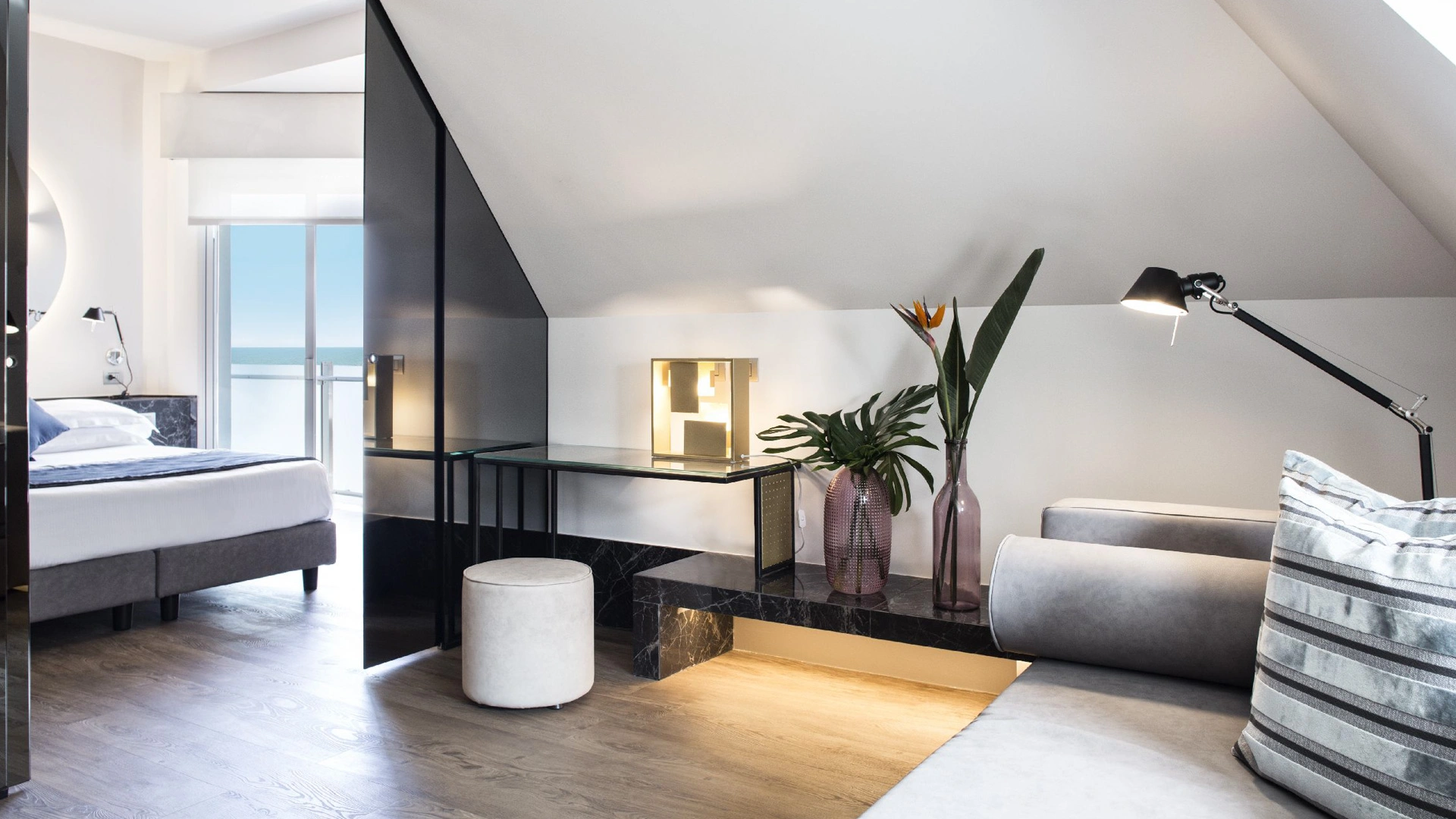 JUNIOR SUITE: 3 rooms located on the fourth floor with variable sizes (from 28 to 33 m2) and balconies with a lateral sea view. They consist of two communicating rooms (a living room and a double bedroom), a large bathroom with a shower cubicle equipped with a ceiling shower head with a "rain" jet and a wall shower head with a "waterfall" jet, bathrobe, slippers, beach towel in use and a daily newspaper of your choice in addition to the services listed above.