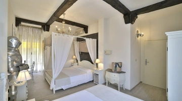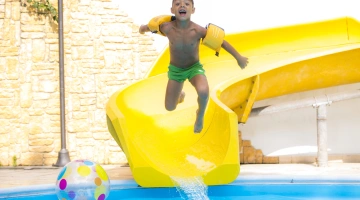 The swimming pool is 110 m2 large and 80 to 130 cm deep. It is located in the garden, surrounded by a solarium and equipped with slides and a waterfall.