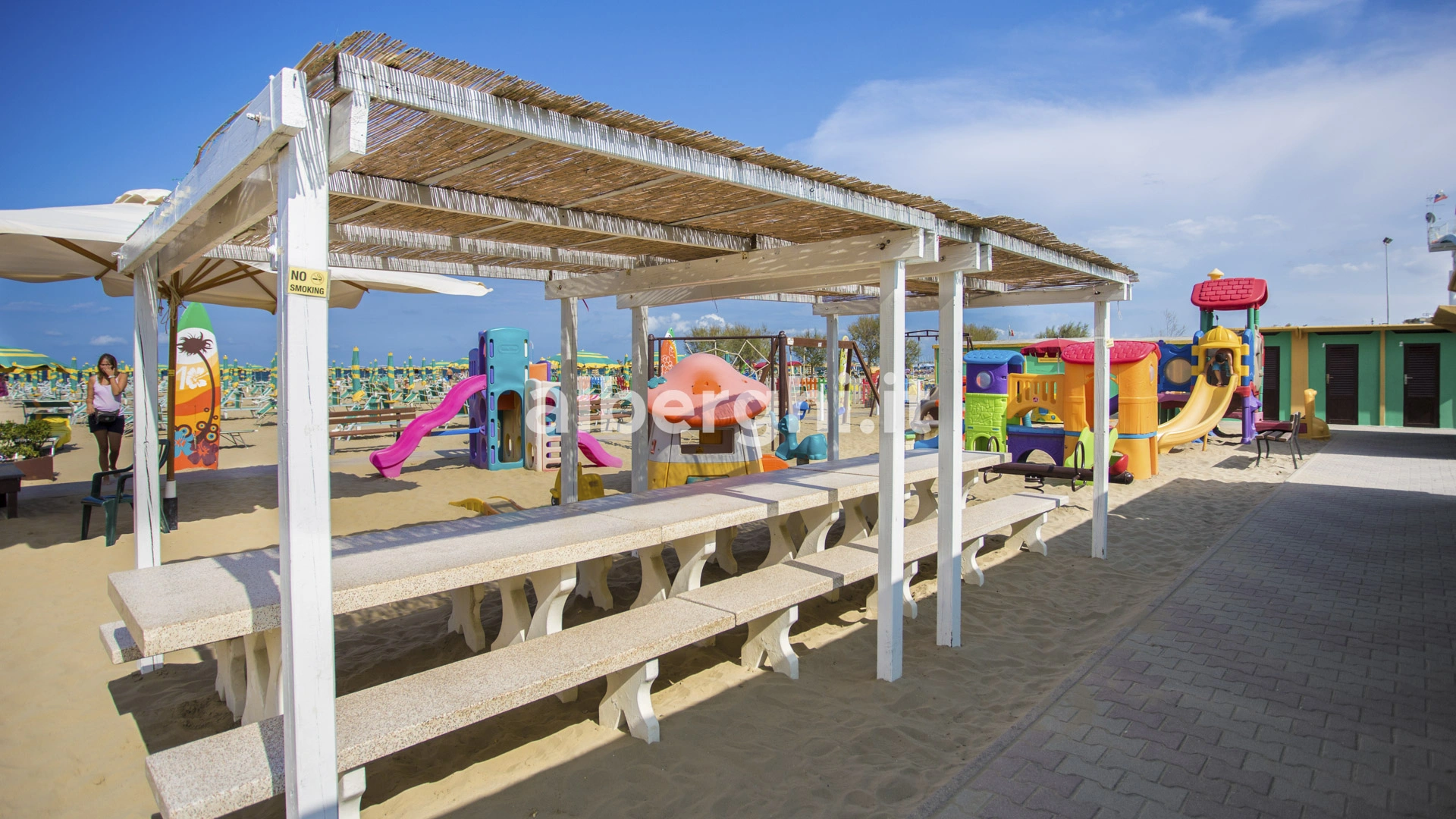 On the beach: play area, entertainment.