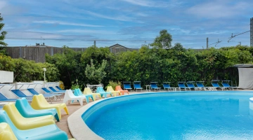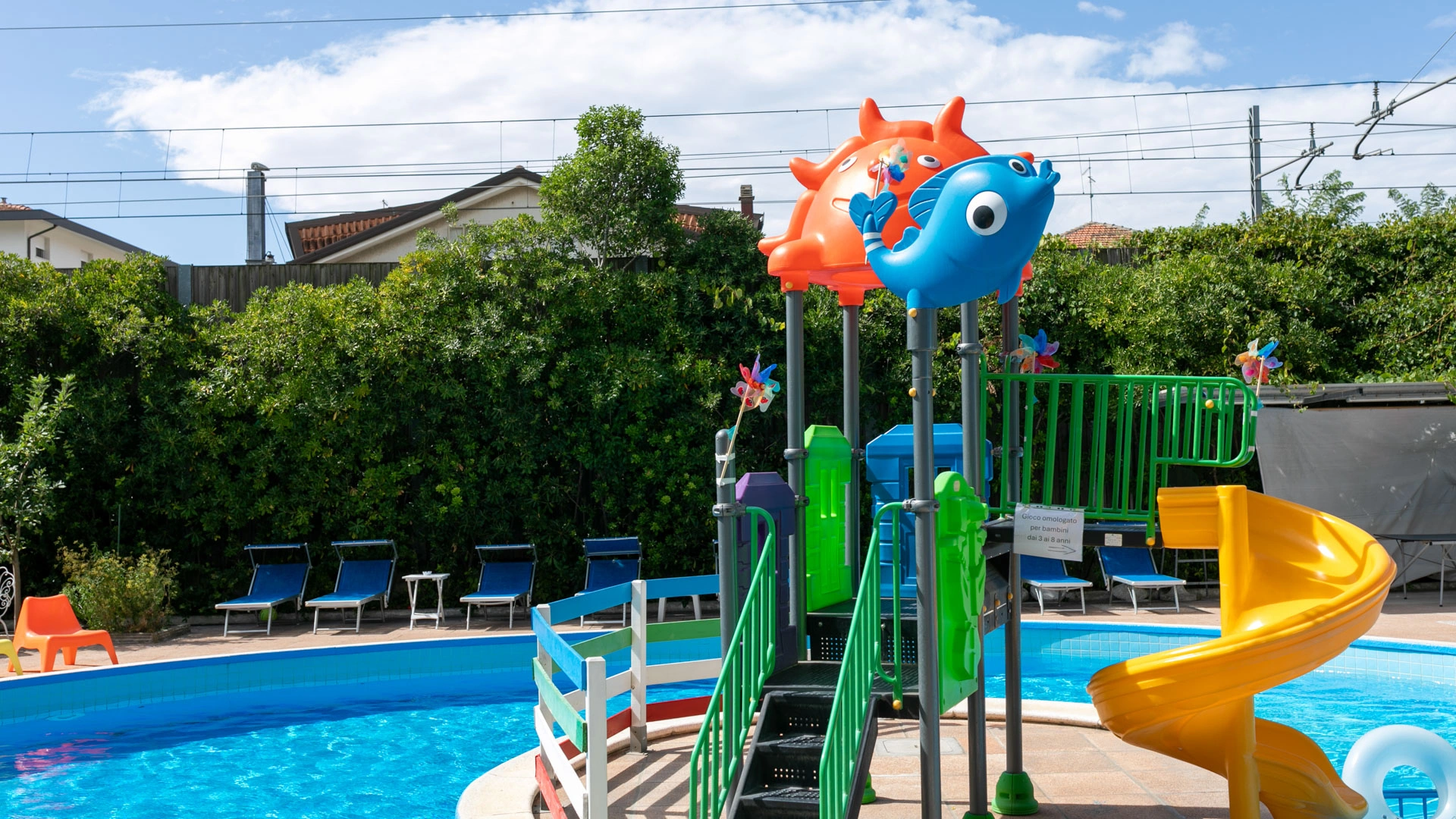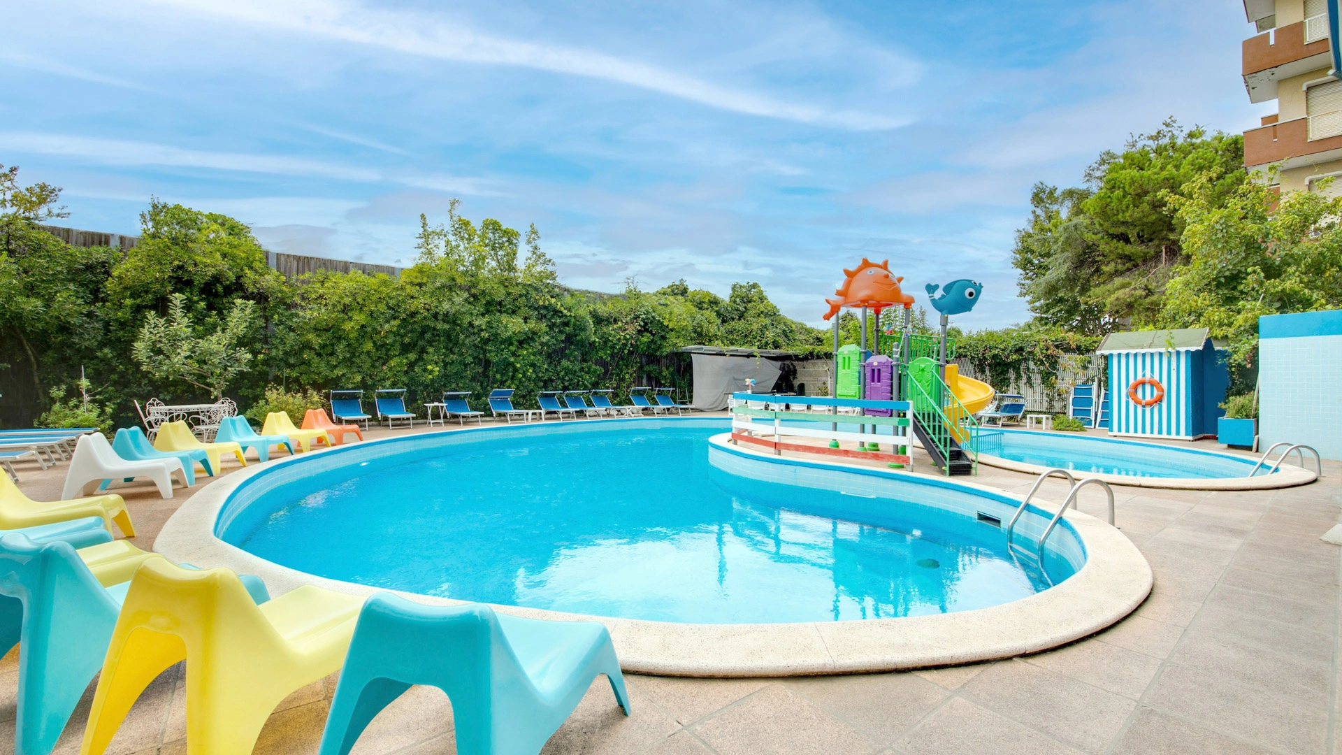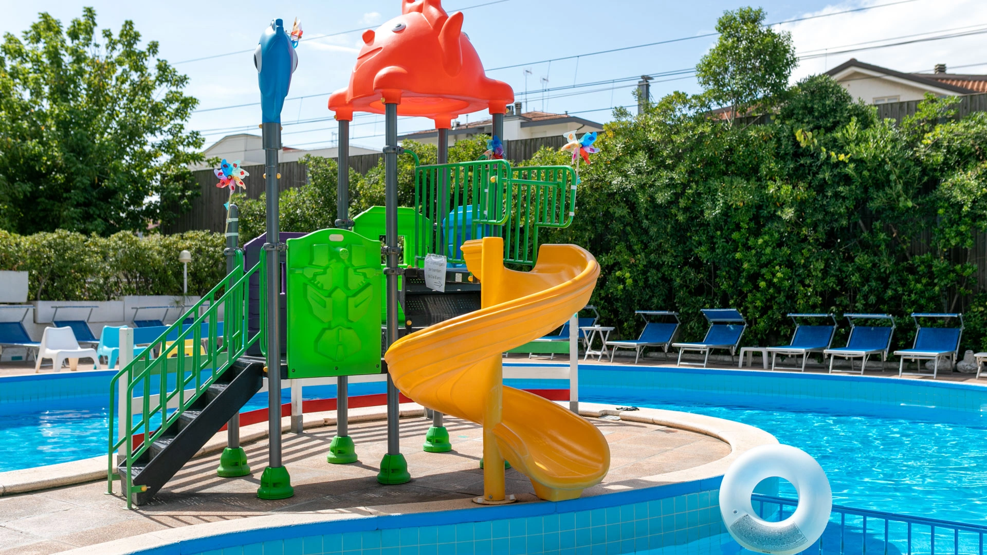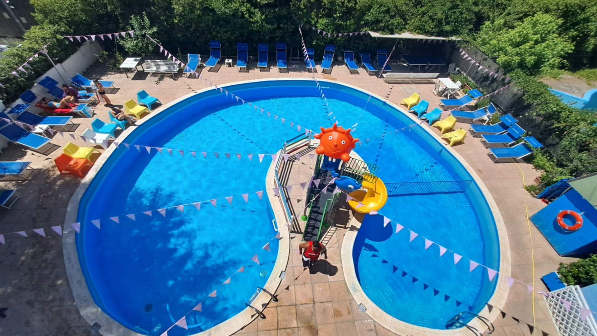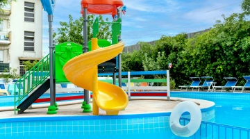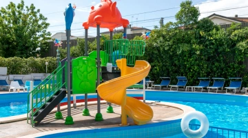 The large, 190-square-meter swimming pool with a slide, always in the sun, is surrounded by a solarium equipped with over 40 loungers. A well-defined 10-square-meter pool area is only 90 cm deep, allowing even the youngest children to have fun safely.