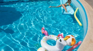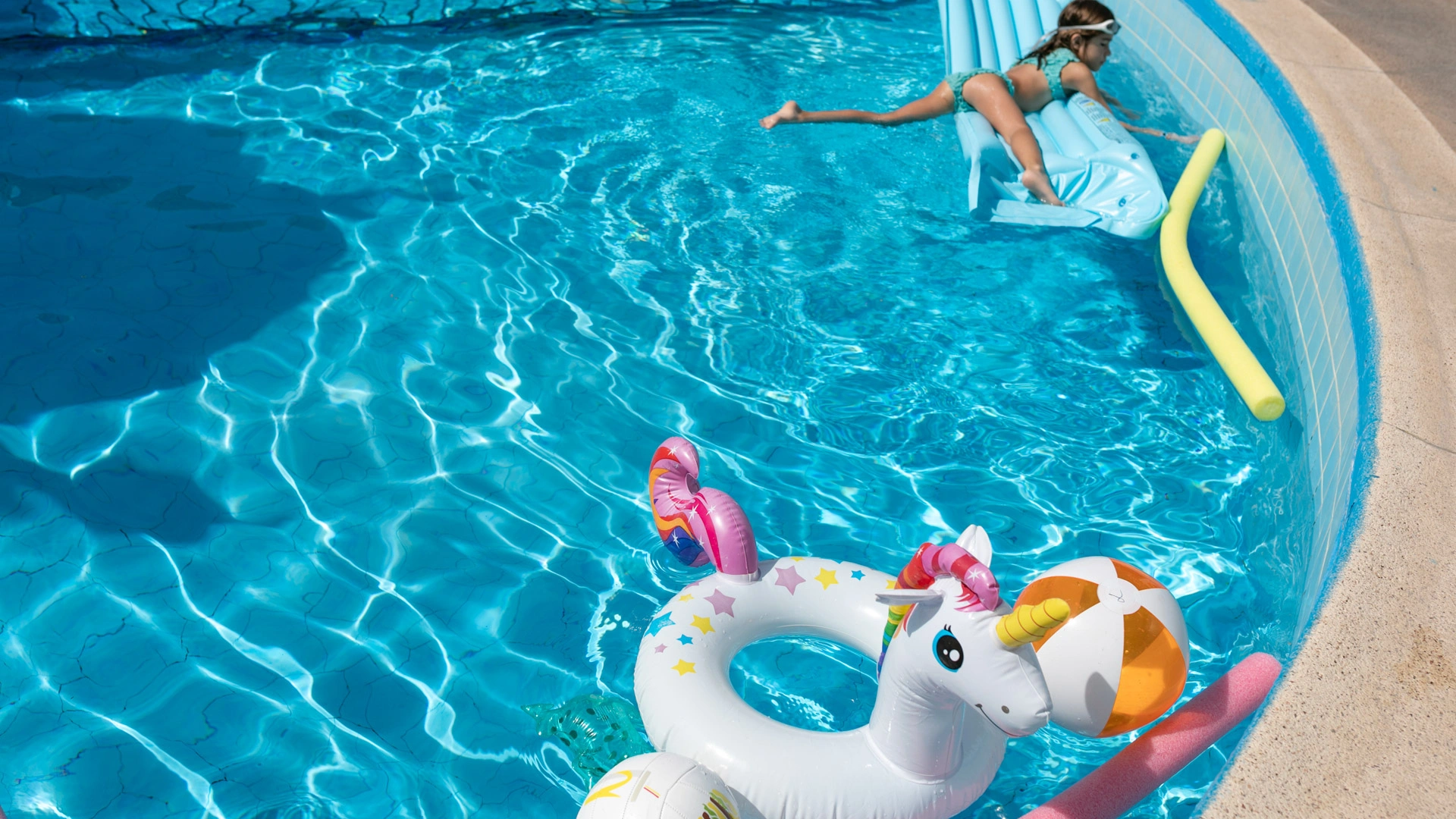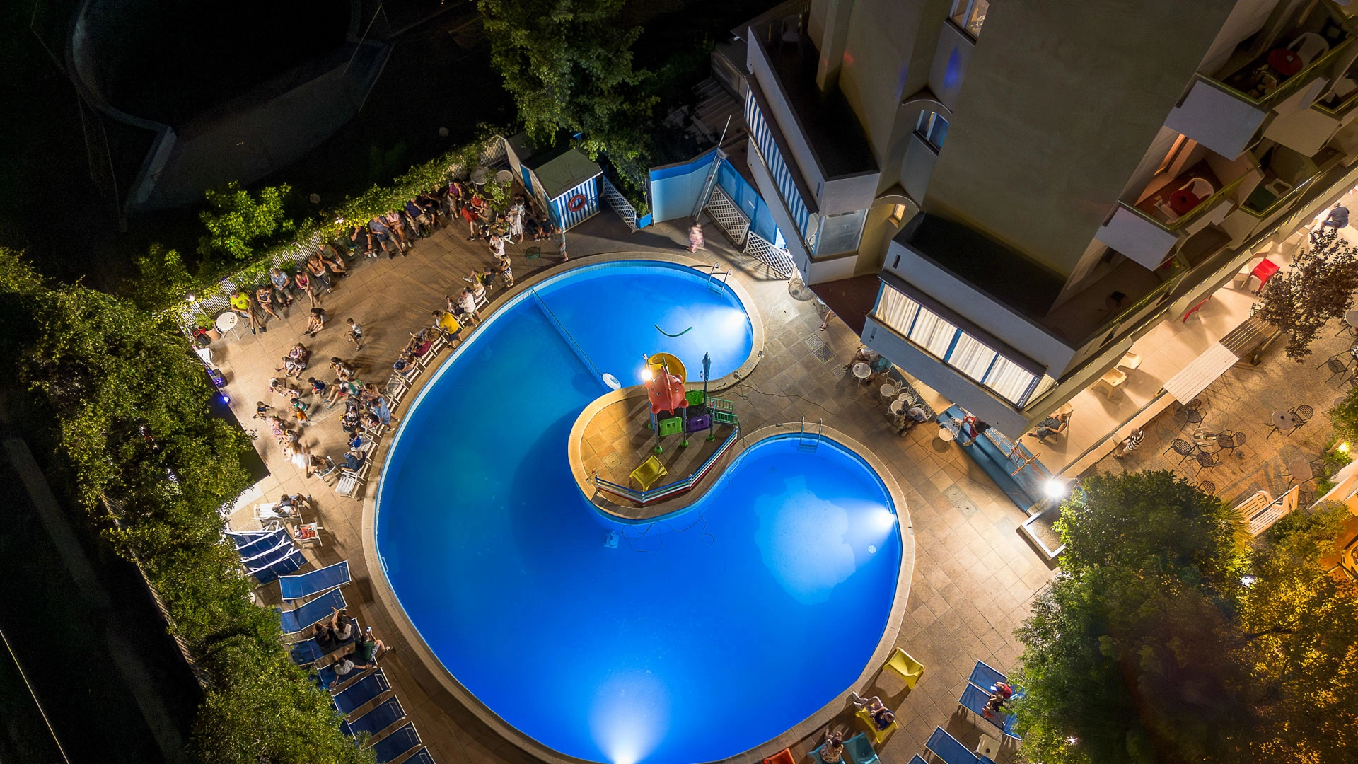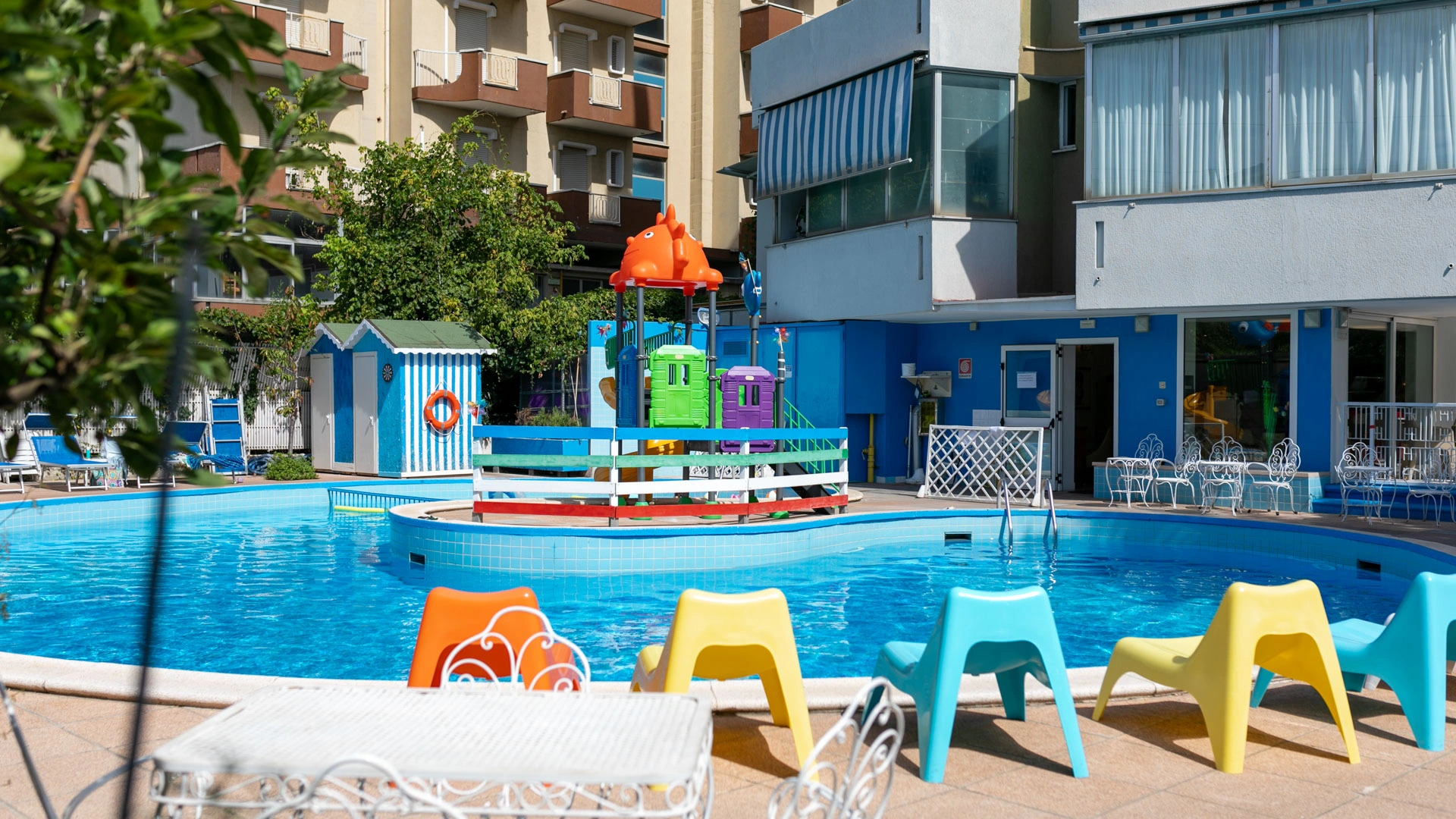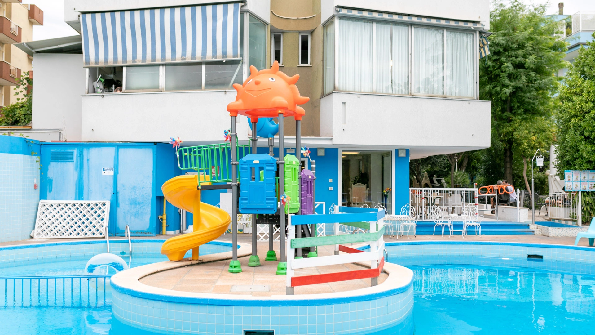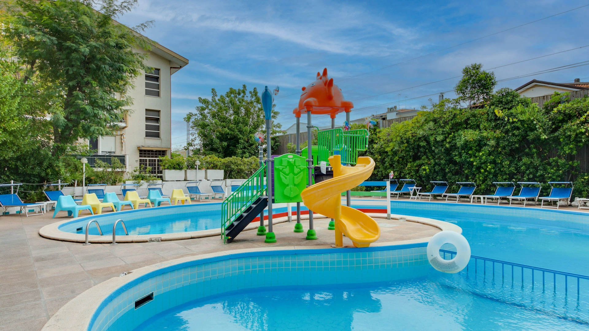 The large, 190-square-meter swimming pool with a slide, always in the sun, is surrounded by a solarium equipped with over 40 loungers. A well-defined 10-square-meter pool area is only 90 cm deep, allowing even the youngest children to have fun safely.