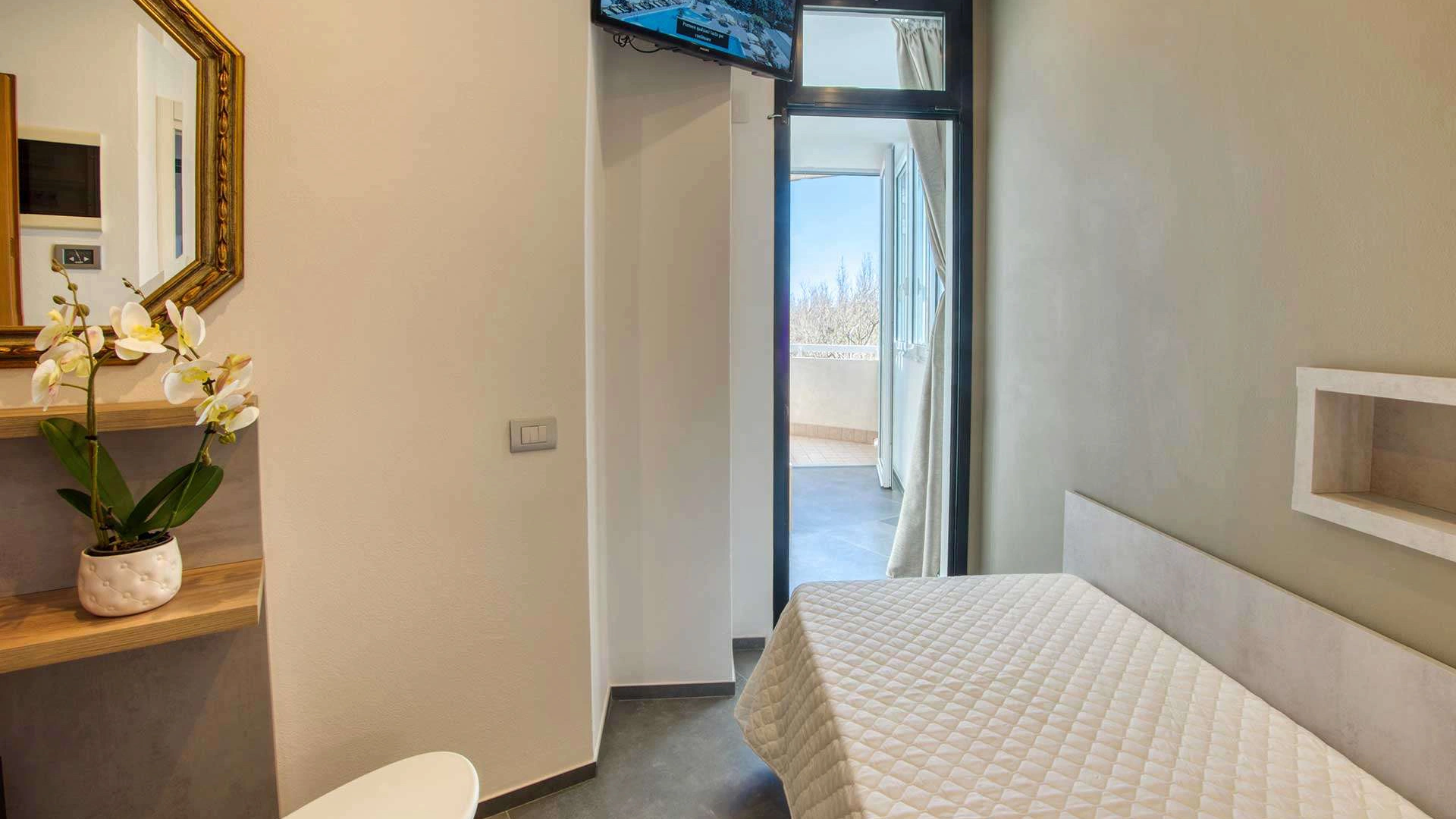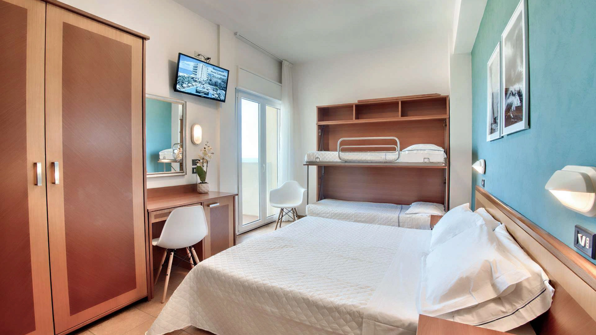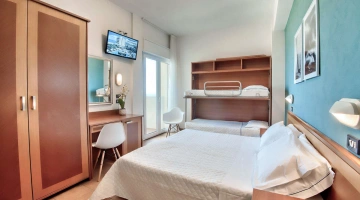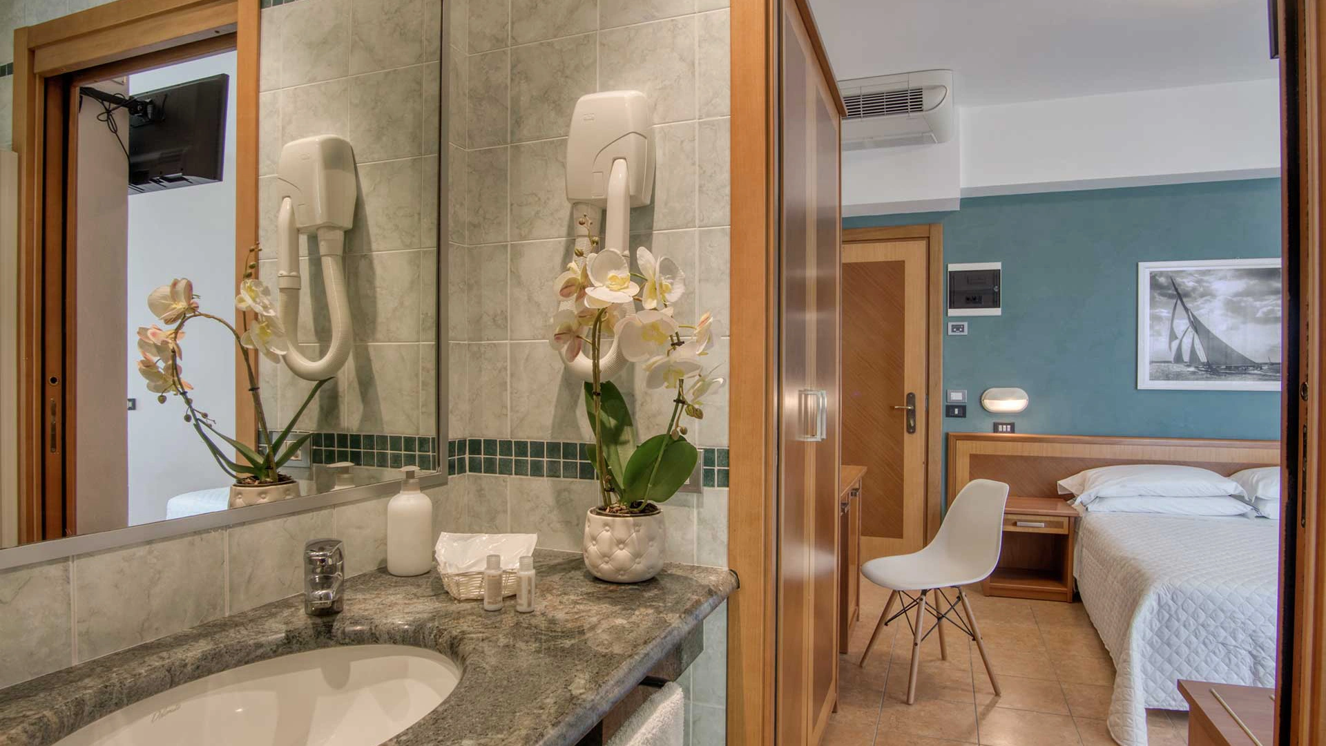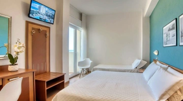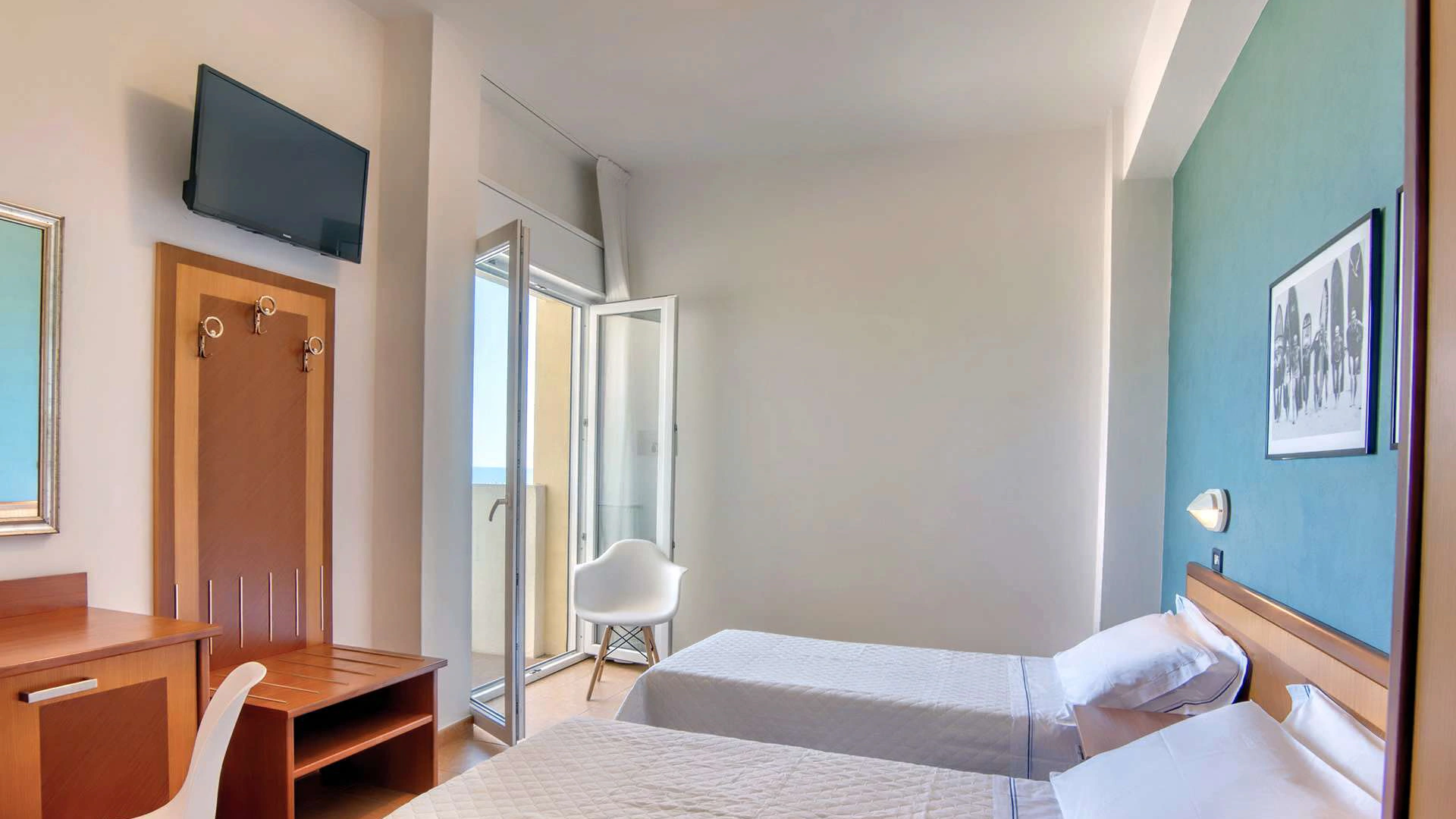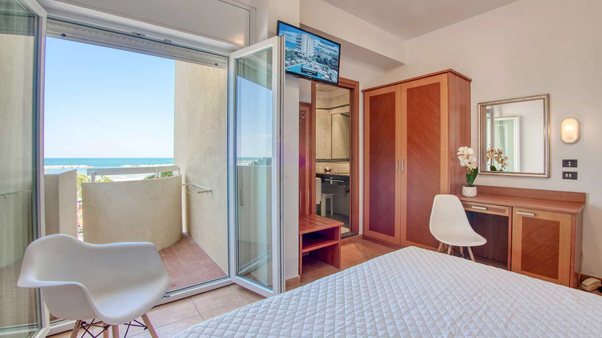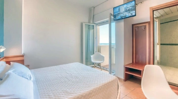 Modern, recently renovated rooms, all with sea-view balcony, 50 Mbit/s fiber Wi-Fi, individually controlled air conditioning, ceramic floors, mini fridge (not stocked), safe, 32" satellite TV, telephone, bathroom with shower box, toilet, bidet and hairdryer.