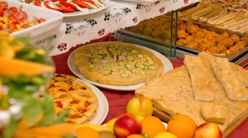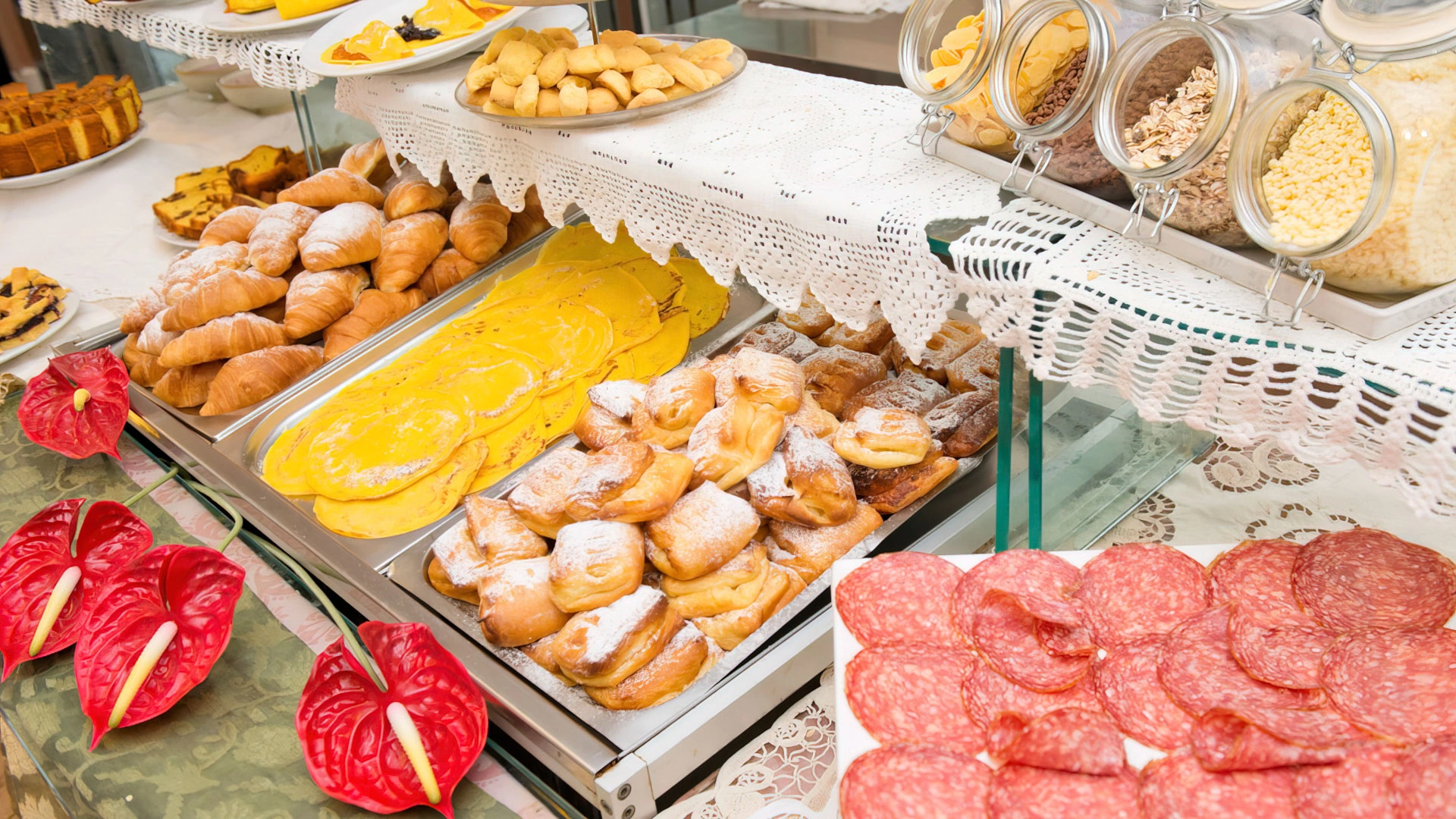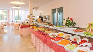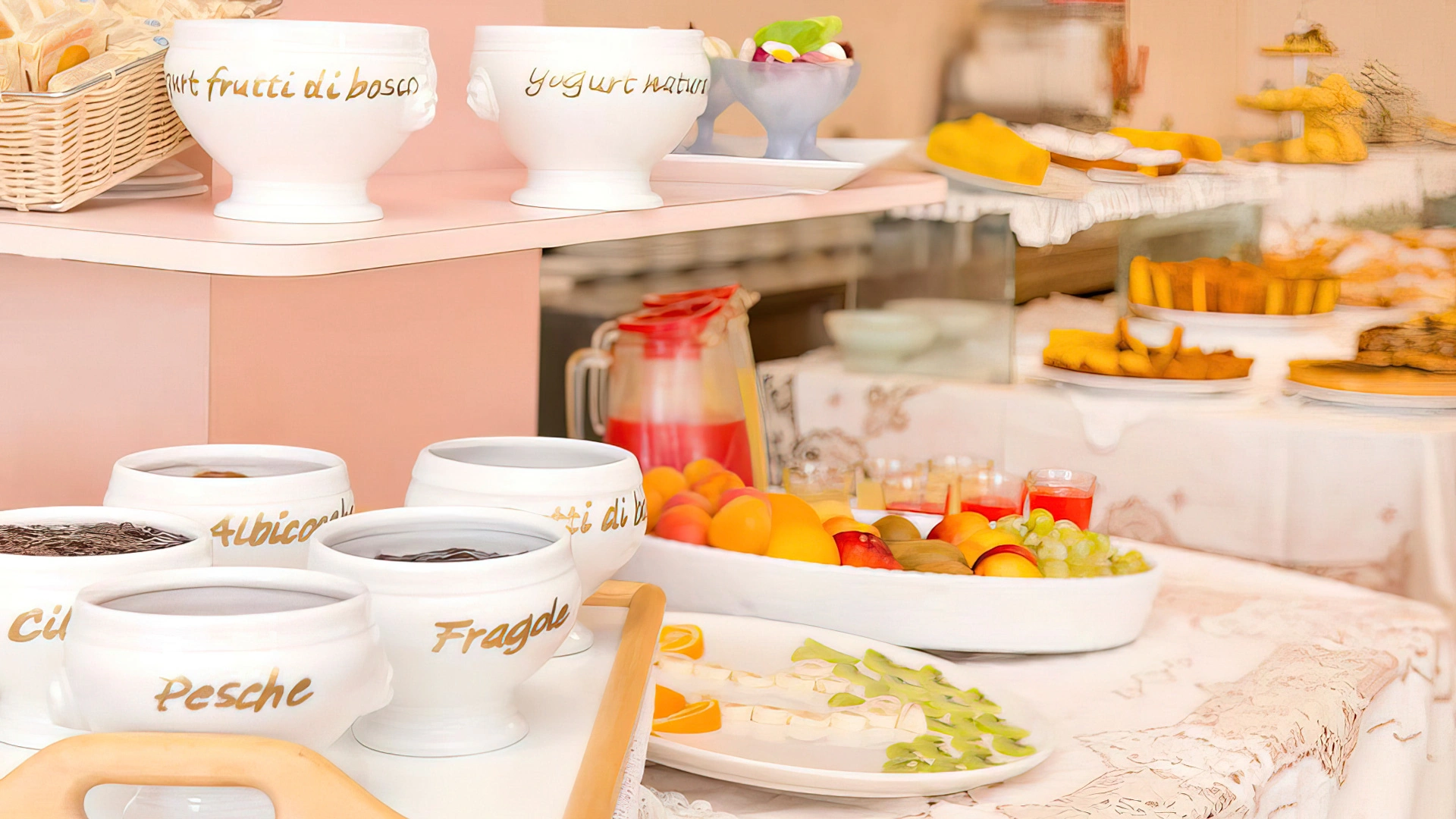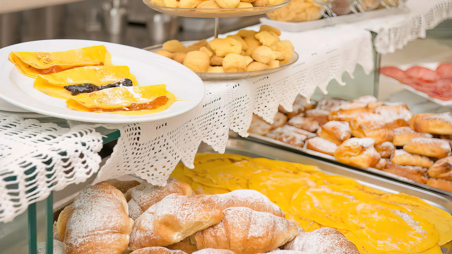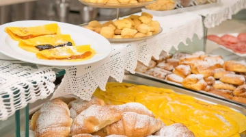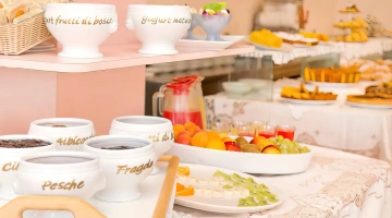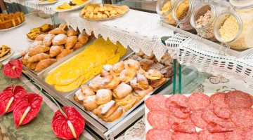 BREAKFAST: international buffet breakfast with croissants, crepes, homemade cakes and tarts, cold cuts, eggs, cheeses, frankfurters, cereals, yogurt, jams, Nutella, fruit juices, coffee drinks.