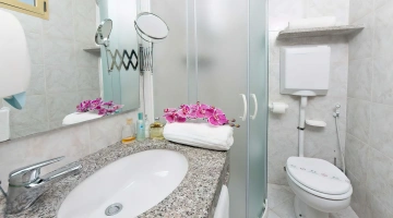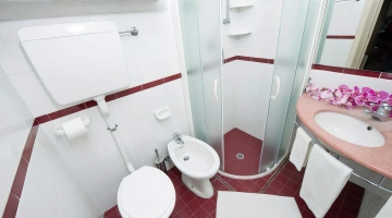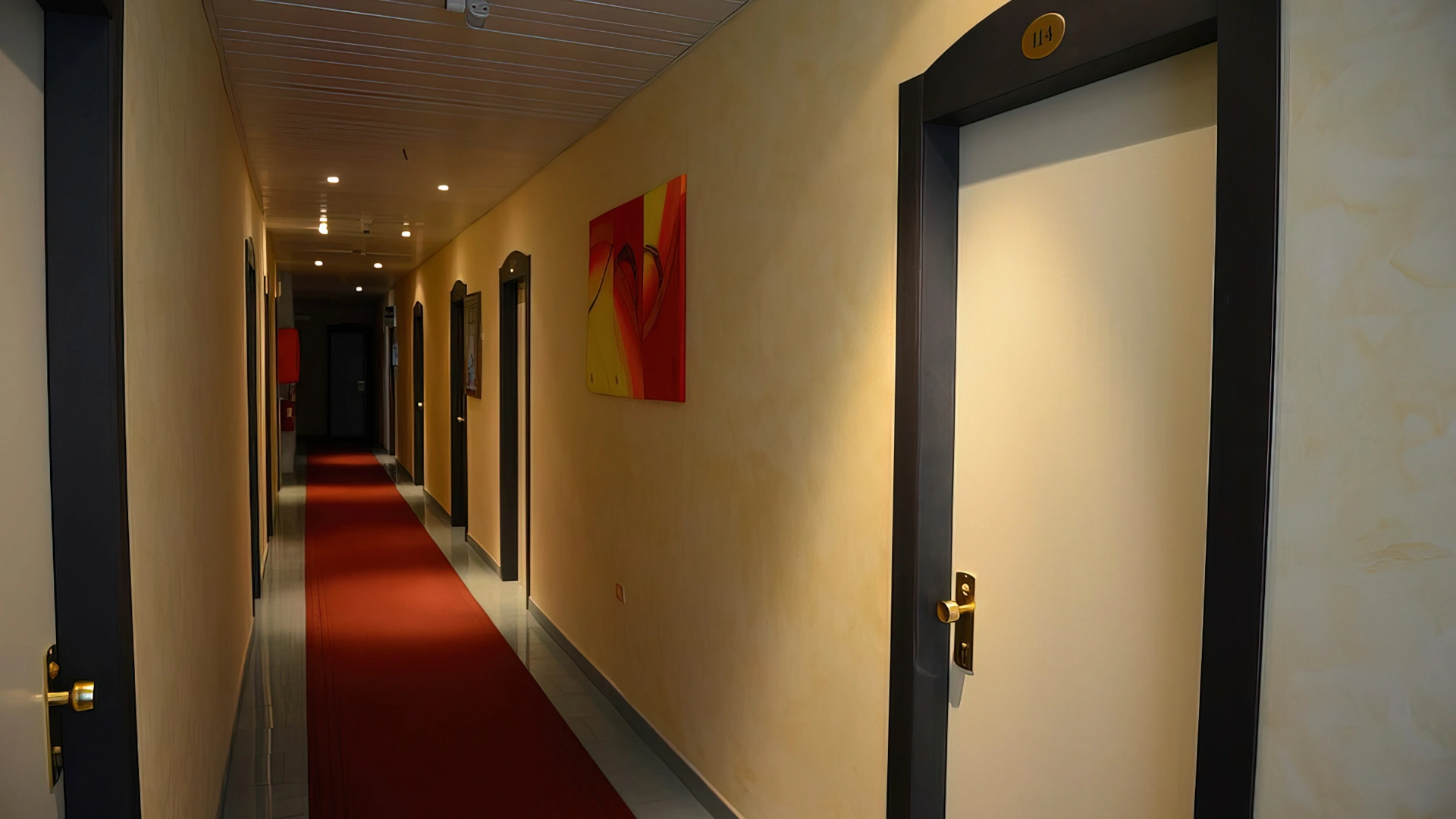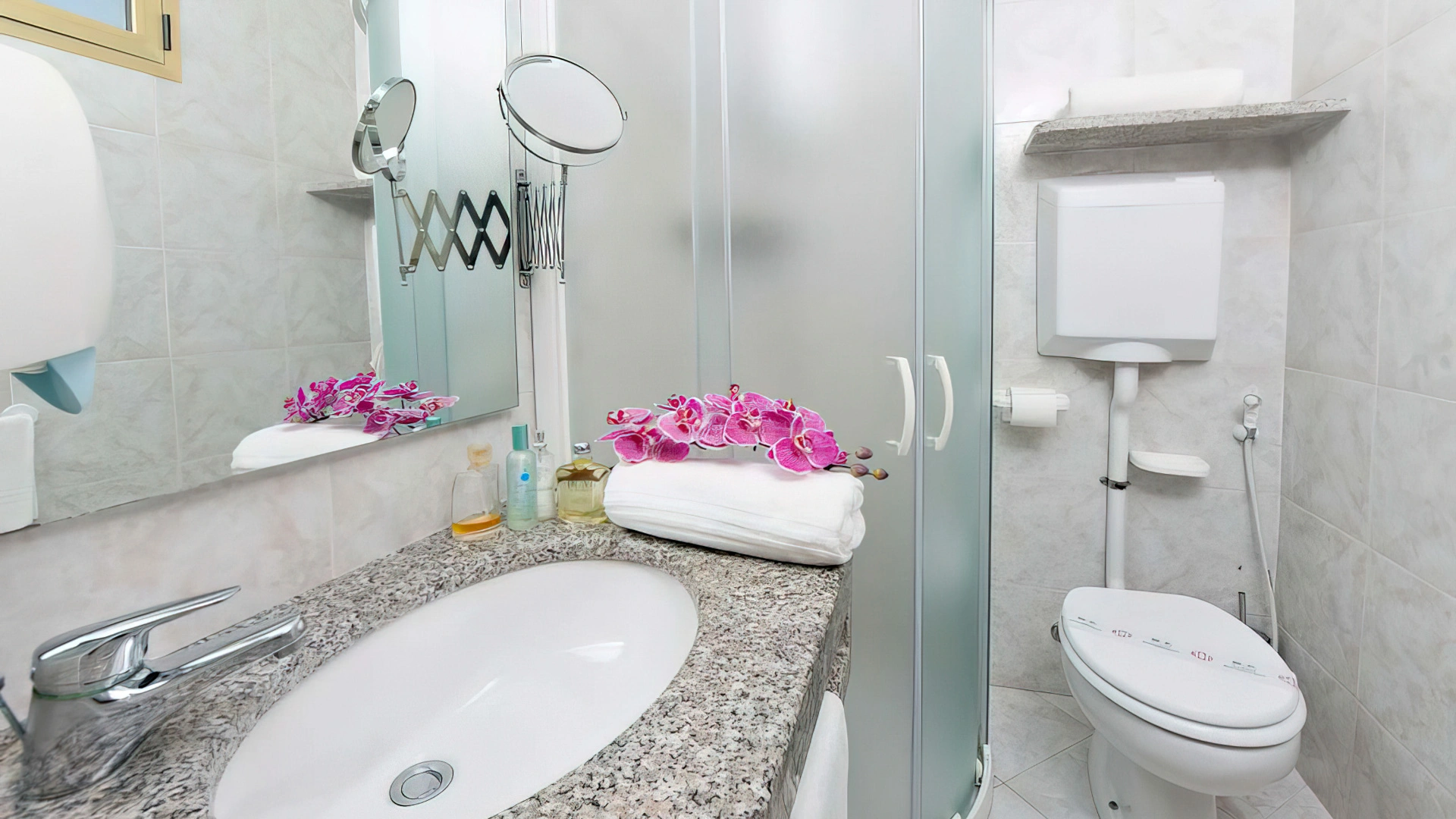The rooms are equipped with air conditioning and adjustable fan, satellite and digital terrestrial TV, refrigerator, 100 Mbit/s fiber Wi-Fi, electronic safe (paid service), telephone, intercom, "sommier" bed with container and orthopedic mattresses, electric shutters. Private bathroom with shower cubicle, courtesy set, hairdryer, cosmetic mirror.