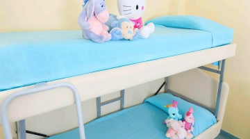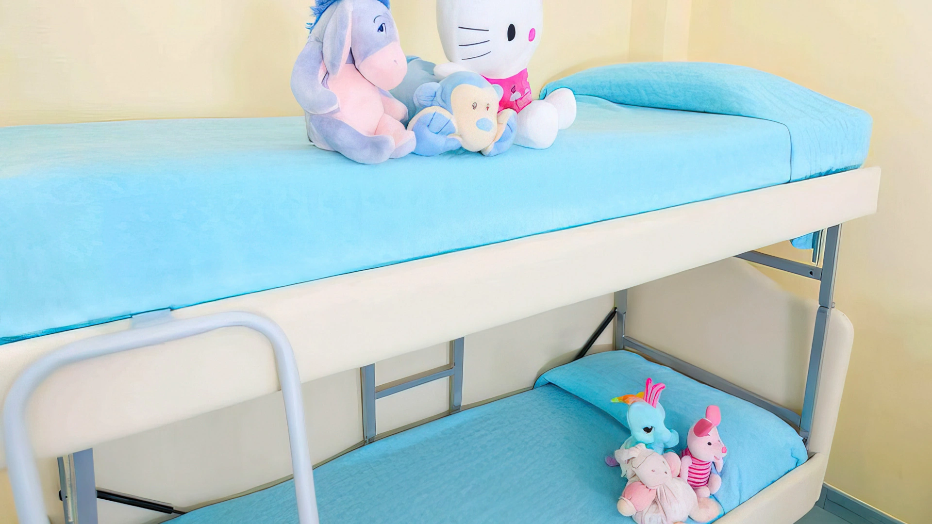 In the room: cots, camping beds, beds with a total protection bar, bunk beds with protections on all sides, refrigerator, baby bath tub, bottle warmer.
