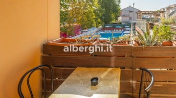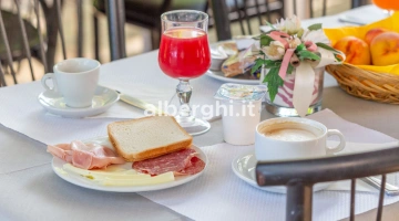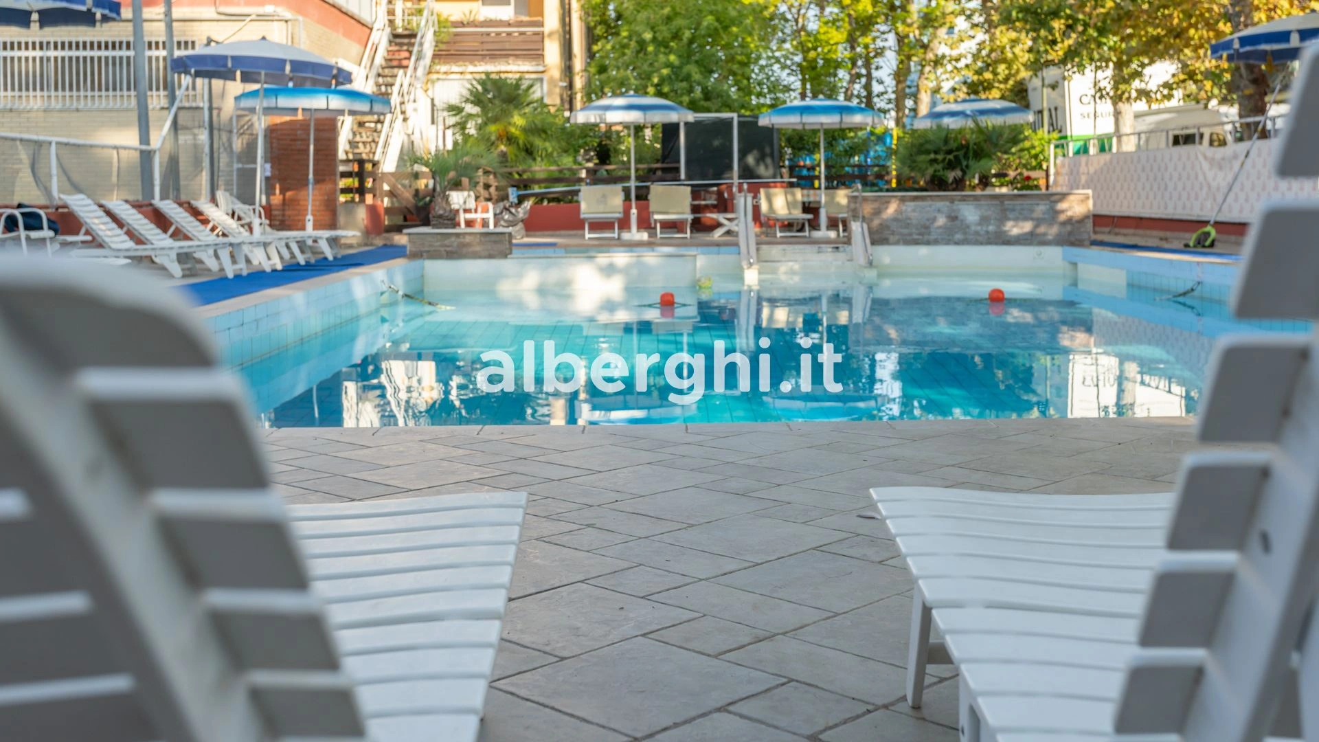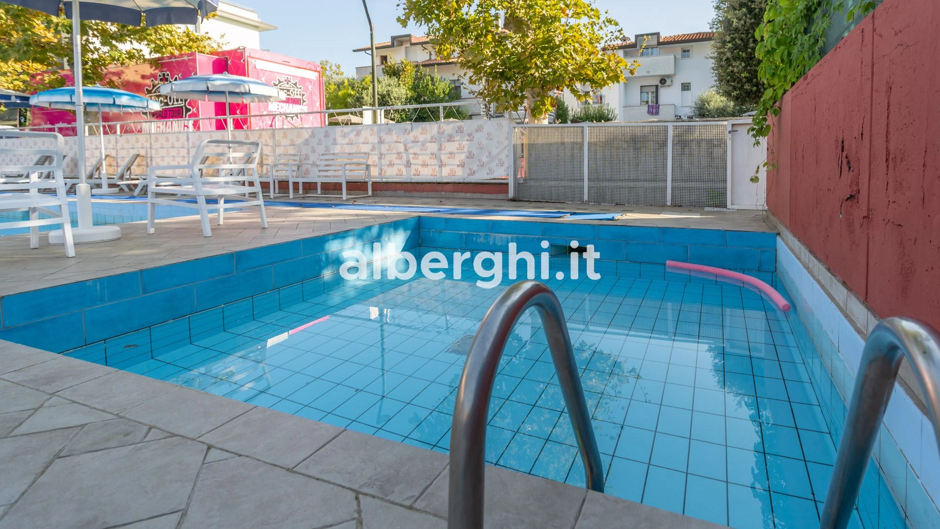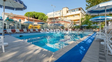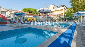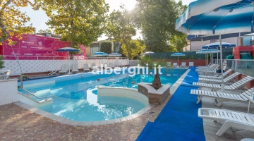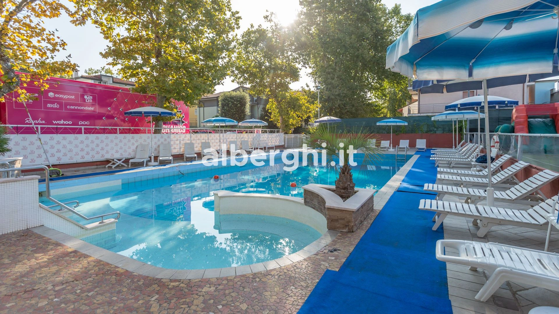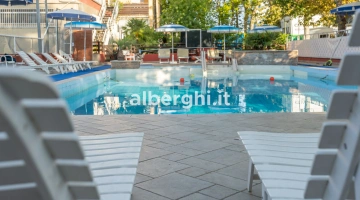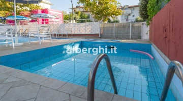 The swimming pool is located in the hotel park, 40 square meters large, is equipped with a solarium area, beach umbrella, sun loungers, a children's pool, a hydromassage area and a cervical waterfall. Aperitifs can be enjoyed by the pool.