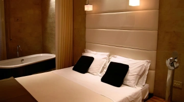 TECH: designer furnishings, open bathtub in room, sea view balcony on request, digital newsstand, bathrobe.