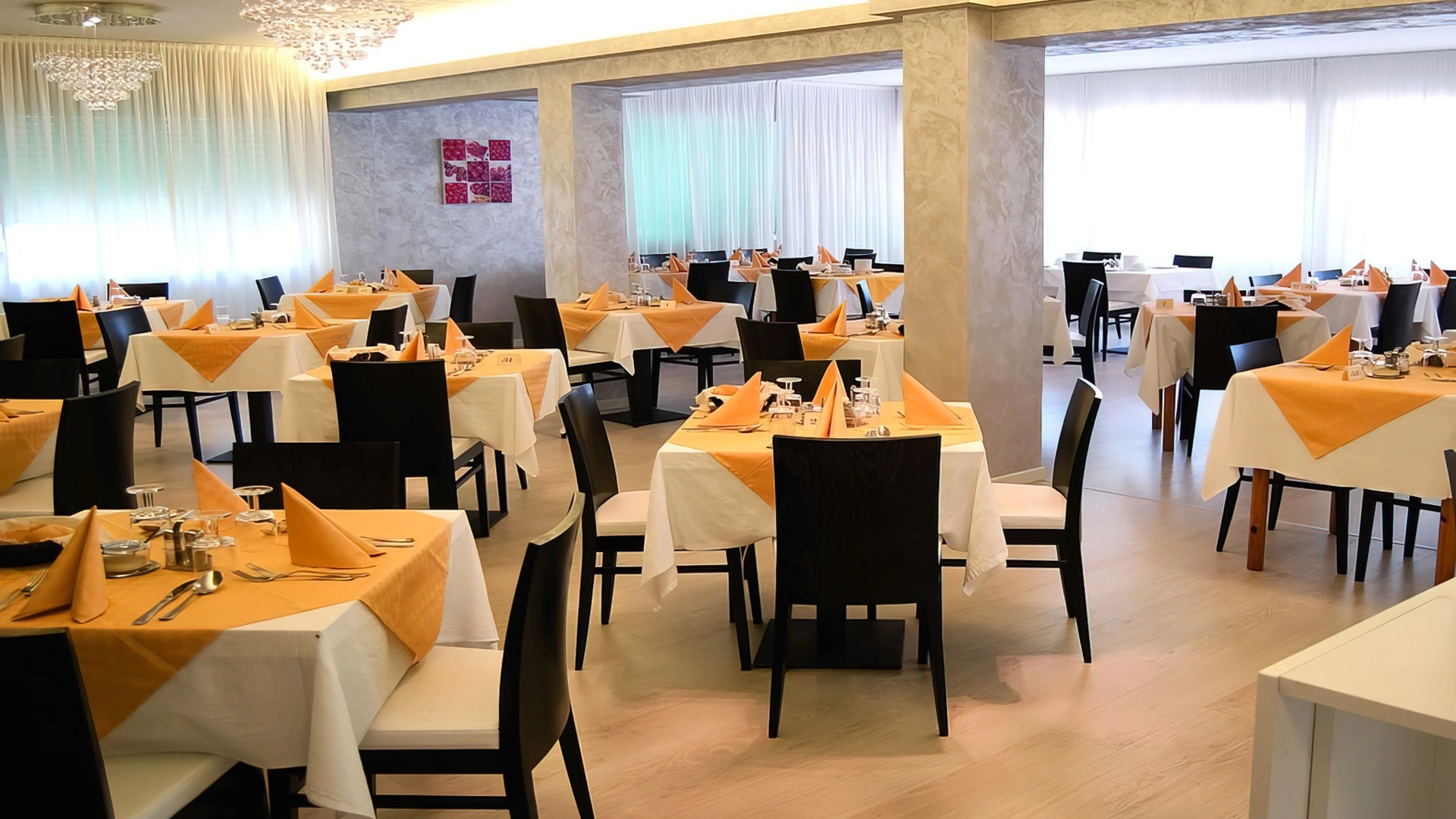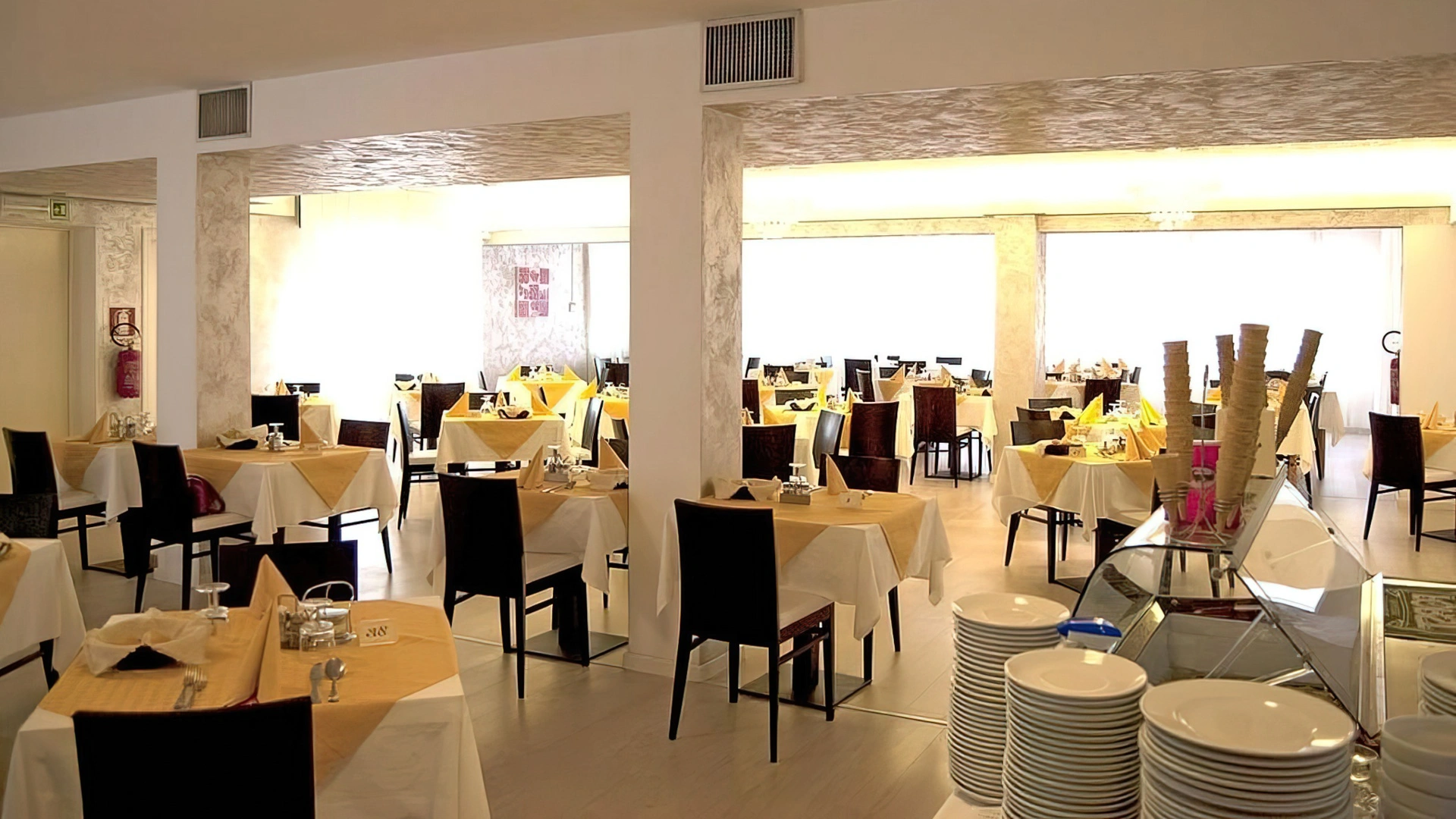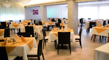 Breakfast is continental with a buffet of sweet and savory products. The on-site restaurant offers Italian and regional cuisine based on meat and fish, with packed lunches available and variations for food intolerances on request.