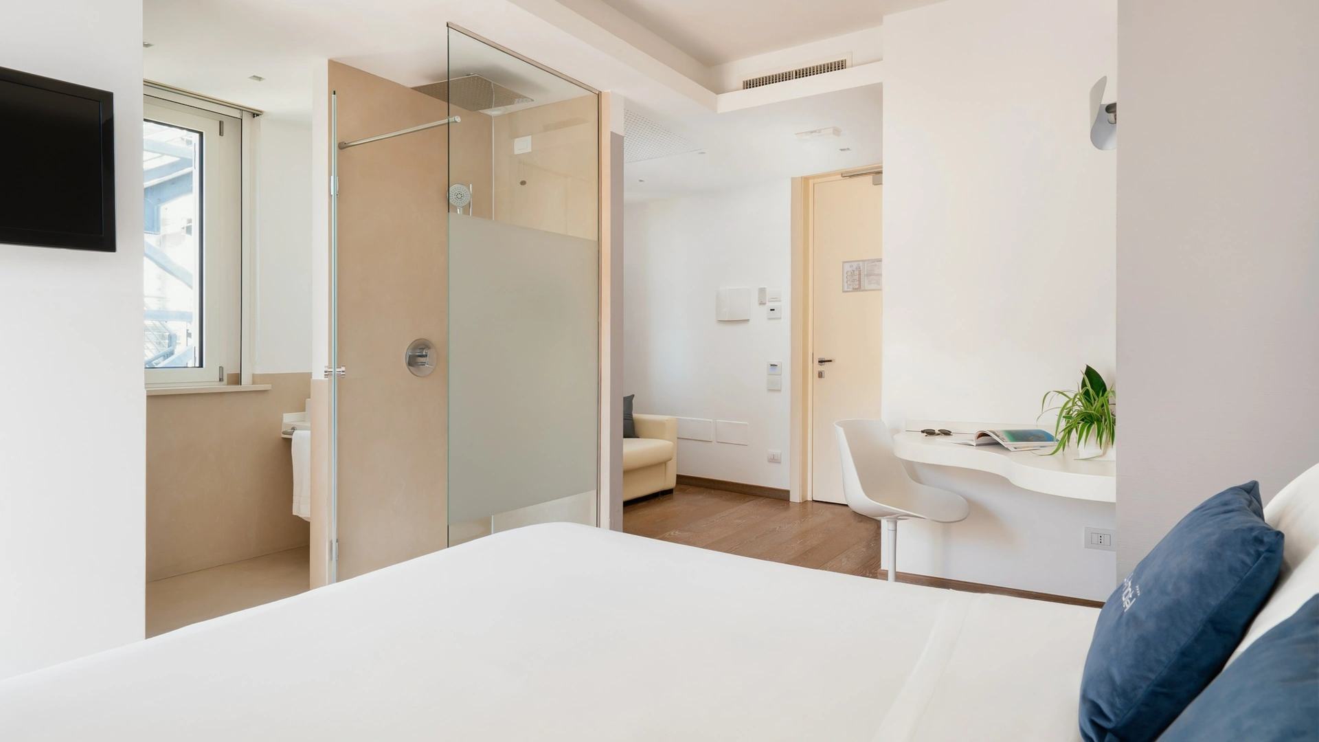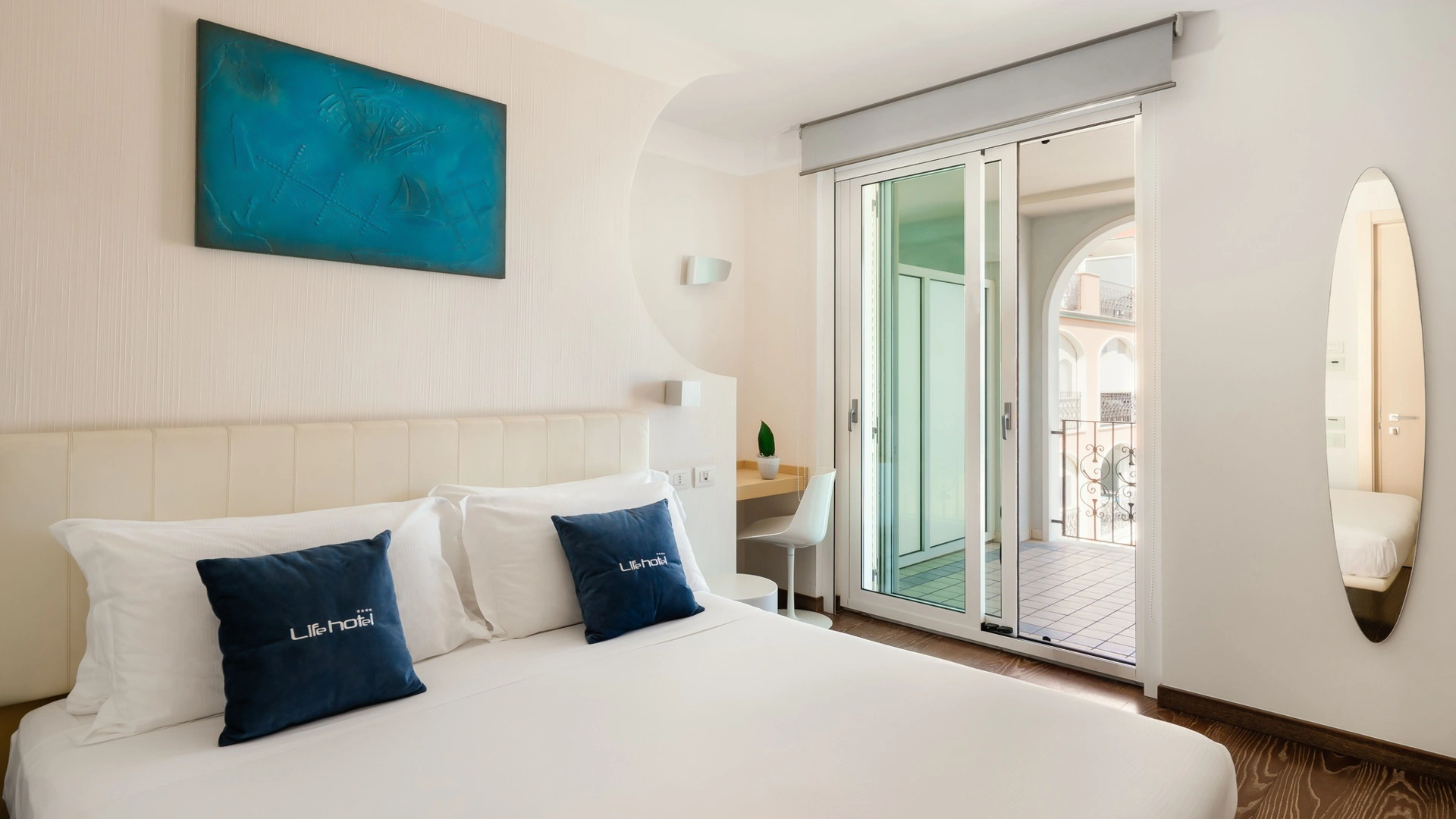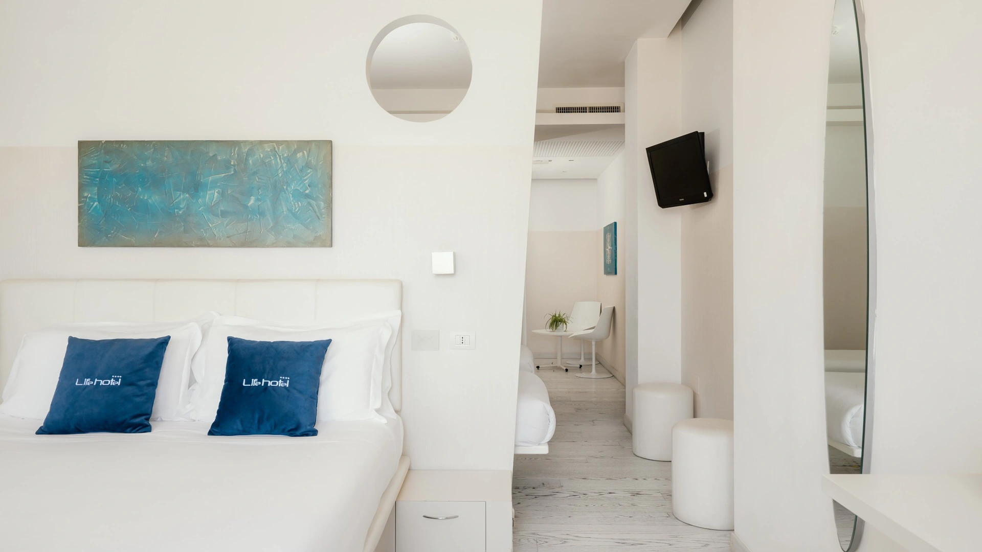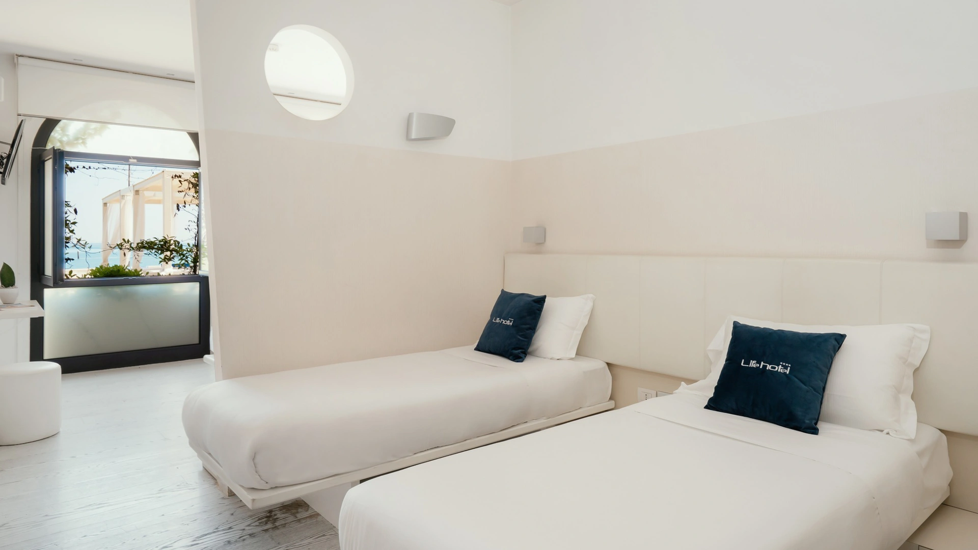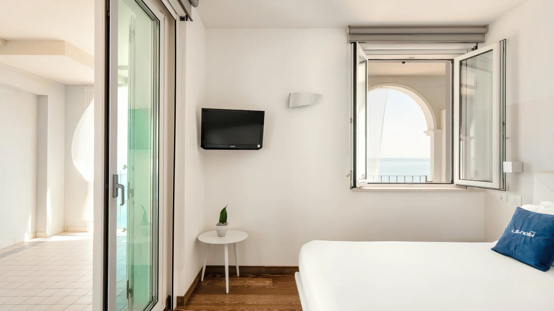 The hotel has rooms and suites, characterized by a minimalist and essential design. Able to accommodate up to 4 people, they are all equipped with a safe, LCD TV, minibar, free Wi-Fi and bathroom with complimentary toiletries, hairdryer and shower. Many rooms have a balcony and sea view. The suites have a living area with a sofa bed and a large furnished terrace.