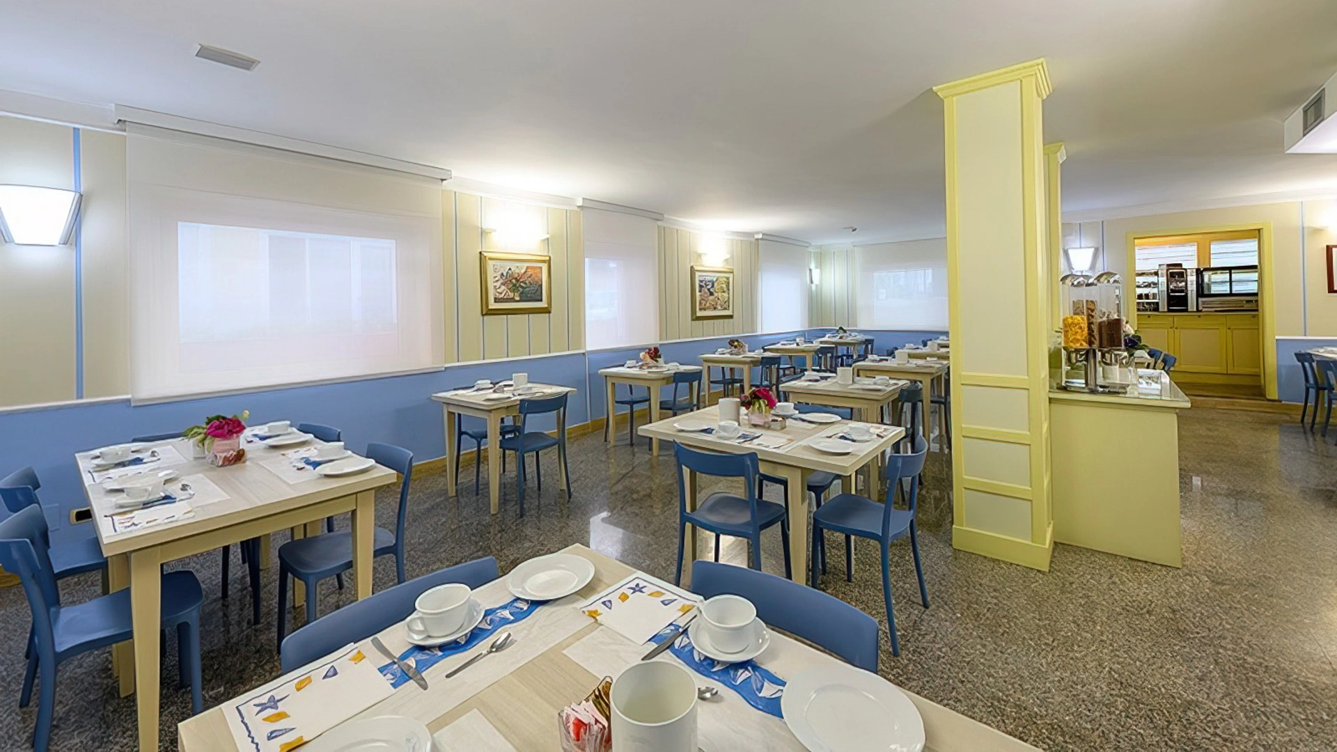 The breakfast room hosts a buffet with sweet and savory foods every morning.