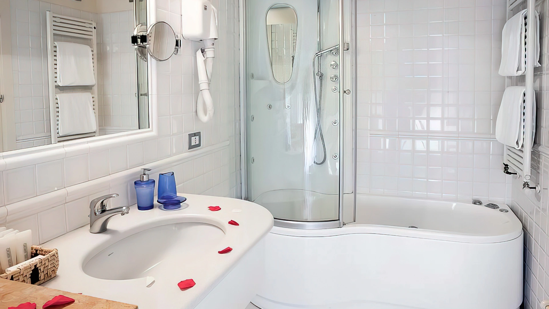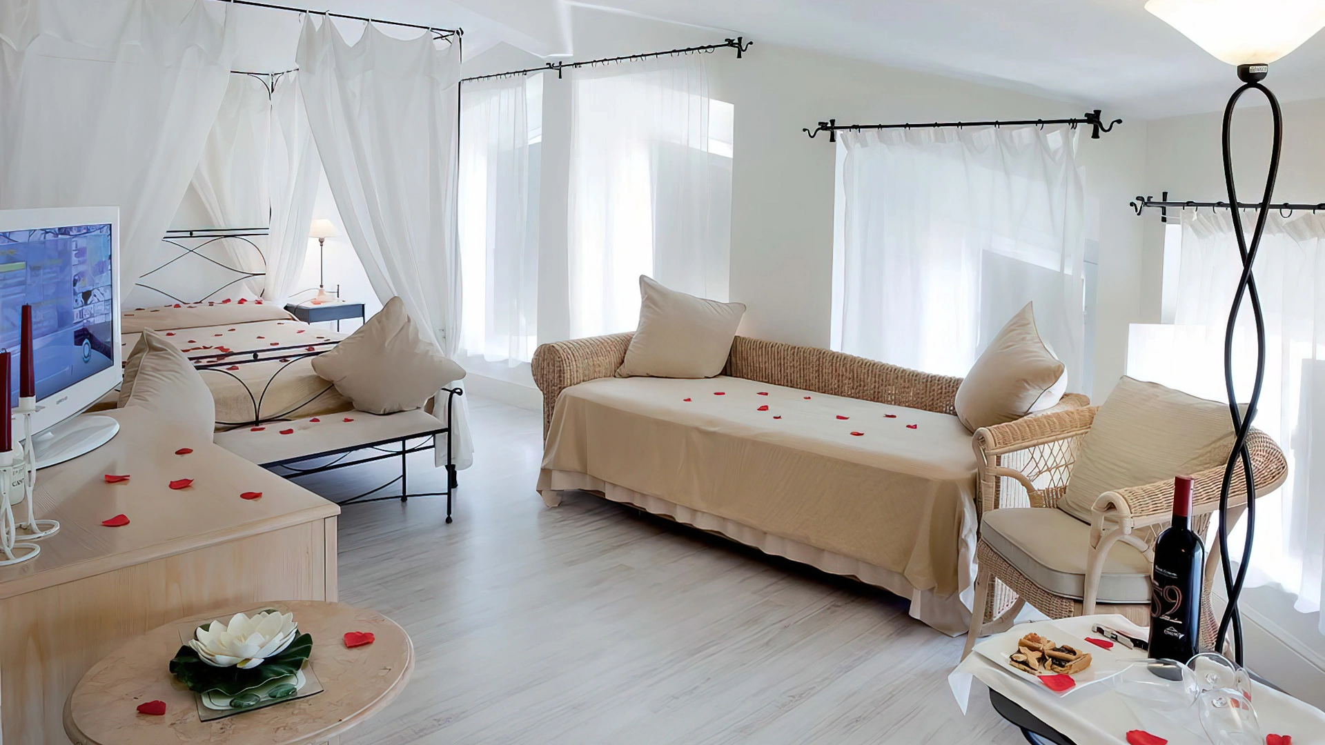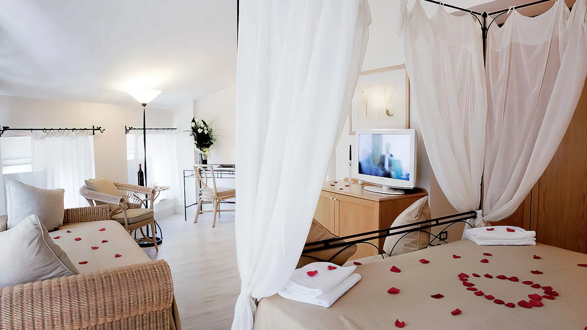 The rooms offer modern and functional comforts, including LCD TV, air conditioning, free Wi-Fi, safe, minibar and private bathroom with shower, courtesy set and hairdryer. Some rooms have a balcony equipped with umbrella and deckchair, others include a sofa bed for greater versatility, while the most elegant are enriched by a sitting area and a four-poster bed.