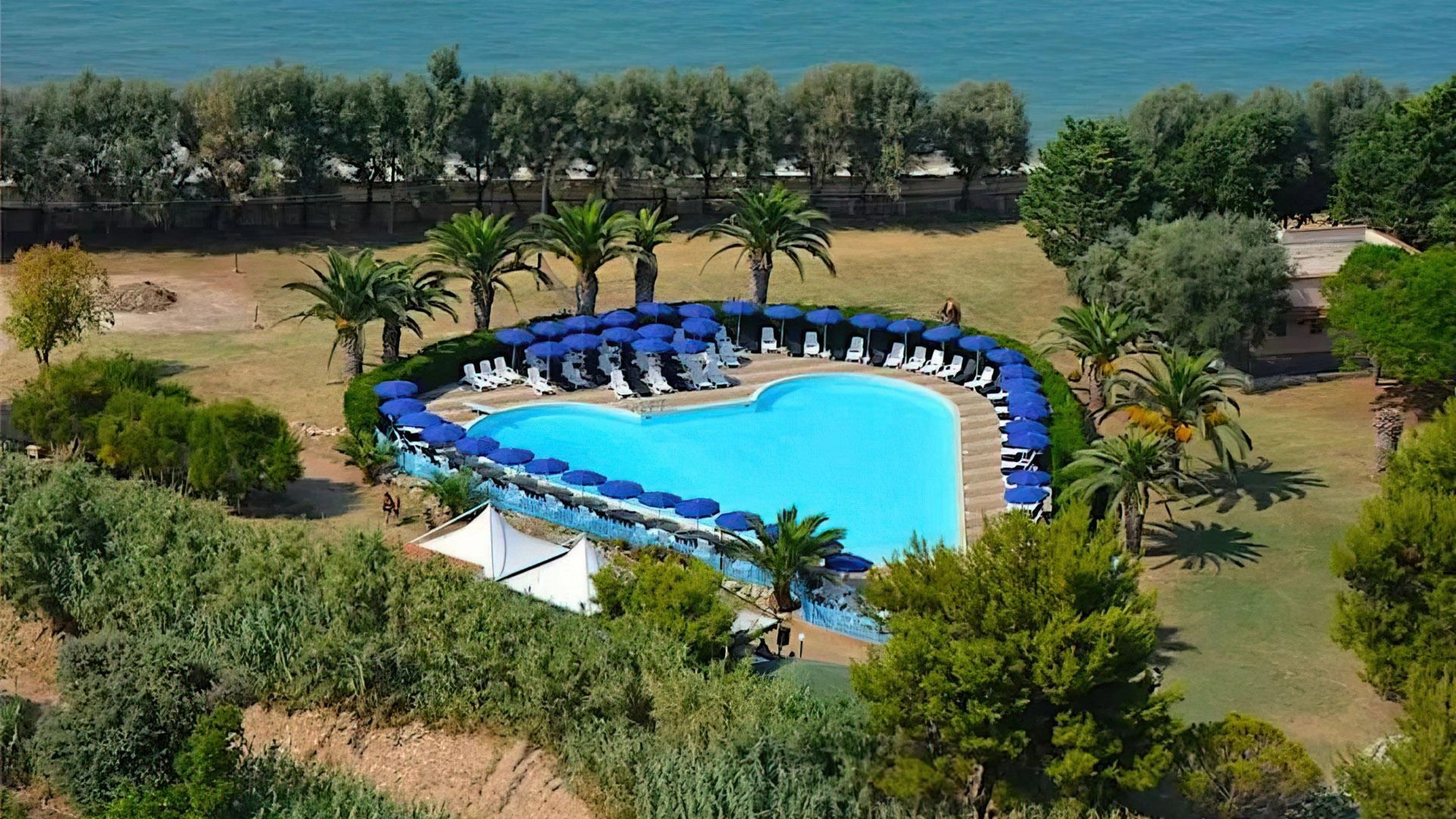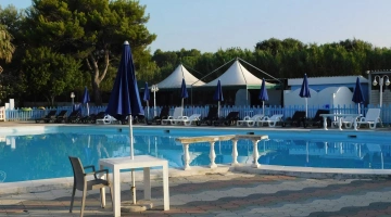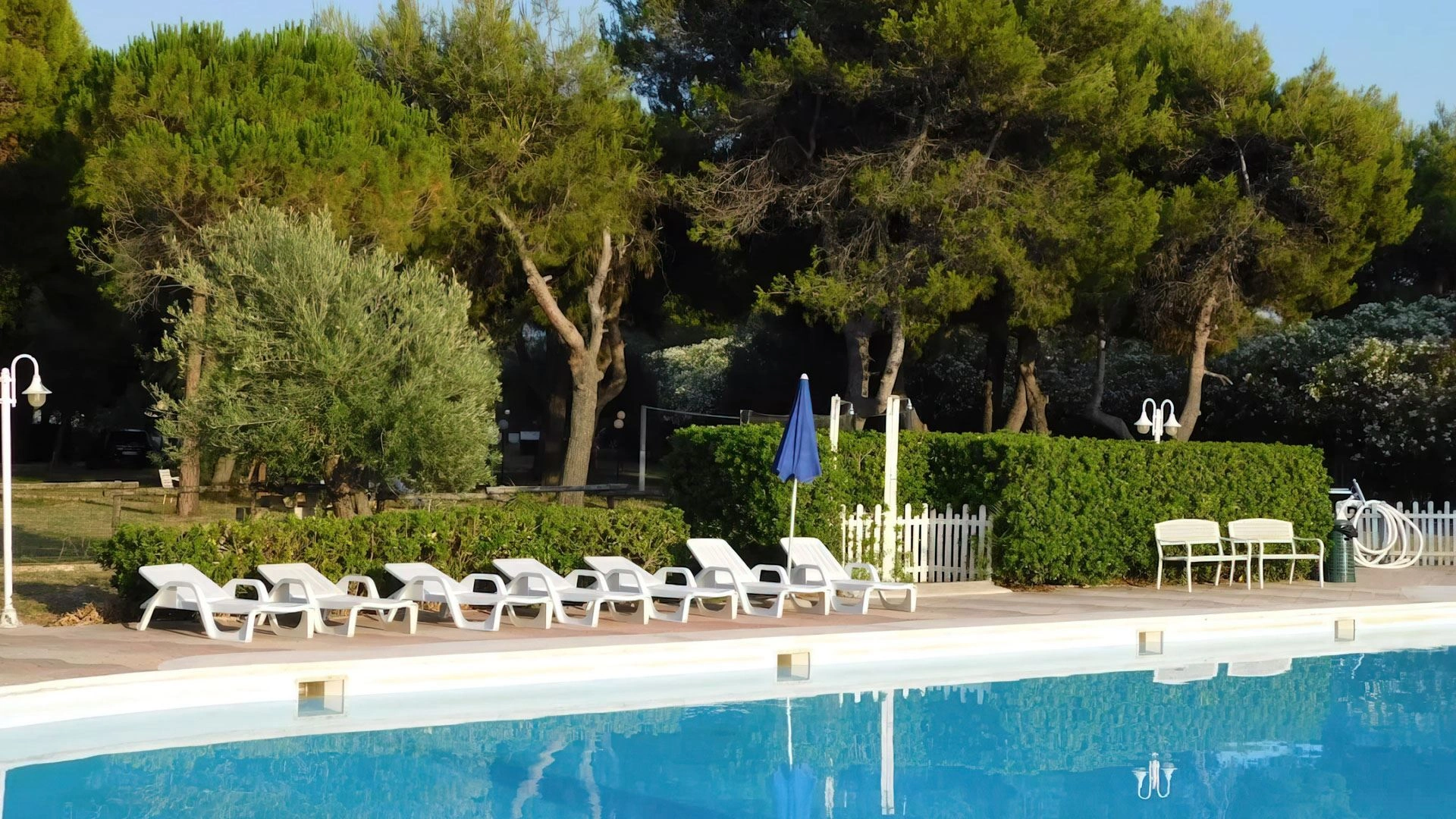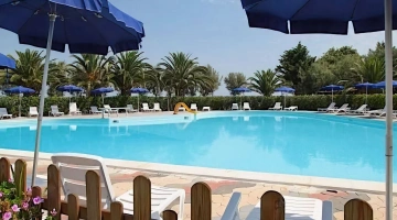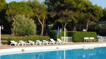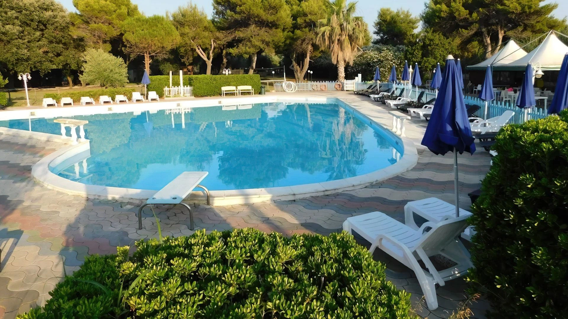 Surrounded by greenery within the residence area there is a heart-shaped swimming pool accessible to all ages. The surrounding area is used as a solarium with sunbeds and umbrellas. Rescue service present.