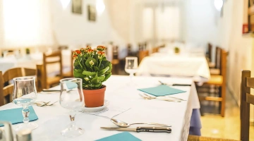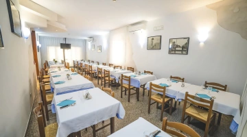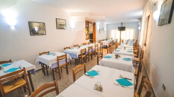The continental breakfast is served as a buffet with sweet and savory options. The restaurant offers dishes inspired by traditional regional recipes based on meat and fish.