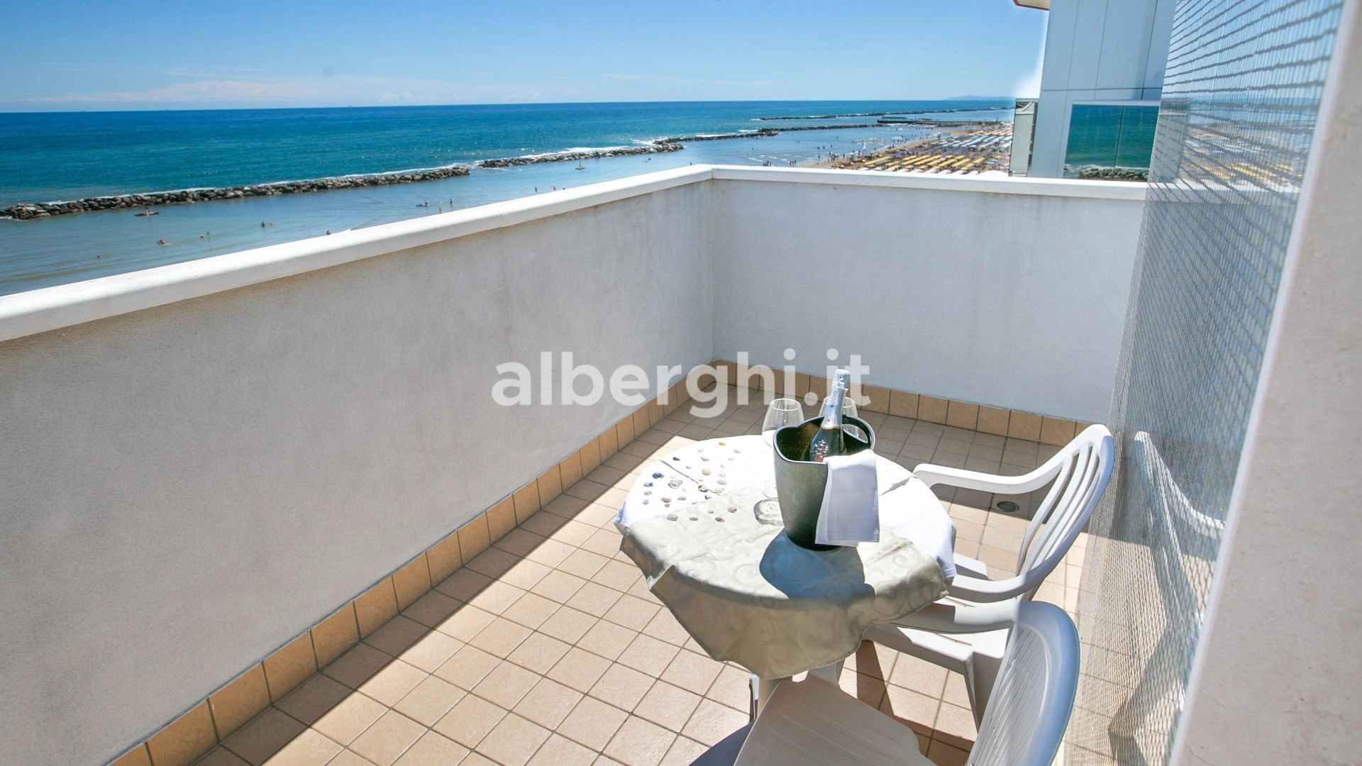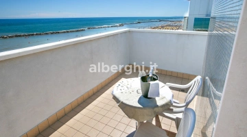 FRONT DE MER SUPÉRIEUR: grand balcon équipé de chaises et table; vue frontale sur la mer.