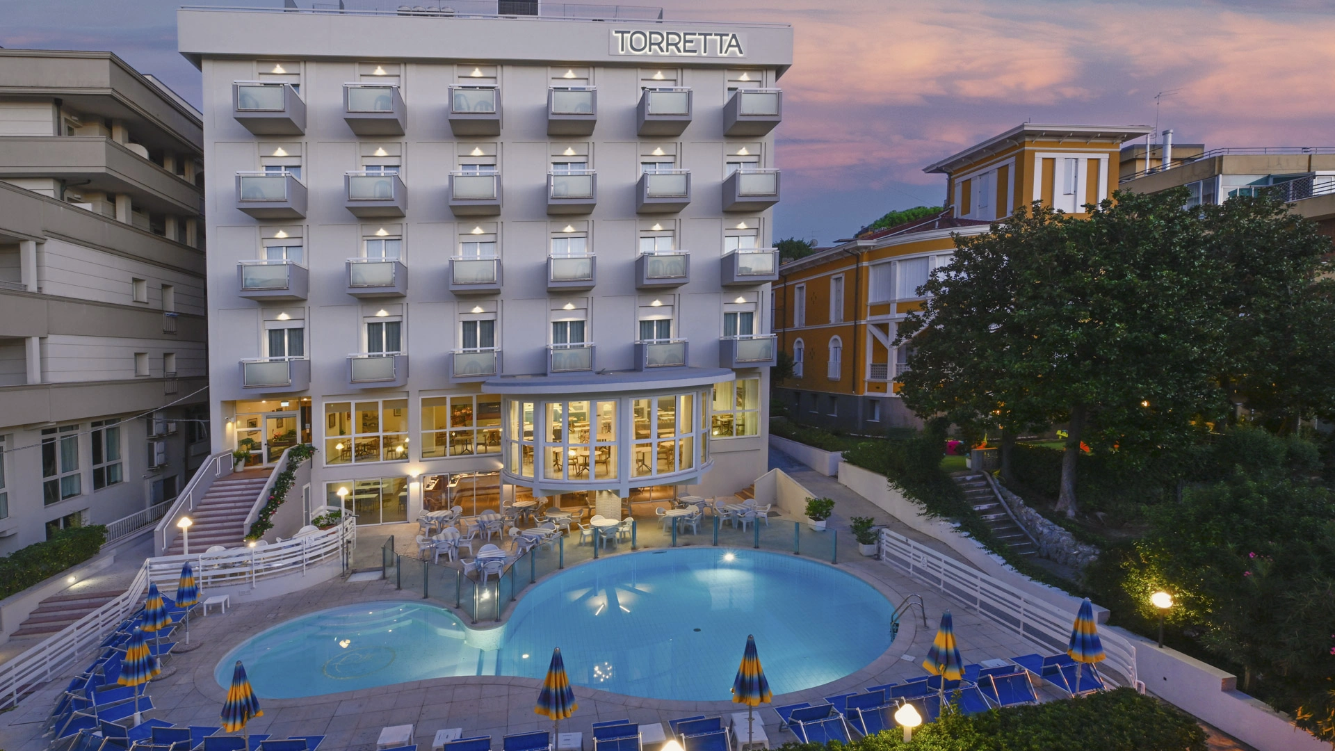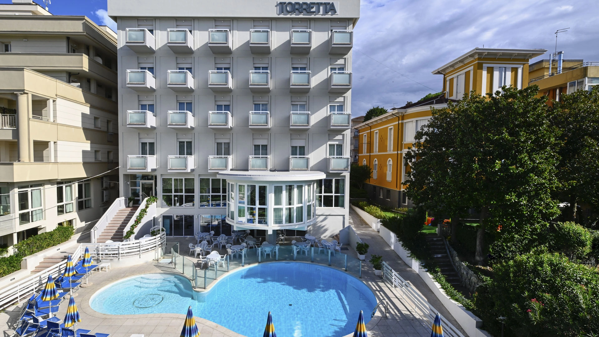 L'Hôtel Résidence Torretta est un hôtel 3 étoiles avec piscine à Cattolica qui comprend une structure hôtelière, une résidence avec 2 types d'appartements de deux pièces et l'historique Villa Frascaroli du début du XXe siècle. Il est idéalement situé entre la mer et le centre, à une courte distance de la plage, du port et de la nouvelle Darsena. Il dispose d'une piscine chauffée à 28-29° avec hydromassage, d'une connexion Wi-Fi gratuite également dans la chambre et d'un grand jardin avec des jeux pour les enfants de moins de 8 ans. Les petits animaux sont acceptés.