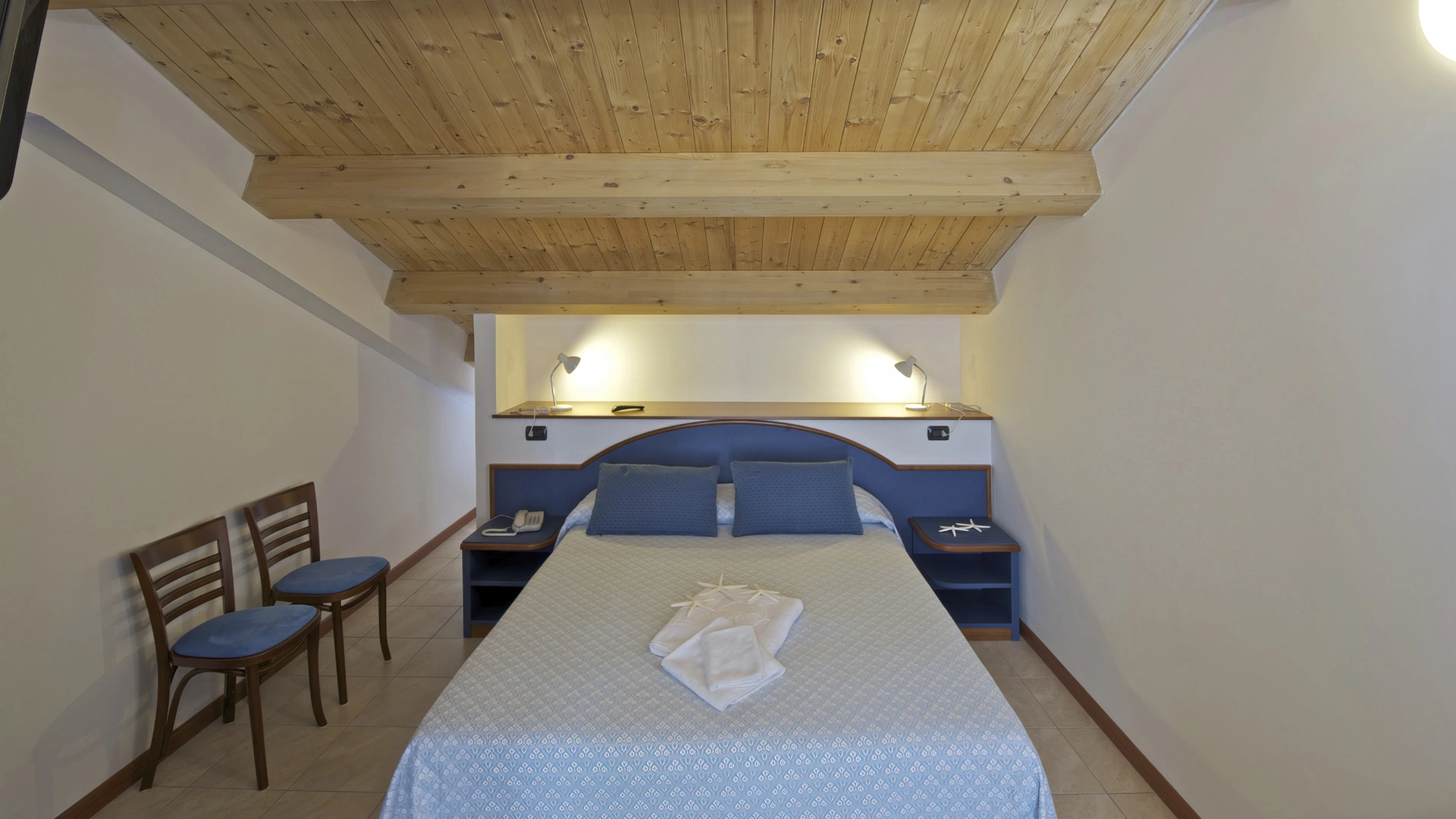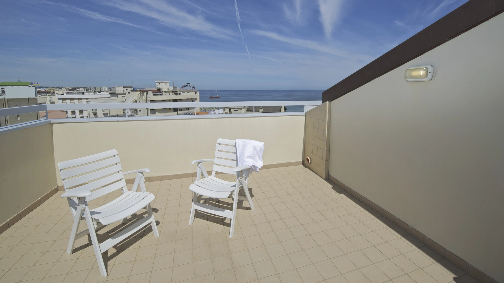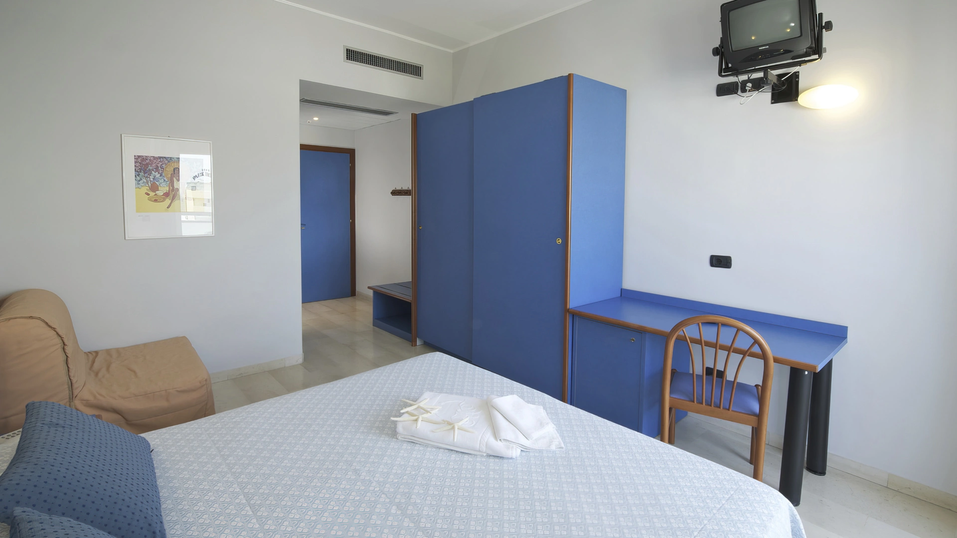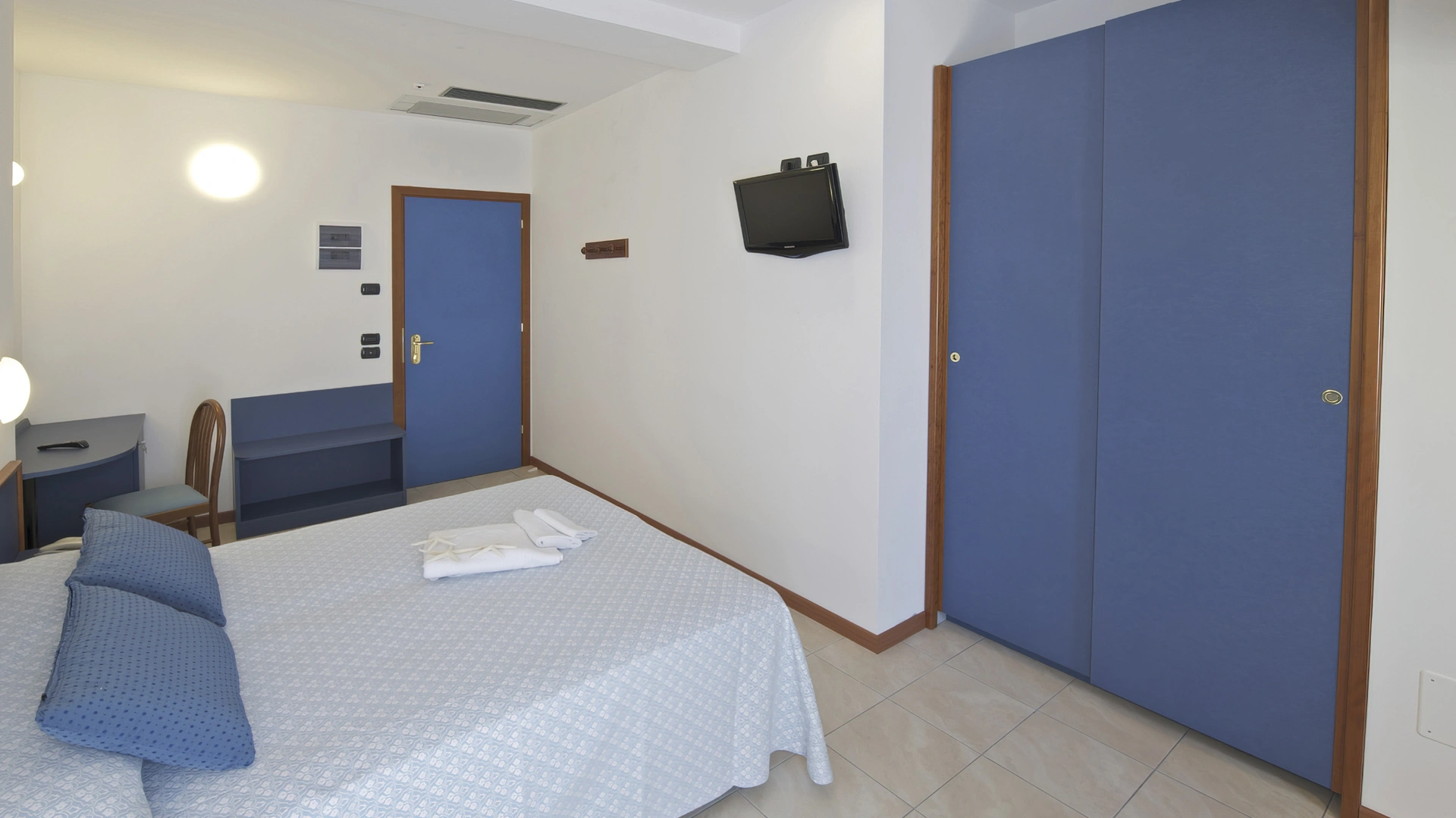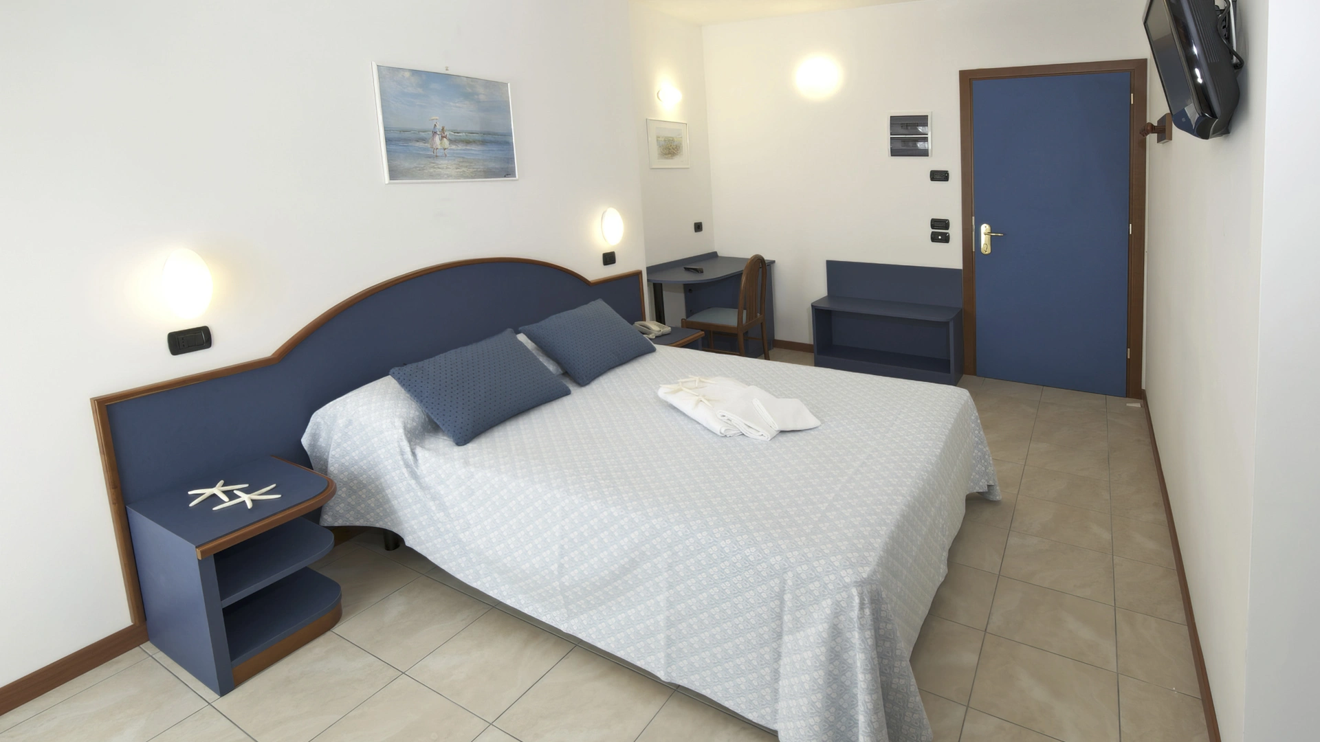 Les chambres récemment rénovées offrent une vue sur la mer, la piscine ou l'intérieur. Elles disposent toutes d'un balcon, d'une climatisation indépendante, d'une télévision avec chaînes Sky, d'une connexion Wi-Fi fibre optique 100 Mbit/s, d'un coffre-fort, d'un téléphone, d'une salle de bain complète avec douche, d'un sèche-cheveux et d'un set de courtoisie. Le minibar n'est pas approvisionné en cours d'utilisation.